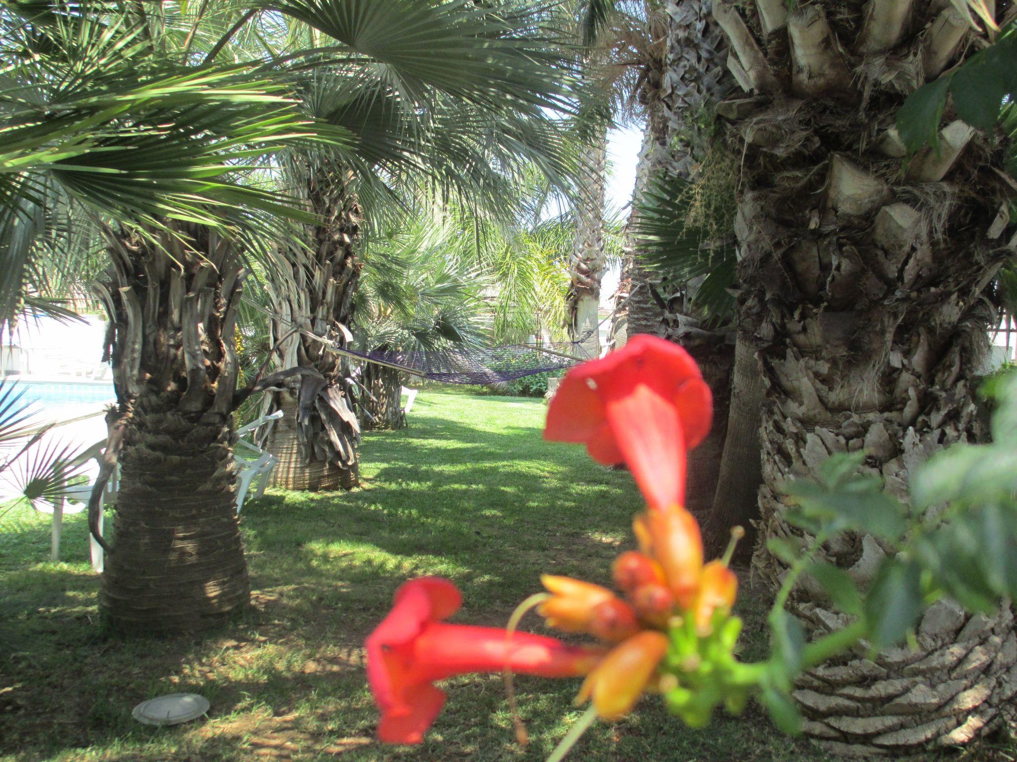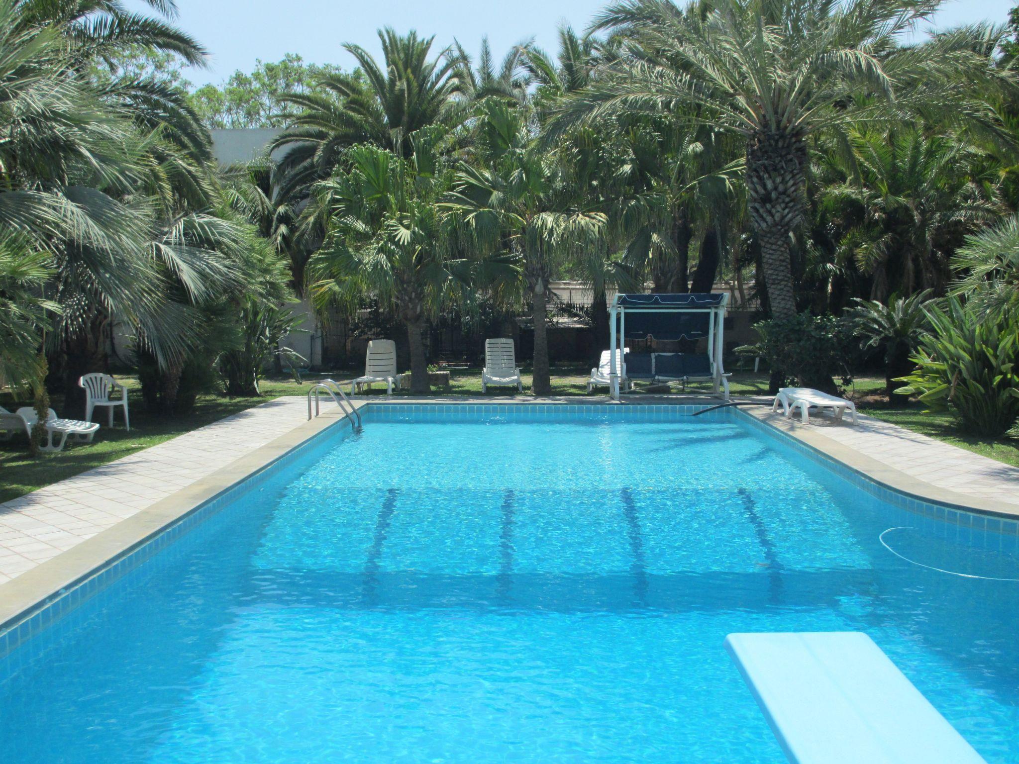 Das im mediterranen Stil errichtete Gebäude ist von zahlreichen Palmen umgeben, die den Swimmingpool für die gemeinsame Nutzung durch die Urlauber einrahmen.