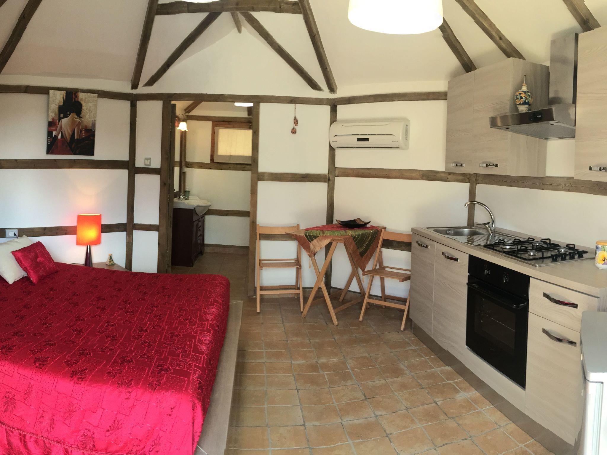Die Ferienhäuser bestehen aus 4 Einheiten (1 Zweizimmer-, 1 Einzimmer- und 2 Dreizimmerwohnungen), die vor einer großen, gepflegten Rasenfläche angeordnet sind, auf der sich eine Freiluftküche mit Grill zur gemeinsamen Nutzung befindet. Zu den Annehmlichkeiten gehören: Swimmingpool (Maße 15*8*3,5 m), kostenloses Wi-Fi-Internet, Privatparkplatz, Frühstück auf Anfrage.