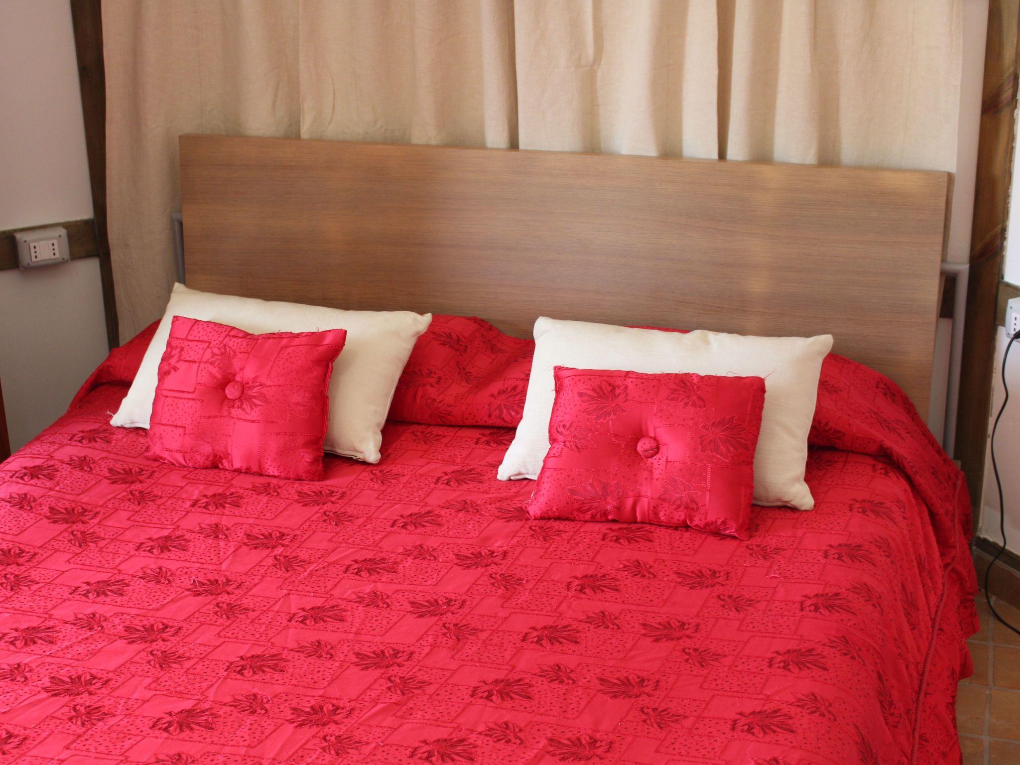 Im Inneren ist die Hütte komfortabel und hochwertig eingerichtet und verfügt über jeglichen Komfort in einem Raum: ein großes Doppelbett, eine gut ausgestattete Küche, Schränke und Nachttische, TV, Klimaanlage und ein großes Bad mit Dusche. Insgesamt hat sie also etwa 33 Quadratmeter.