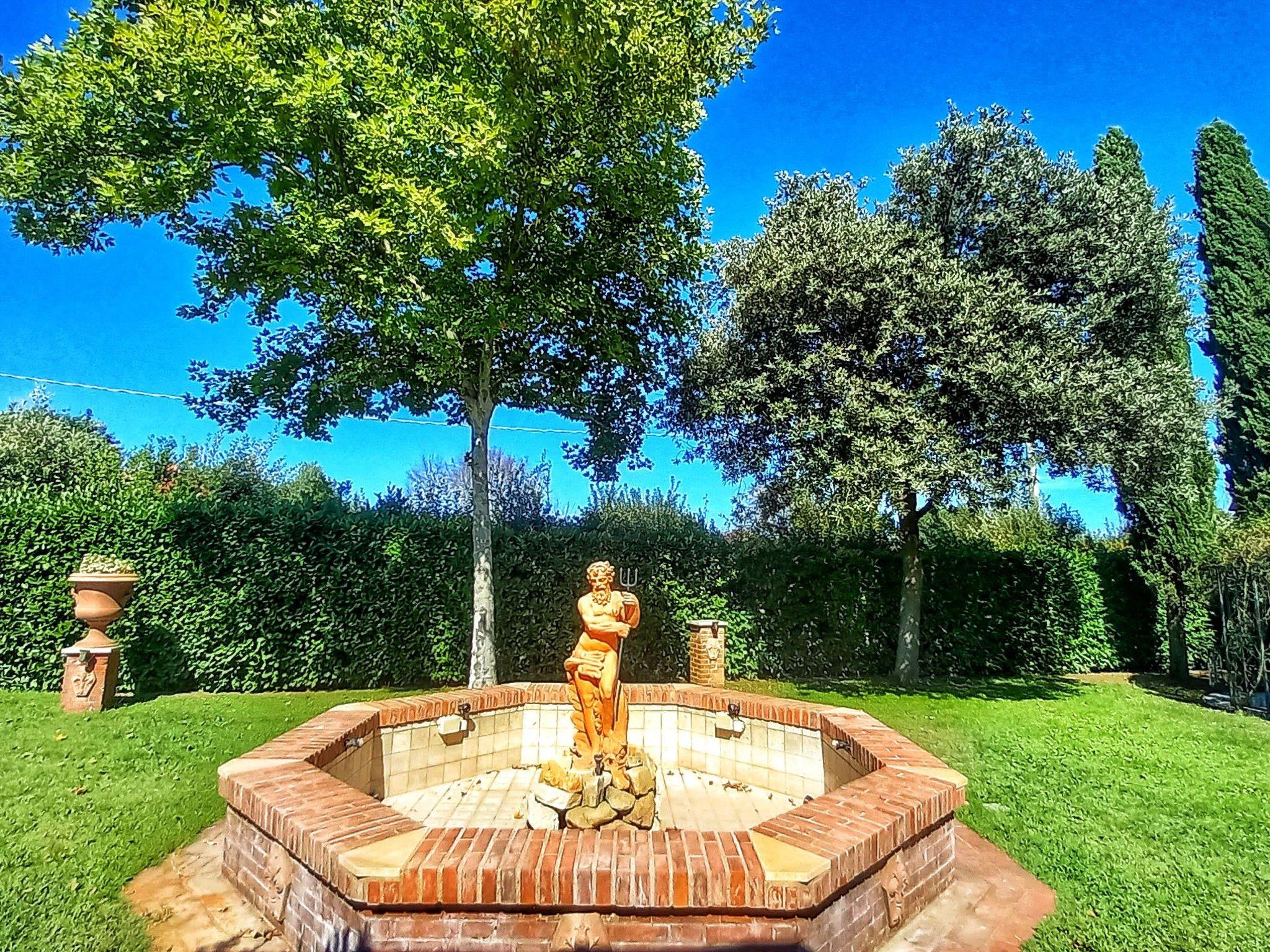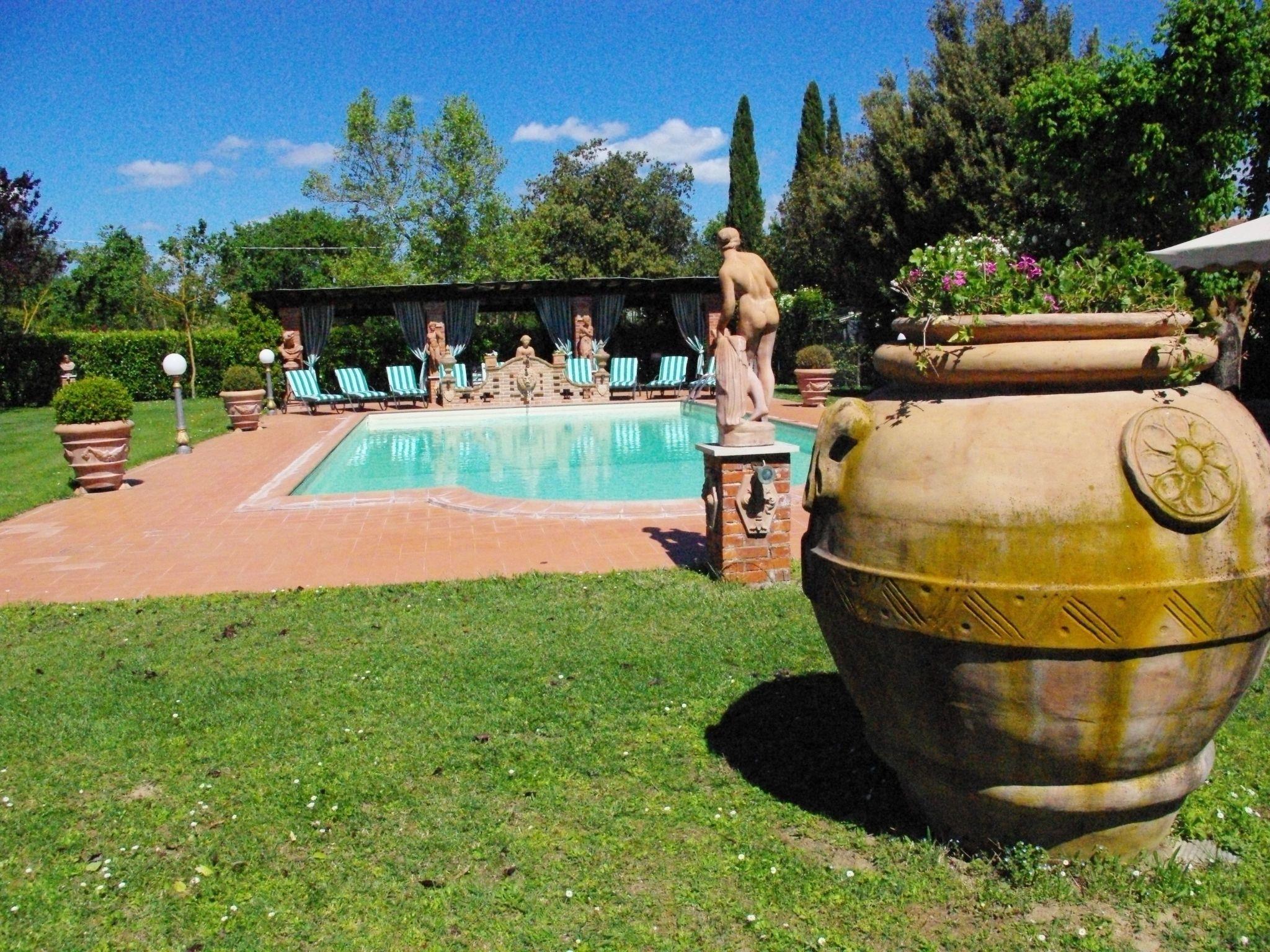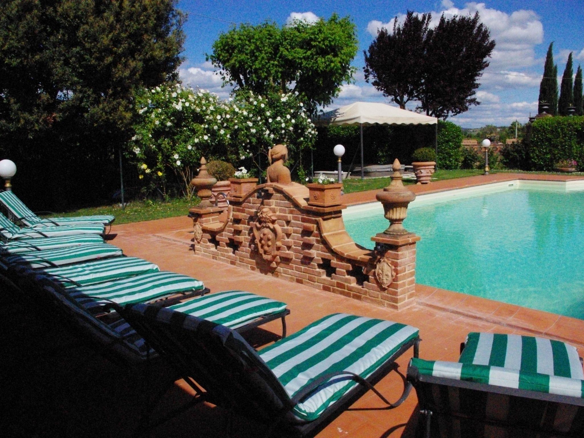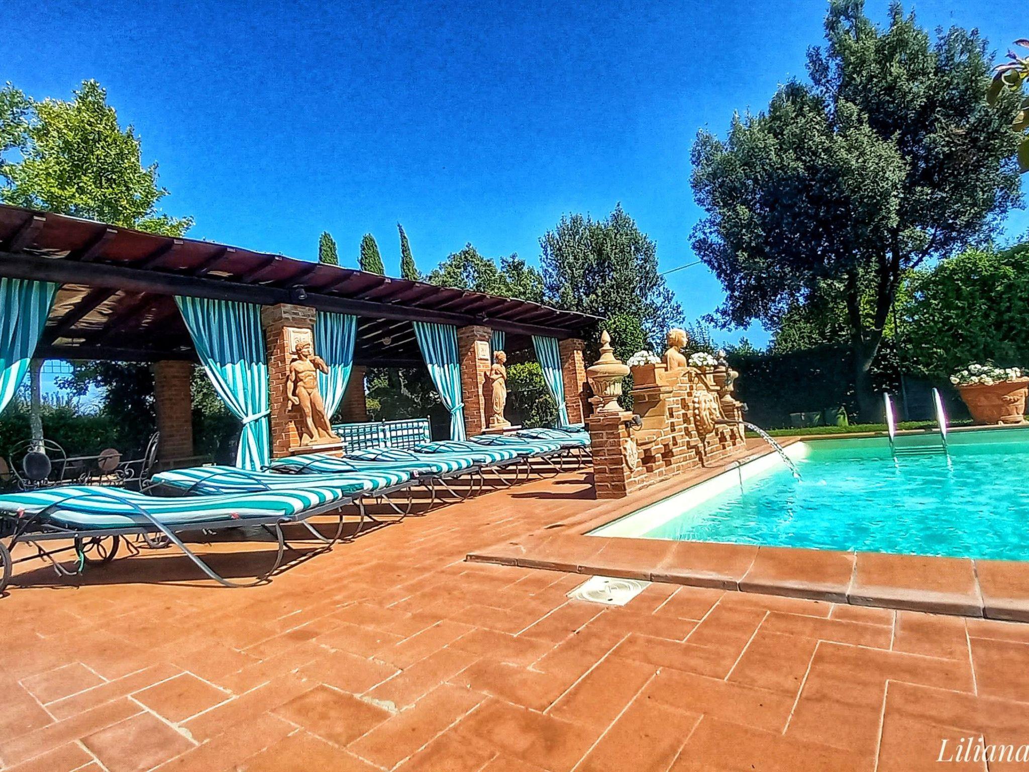 Diese fabelhafte Villa in der Provinz Arezzo lädt die Gäste ein, sich in der Natur der toskanischen Landschaft zu entspannen und zu erholen, die von grünen Hügeln, goldenem Sonnenschein, hervorragendem Wein und einer einzigartigen Küche geprägt ist. Die Gäste können einen Transfer vom und zum Flughafen, Führungen, Mahlzeiten, Kochkurse und andere Aktivitäten wie Angeln, Golf, Reiten, Mountainbiking und vieles mehr buchen. Die Villa wurde 1921 erbaut und hat im Laufe der Jahre einige Renovierungen und Erweiterungen erfahren, um allen modernen Komfort zu bieten. Direkt vor der Villa befindet sich der schöne Swimmingpool, der von klassischen italienischen Gärten und Skulpturen umgeben ist. Neben dem Pool gibt es zwei Grillplätze, einen Whirlpool mit 6 Plätzen und eine finnische Sauna mit 8 Plätzen, die das ganze Jahr über exklusiv von den Gästen genutzt werden können, sowie zahlreiche Pavillons und Liegestühle. Außerdem gibt es einen großen achteckigen Springbrunnen und einen weiteren Pavillon mit Tisch und Stühlen. Auf dem Grundstück befinden sich außerdem eine Tischtennisplatte, ein Tischfußball oder Kicker, Fitnessgeräte, 7 Mountainbikes für Erwachsene und 4 Mountainbikes für Kinder, die von den Gästen frei genutzt werden können, sowie ein Kinderspielplatz. Die Villa ist durch eine 26 cm hohe vertikale Trennwand aus Vollziegeln in zwei große Wohnungen mit drei Schlafzimmern unterteilt, von denen eine vom Eigentümer bewohnt wird, der über ein eigenes Einfahrtstor und eine eigene Tür verfügt, um den Gästen ein Höchstmaß an Privatsphäre zu gewährleisten, die den gesamten Garten, das Schwimmbad, die Sauna und den Whirlpool exklusiv nutzen können.