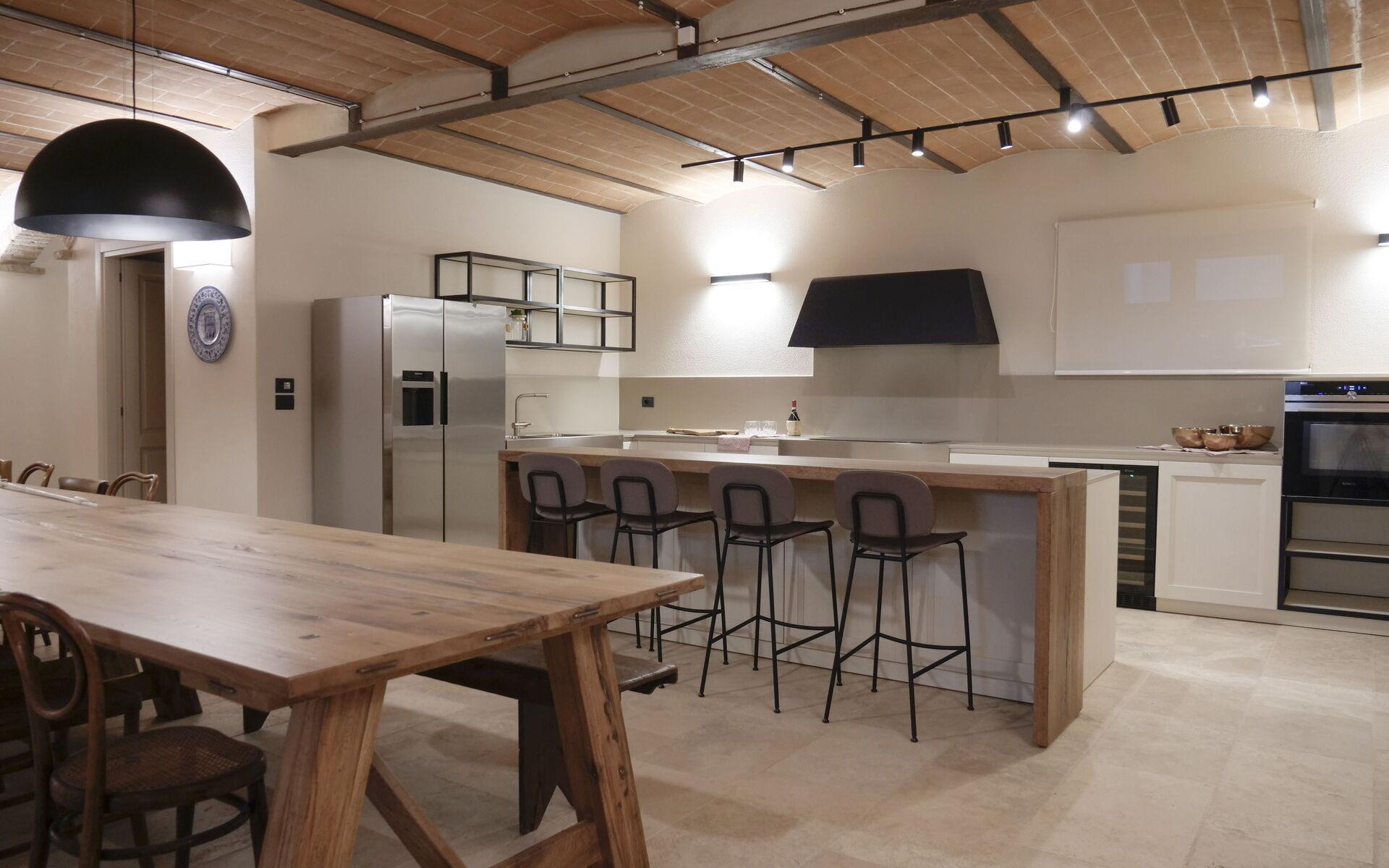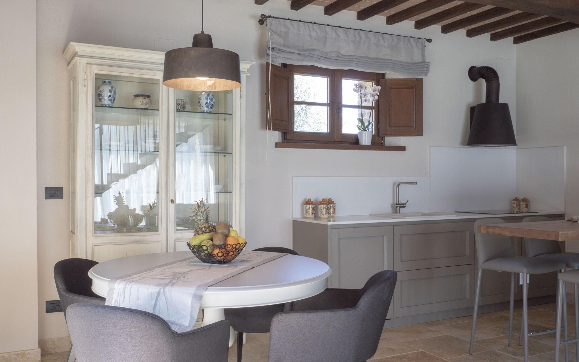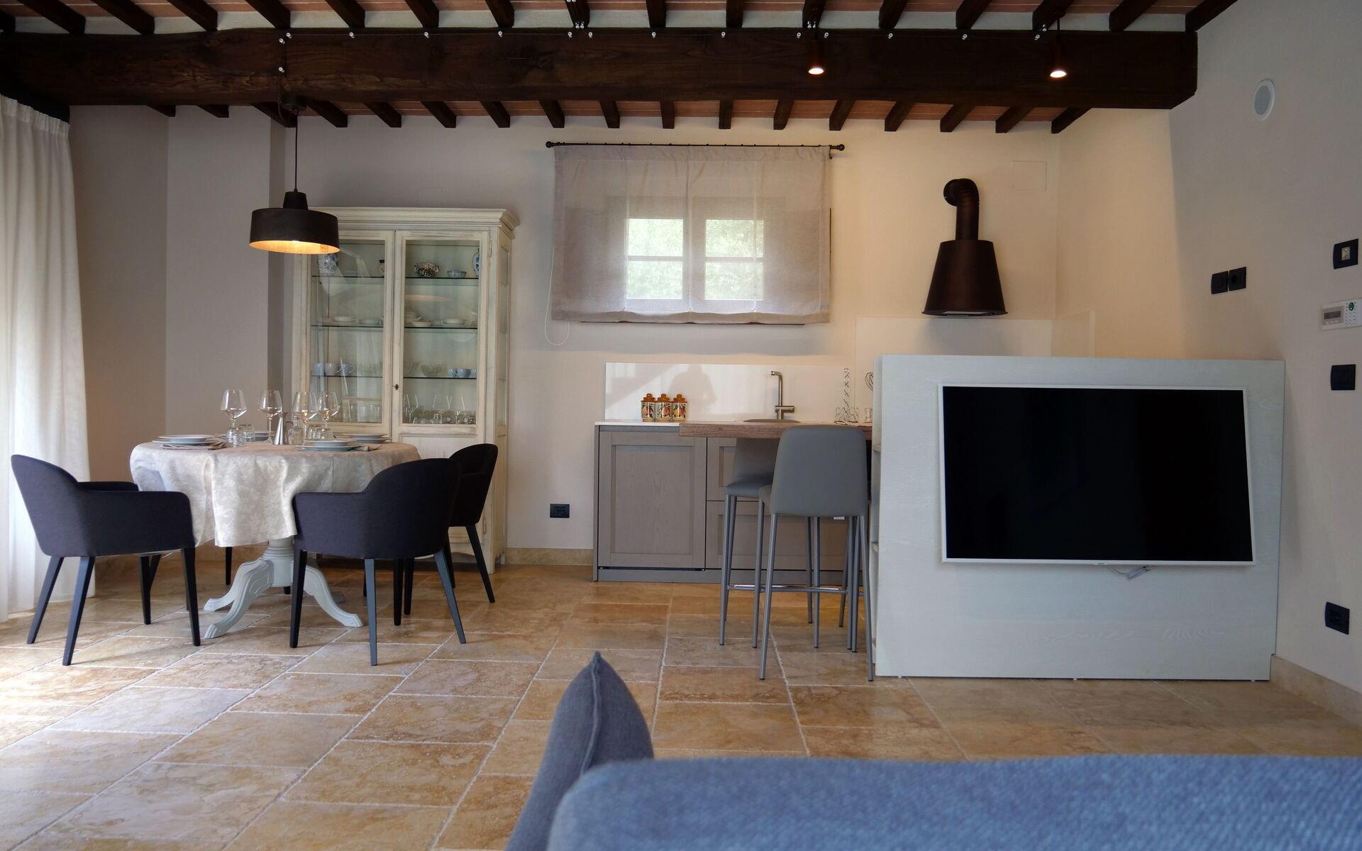 Die Hauptvilla erstreckt sich über drei Ebenen: Im Erdgeschoss befinden sich der Eingang, eine große Küche mit allem, was man zum Kochen braucht, ein Wohnzimmer und ein Badezimmer. Im ersten Stock gibt es 5 Doppelzimmer, alle mit eigenem Bad und Kühlschrank. Das letzte Stockwerk ist ein Untergeschoss, in dem sich eine zweite voll ausgestattete Küche, ein Wohnzimmer mit Billardtisch und ein Wohnbereich mit einer Ausstellung typisch toskanischer handwerklich hergestellter Salami befinden. Hier können auch Verkostungen von Weinen und typischen Produkten vor Ort angefragt werden (nach Absprache mit dem Eigentümer). Ein Gästebad vervollständigt diese Etage.