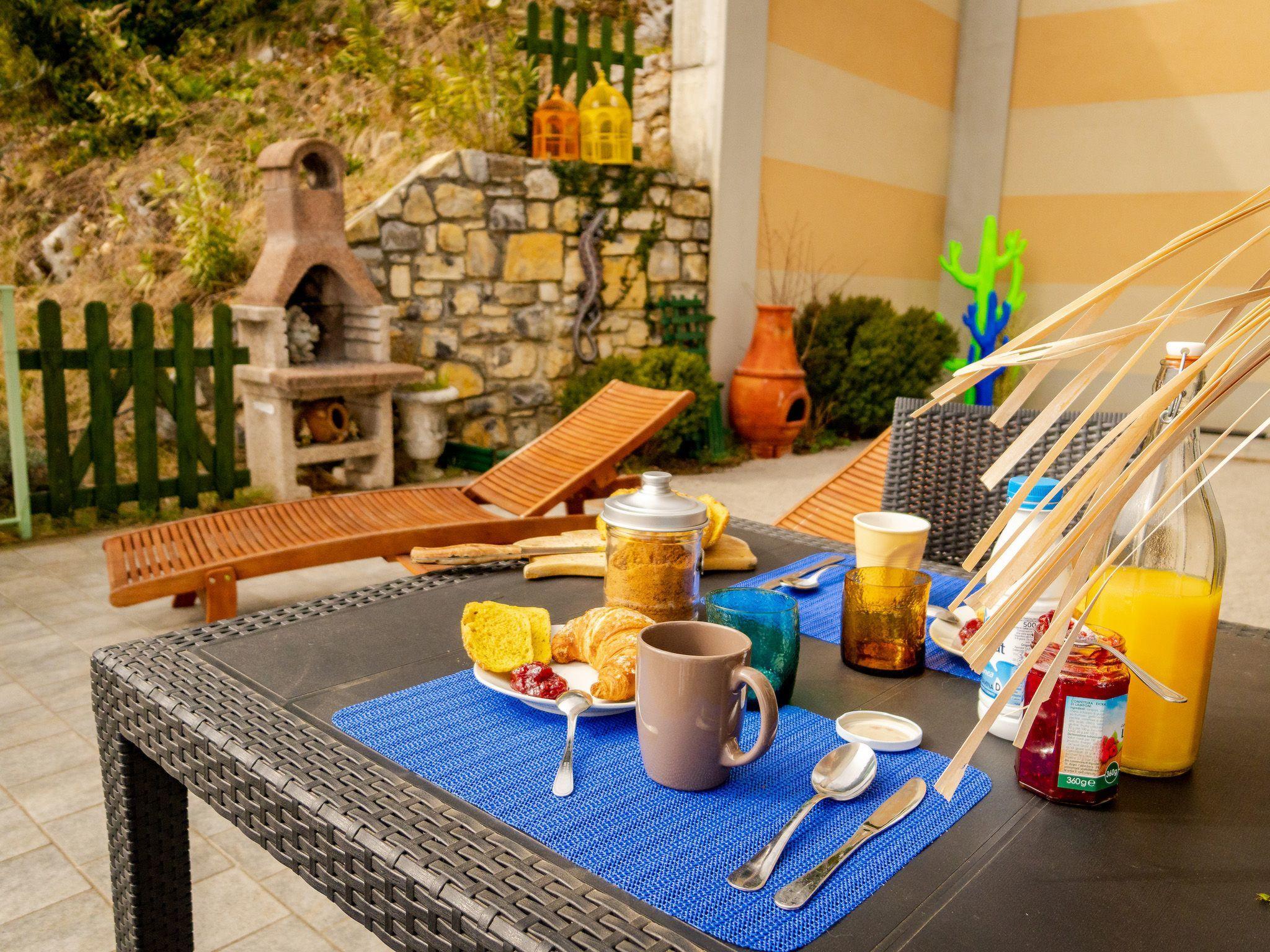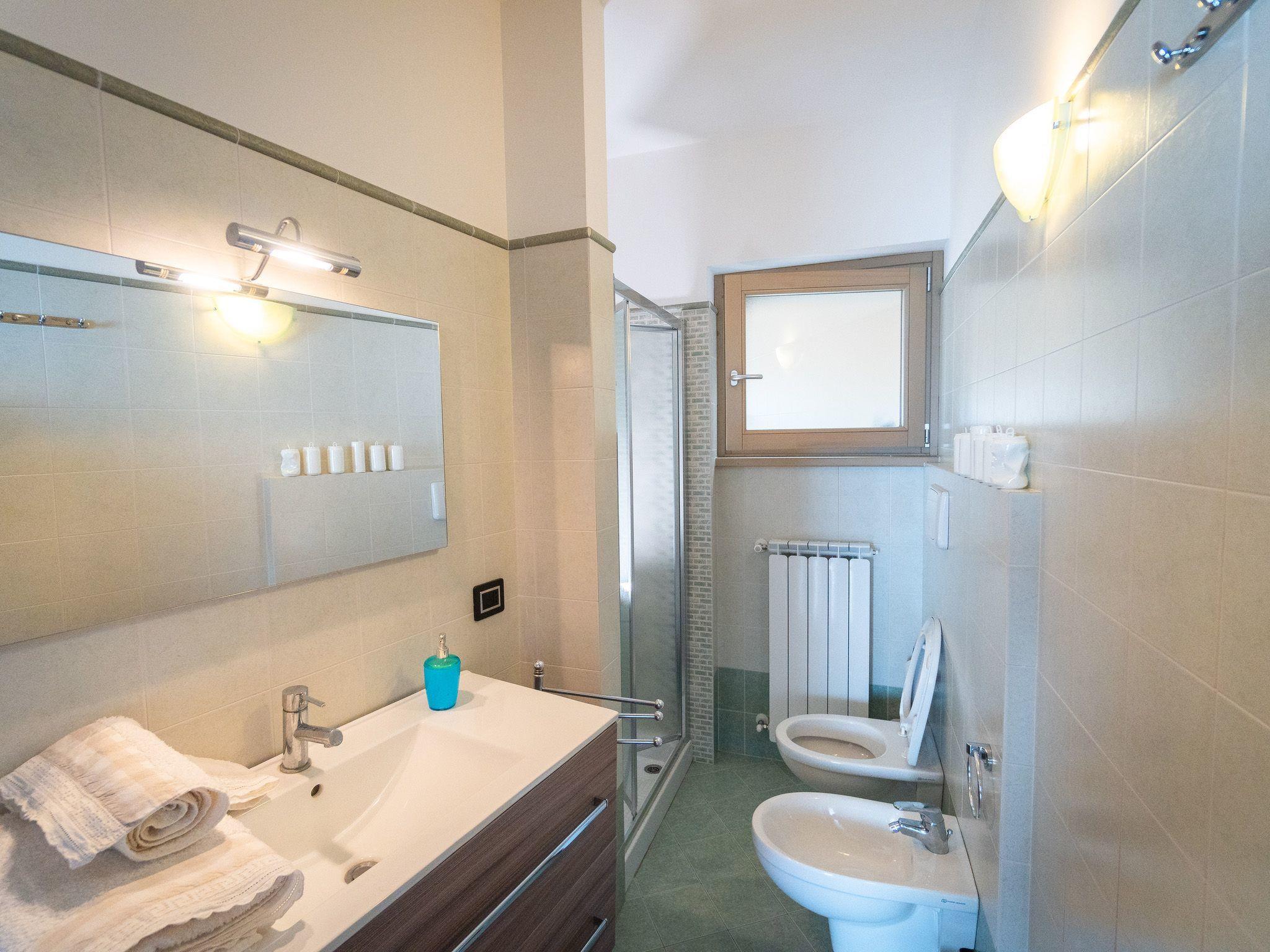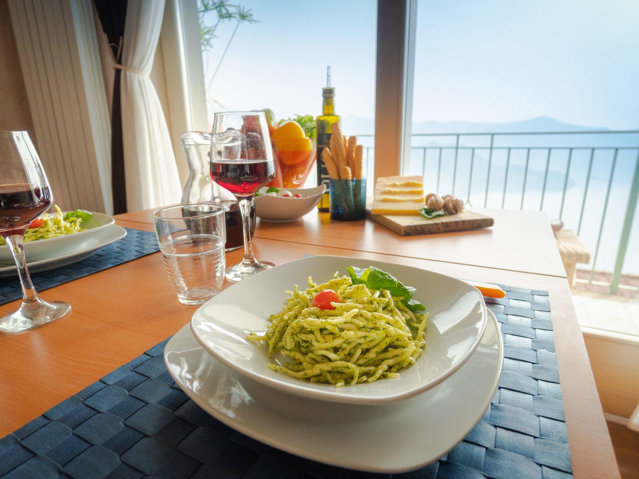 Draußen ist der Garten mit einem gemauerten Grill, einem Entspannungstisch und zwei aufeinander abgestimmten Liegestühlen mit elektrischem Sonnenschirm ausgestattet, der die gesamte Veranda bedecken kann; innen in einem abgewohnten umfeld verfügt das wohnzimmer über einen großen kühlschrank mit gefrierfach, Einbauküche mit Induktionsherd, Backofen, Mikrowelle, Toaster, Wasserkocher und Mokka, ein schlafsofa und einen tisch mit Panoramablick aus dem großen Fenster; Es gibt eine Waschmaschine. Das Hauptschlafzimmer ist gut ausgestattet mit Kleiderschränken und Nachttischen und zeichnet sich durch das lebhafte Blau der Wand hinter dem Bett aus. Im Badezimmer hängen die Sanitärarmaturen, die Heizung erfolgt über Radiatoren. Es gibt eine große Garage mit Aufzug zum Boden.
