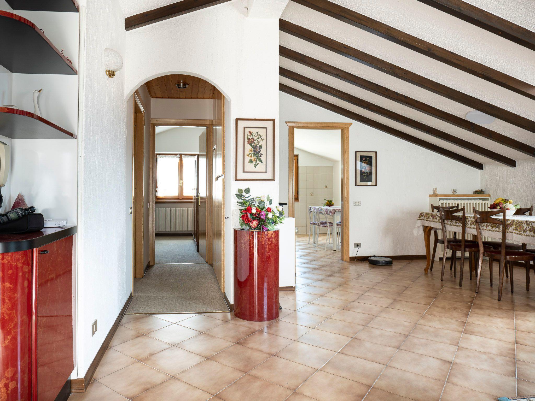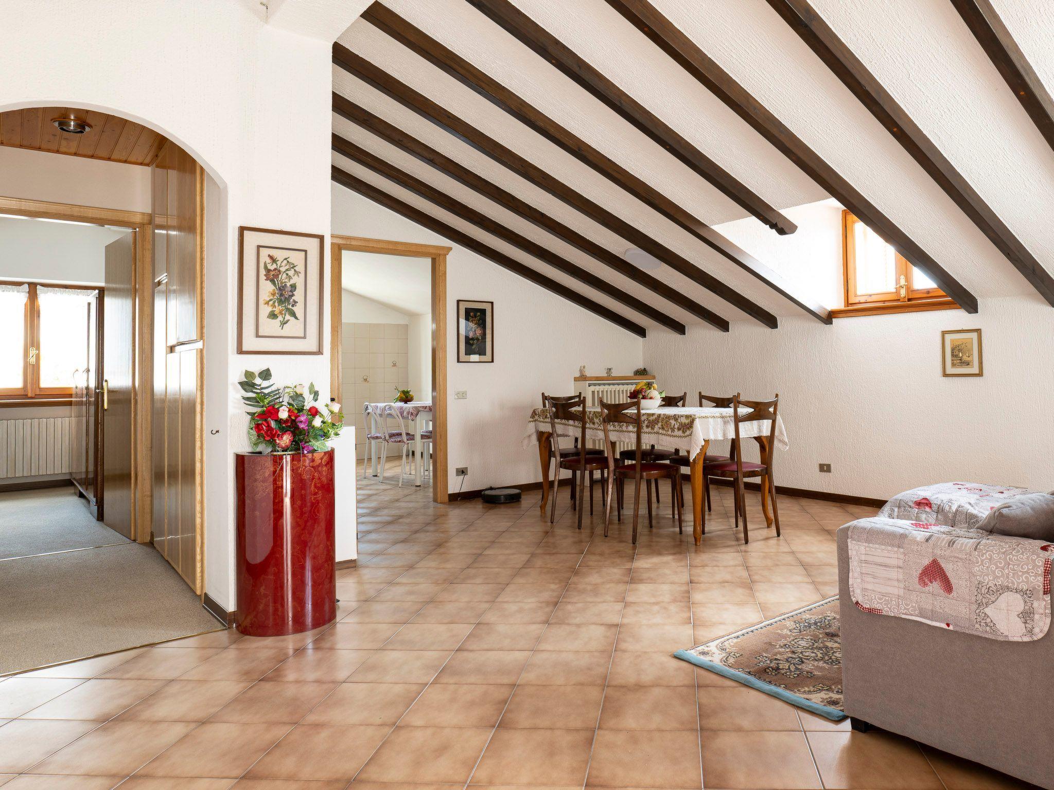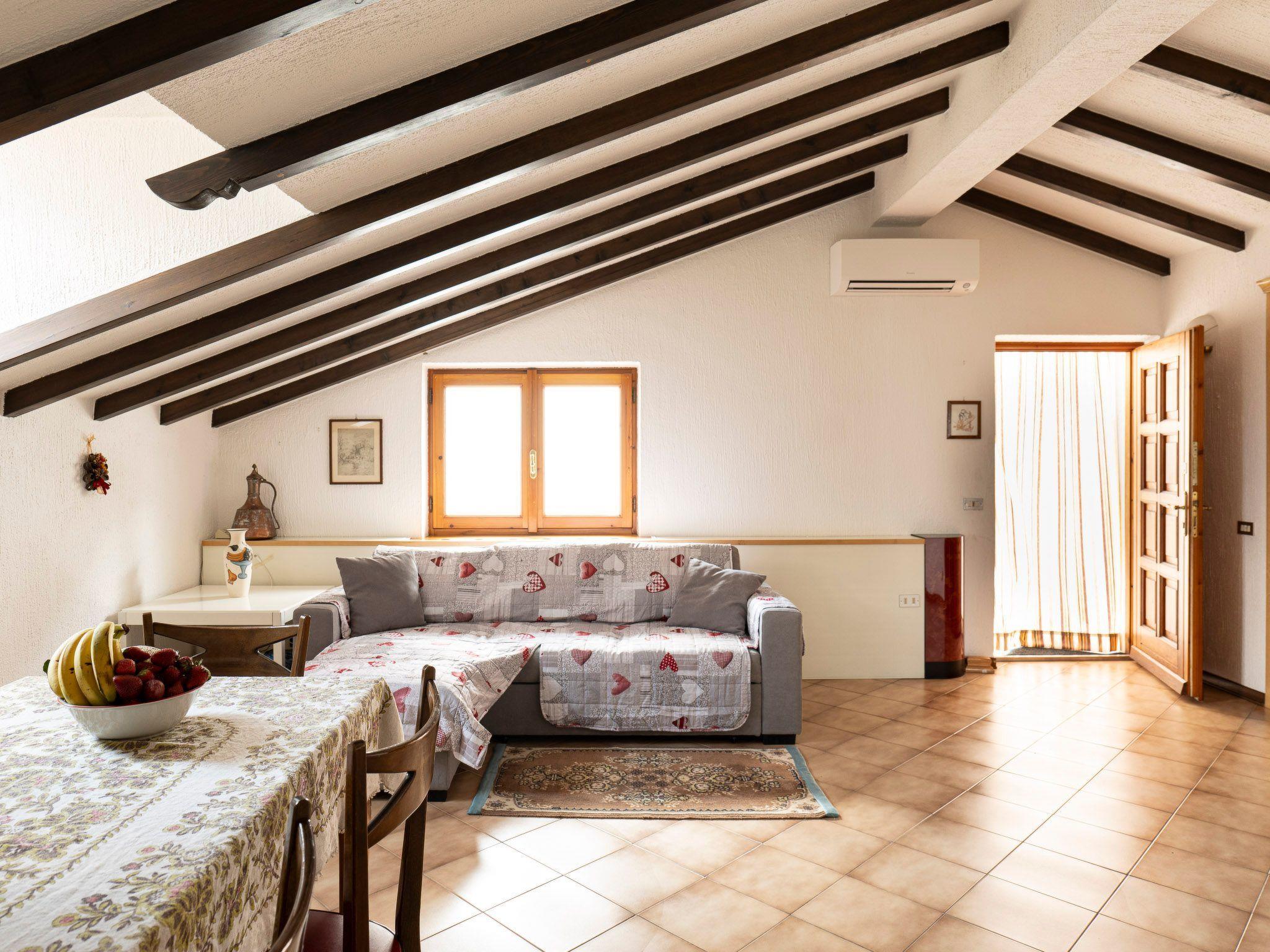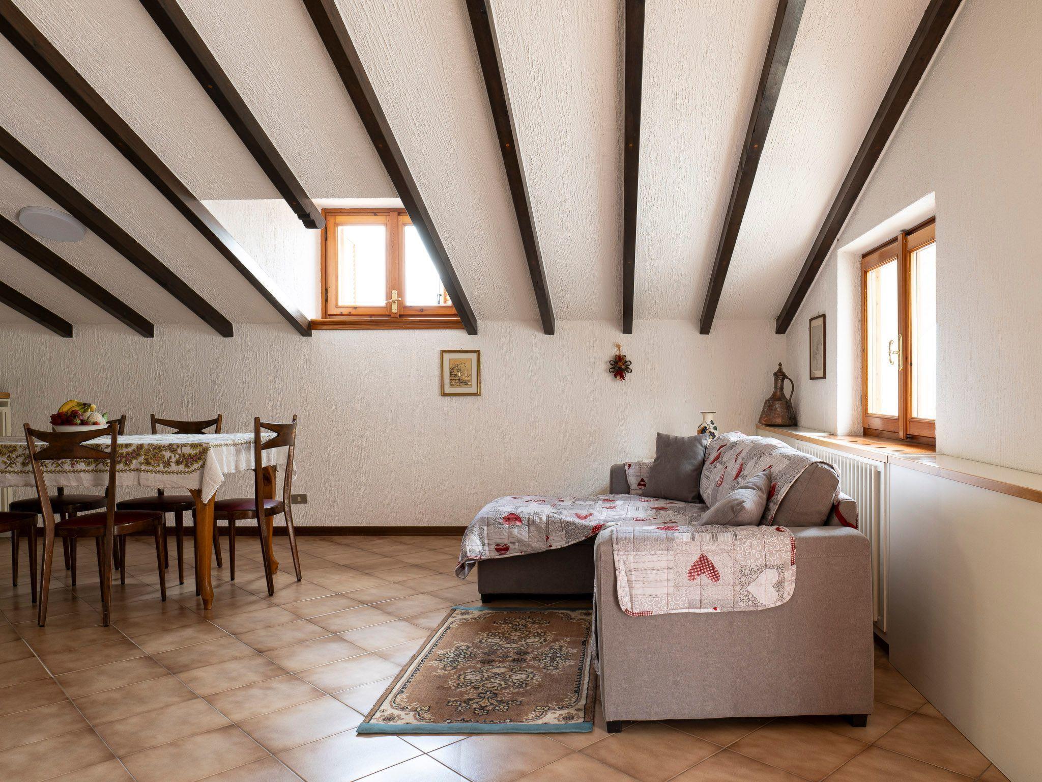 Die Dreizimmerwohnung Gioia del Verde befindet sich in der Gemeinde Tavernola Bergamasca, mit Blick auf die bergamasker Seite des Iseosees, direkt gegenüber von Montisola, in einem kleinen Gebäude in dem Teil des Dorfes, der hinter ihm den Hügel hinaufgeht. Es handelt sich um eine Mansarde mit schrägem Dach und sichtbaren Balken, die auch im untersten Teil eine gute Höhe hat und durch Dachgauben und Fenster Licht erhält.