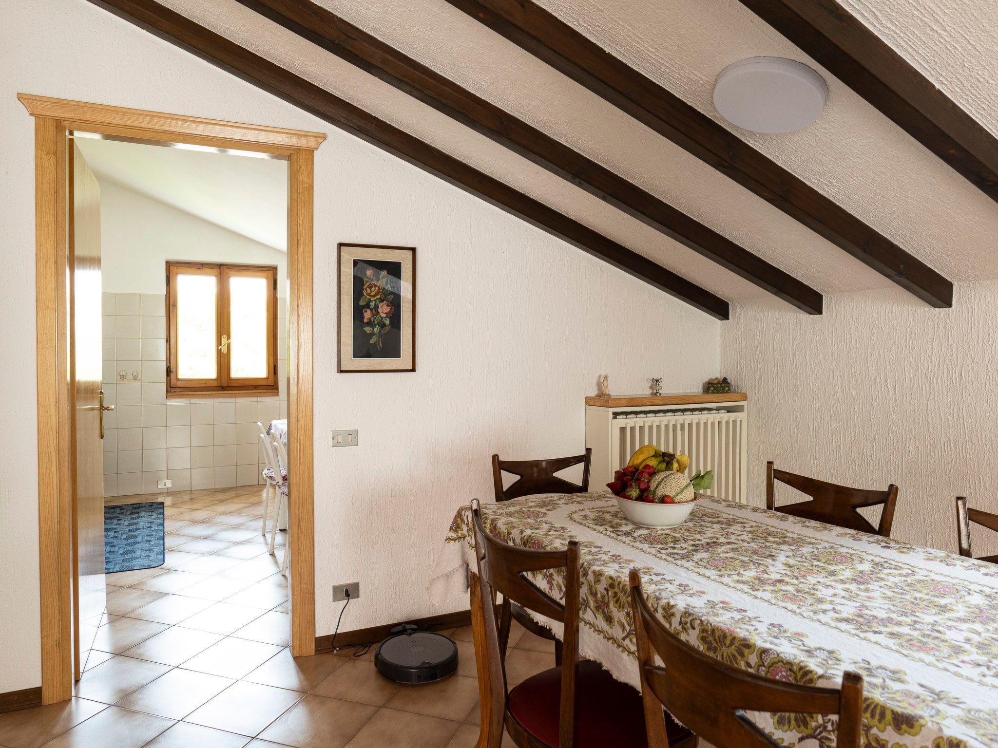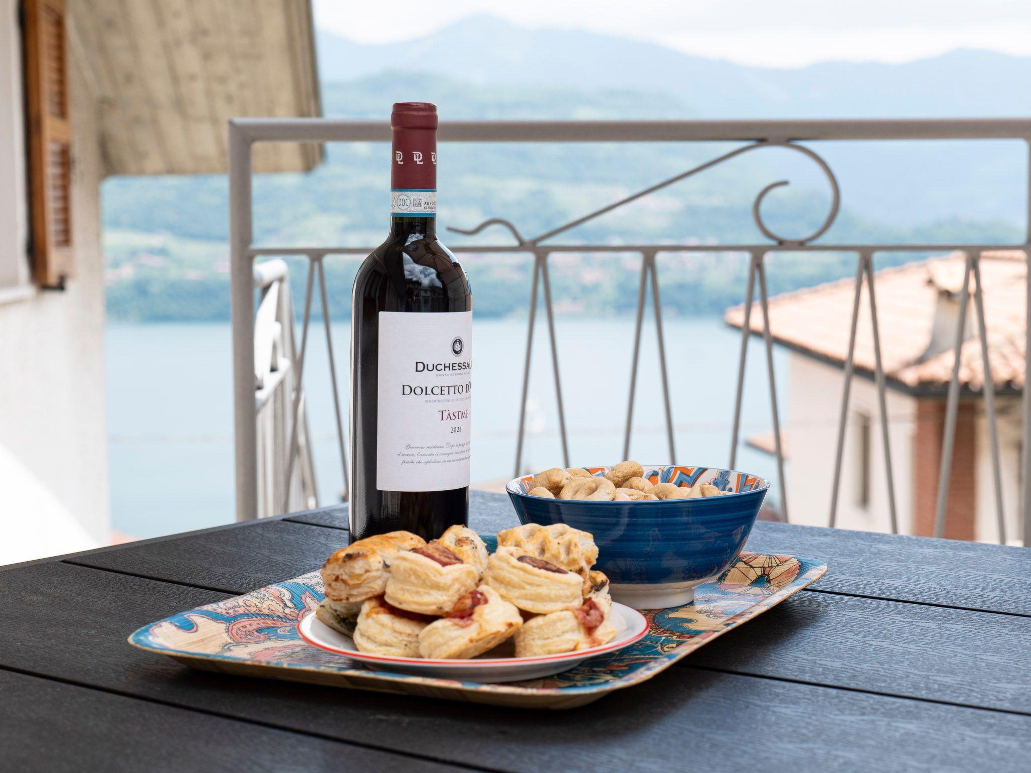 Das mit traditionellen Holzmöbeln eingerichtete Ferienhaus Gioia del Verde hat eine Wohnfläche von 100 m2 und verfügt über eine große Terrasse mit Tisch, Sonnenschirm und Stühlen, auf der man frühstücken oder zu Mittag essen kann, während man den See bewundert, der durch die Dächer hindurchschaut.