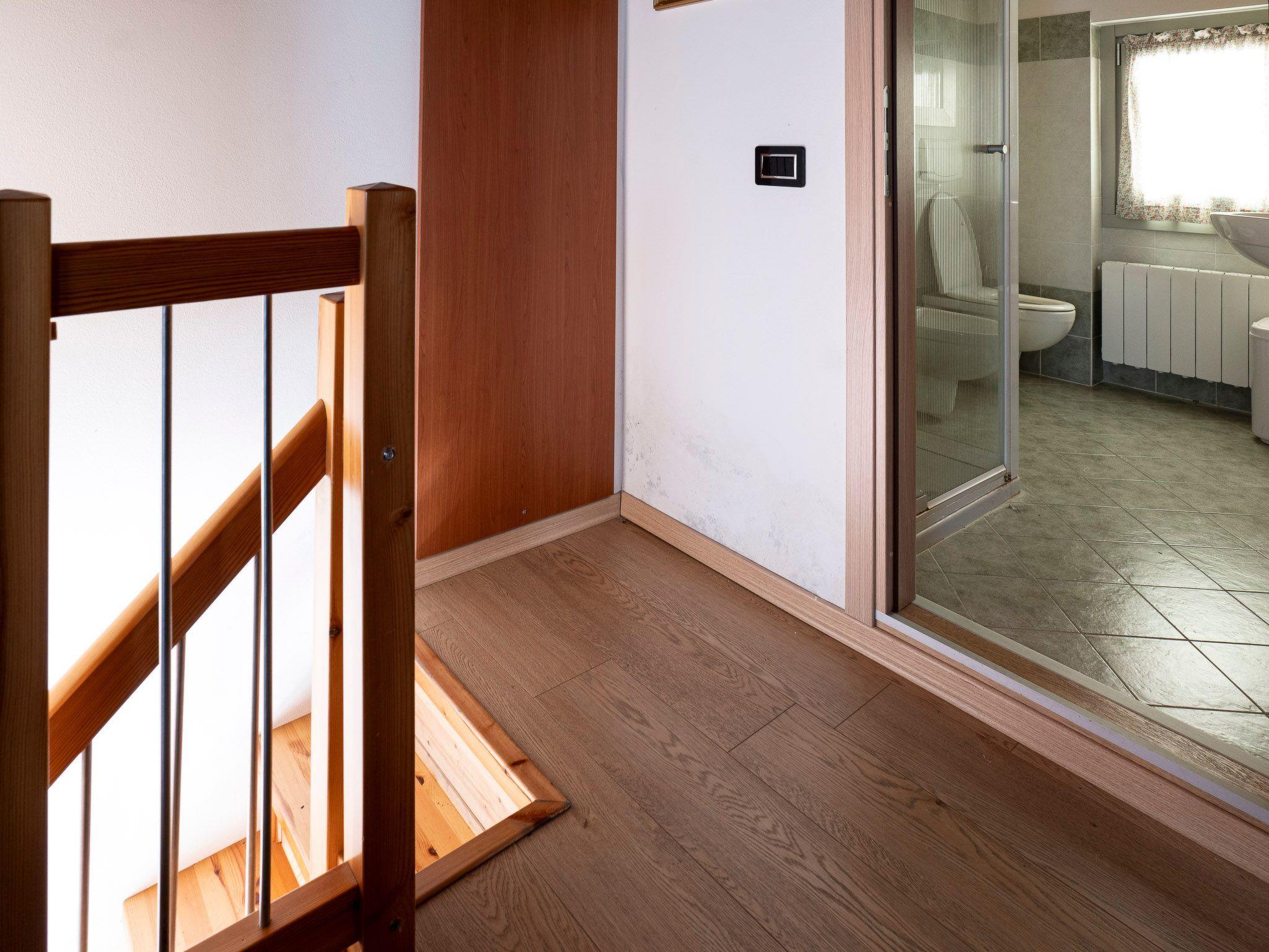 Im Erdgeschoss finden wir also einen Wohnbereich mit roten Ledersofas und Fernseher, einen bequemen Esstisch für sechs Personen und eine Wandküche mit Induktionskochfeld, Backofen, Geschirrspüler und natürlich Kühl- und Gefrierschrank. Das Badezimmer auf dieser Etage ist mit einer Waschmaschine und einer Badewanne ausgestattet und es gibt auch einen Kleiderschrank. Die Decken sind mit sichtbaren Holzbalken versehen und eine Treppe, ebenfalls aus Holz, führt in den zweiten Stock, wo sich das Schlafzimmer mit Doppelbett, mit Kleiderschrank und Spiegeln und einer Fenstertür, die auf einen weiteren kleinen Balkon führt, und das Schlafzimmer mit den drei Einzelbetten befinden. Beide Zimmer haben Parkettboden, sind mit Schränken und Spiegeln ausgestattet und verfügen über Tageslicht. Die Decken, ebenfalls aus Holz und mit sichtbaren Balken, sind hier schräg, behalten aber überall eine gute Höhe. Das Badezimmer mit Dusche in der zweiten Etage schließt die Zimmerparade ab.