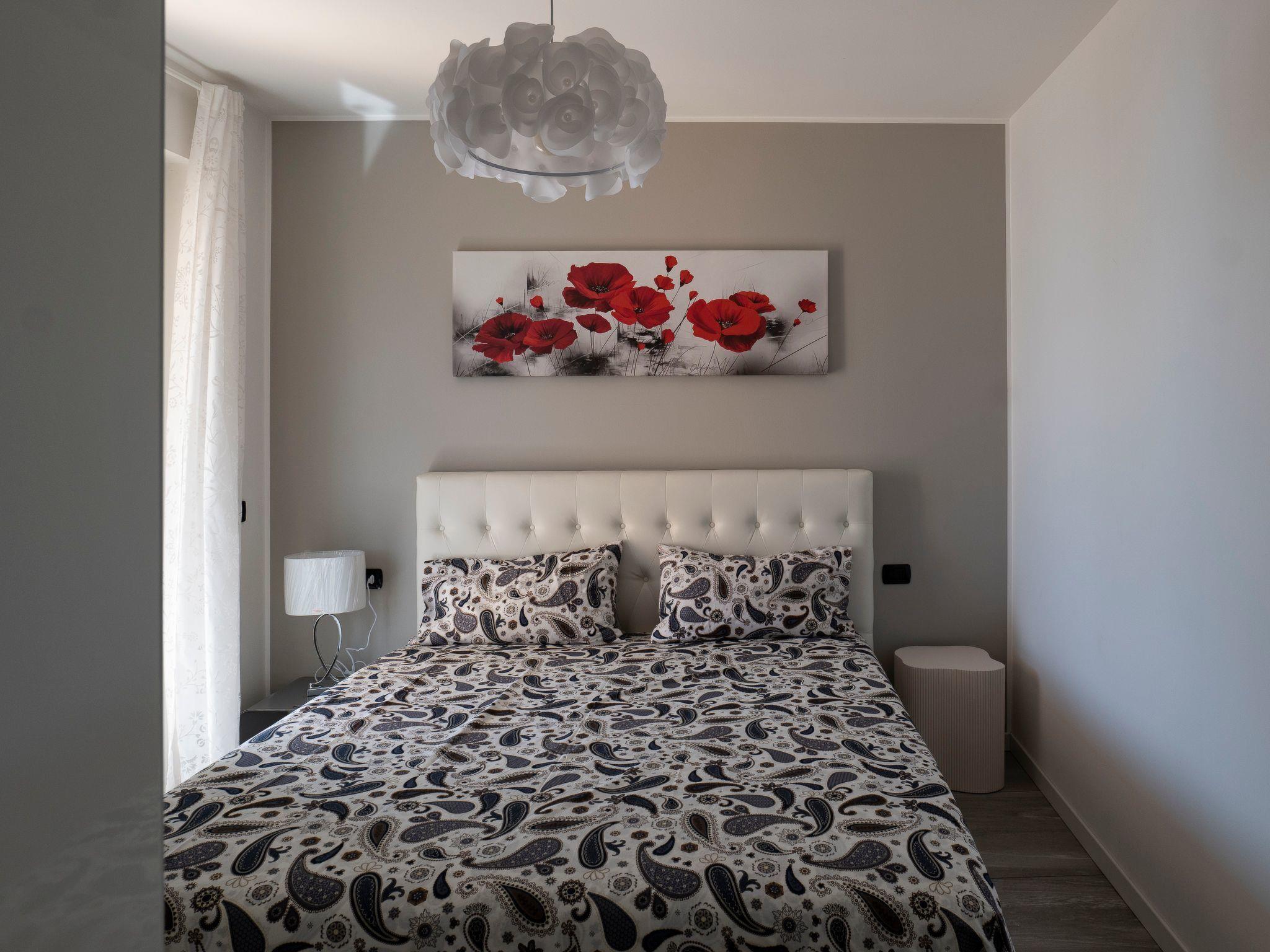 Das Badezimmer ist groß und komplett: Neben den wandhängenden Armaturen - Waschbecken, Toilette und Bidet - gibt es eine Duschkabine und eine Waschmaschine. Das Schlafzimmer ist ein gemütliches und erholsames Zimmer: es ist dank der Fenstertür mit Blick auf die Terrasse auch sehr hell und verfügt über ein Doppelbett und deckenhohe Schränke. Die Split-Klimaanlage ist auch hier vorhanden. Der Bodenbelag der gesamten Wohnung besteht aus großen Platten aus Feinsteinzeug in den typischen melierten Farben des Travertins. Lights on the Lake ist mit W-Lan ausgestattet.