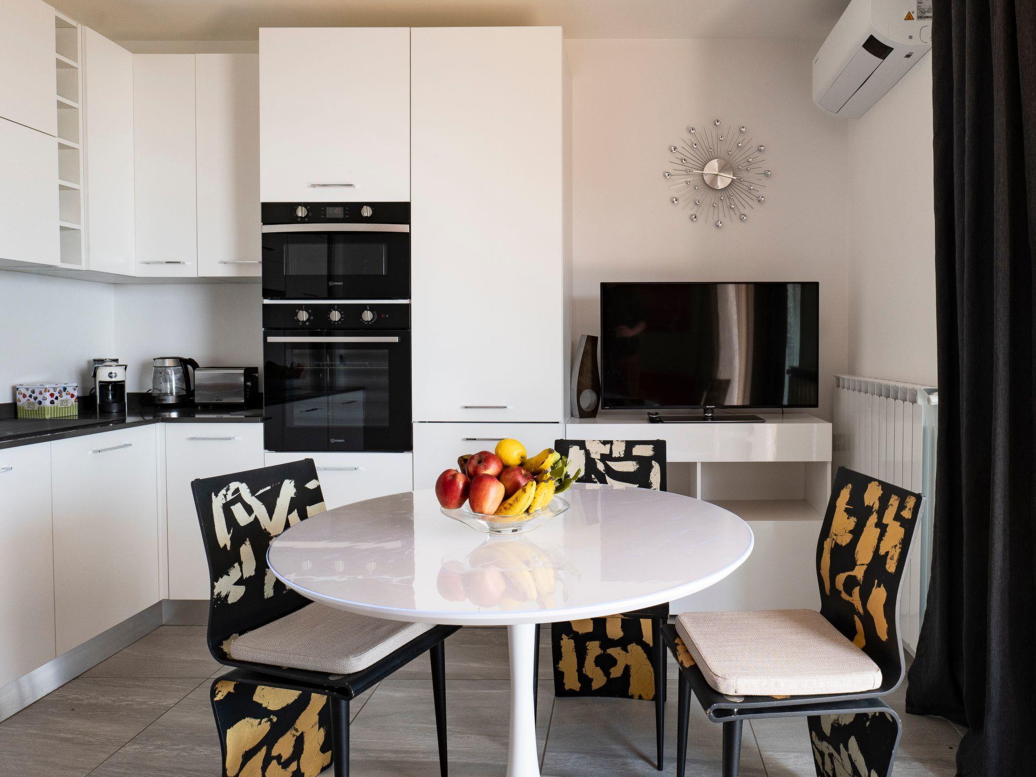 Das Wohnzimmer wird von der weißen Küchenzeile dominiert: modern und perfekt ausgestattet mit Induktionskochfeldern, Elektroherd und eingebauter Mikrowelle, Kühlschrank, Gefrierschrank und Spülmaschine sowie einer Kaffeemaschine. Gleich dahinter - gegenüber dem großen Fenster - befindet sich der Wohnbereich mit Esstisch und Sofa gegenüber dem Smart-TV. In diesem Raum befindet sich auch eine Split-Klimaanlage, die das gesamte Haus kühlen kann (die Heizung erfolgt über die Heizkörper in jedem Zimmer).