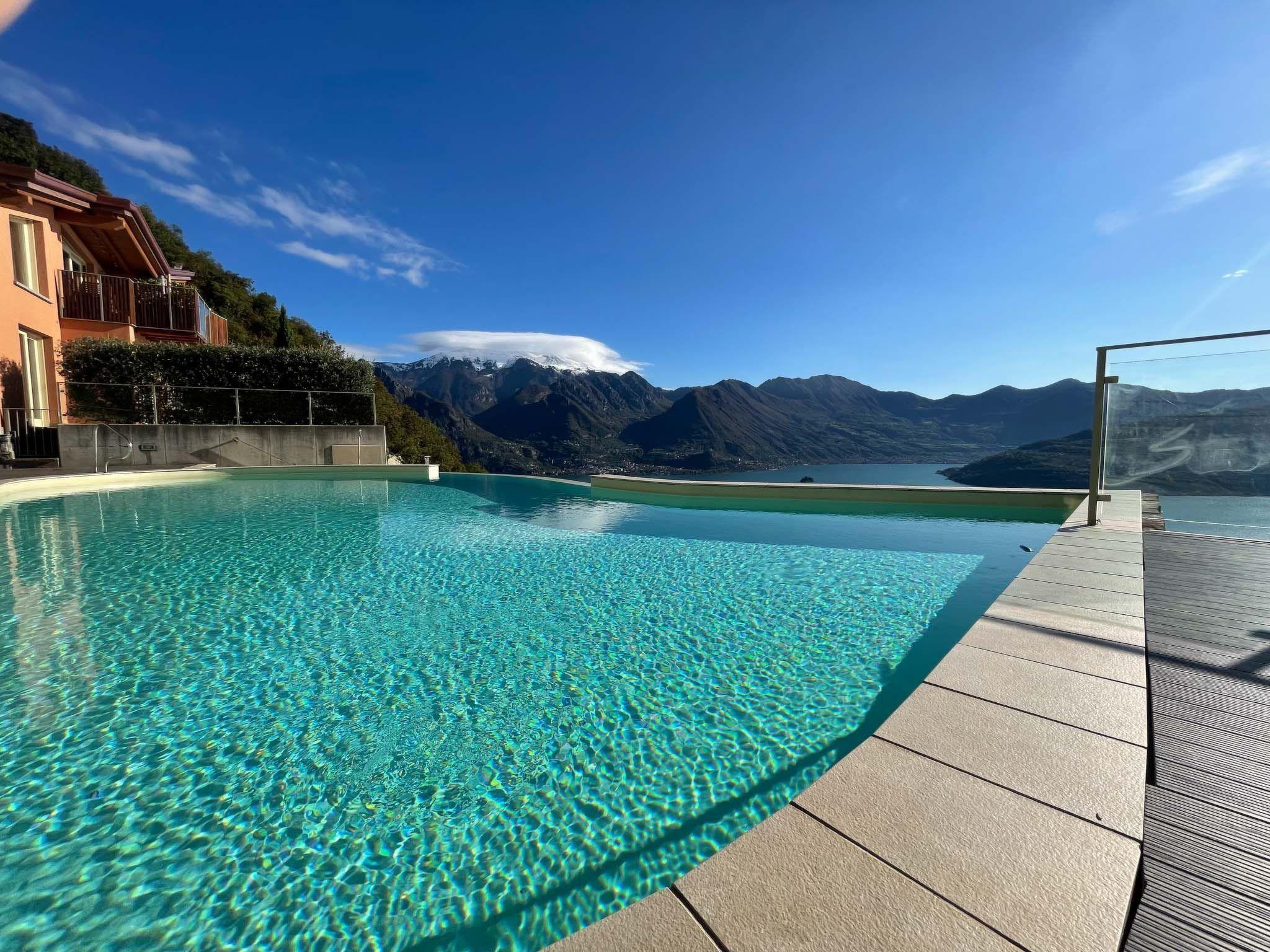 Das ist unsere einzige Empfehlung, nachdem wir die atemberaubenden Bilder von Corinto gesehen haben, einer sensationellen Dreizimmerwohnung am See auf zwei Ebenen. Auf 90 Quadratmetern bietet sie im Erdgeschoss einen großen möblierten Garten und im ersten Stock eine herrliche Terrasse mit Vollverglasung, die sich über die gesamte Länge der Wohnung erstreckt und buchstäblich das natürliche Amphitheater des Iseo-Sees überragt. Und das ist noch nicht alles: Sobald Sie Ihren Blick in die Gemeinschaftsbereiche lenken, entdecken Sie, dass der Panoramapool ein Infinity-Pool ist und dass es in der Anlage auch einen Fitnessbereich gibt, ebenfalls mit einer unvergleichlichen Aussicht. Dort können Sie, falls Sie es noch nicht geschafft haben, wieder normal atmen.