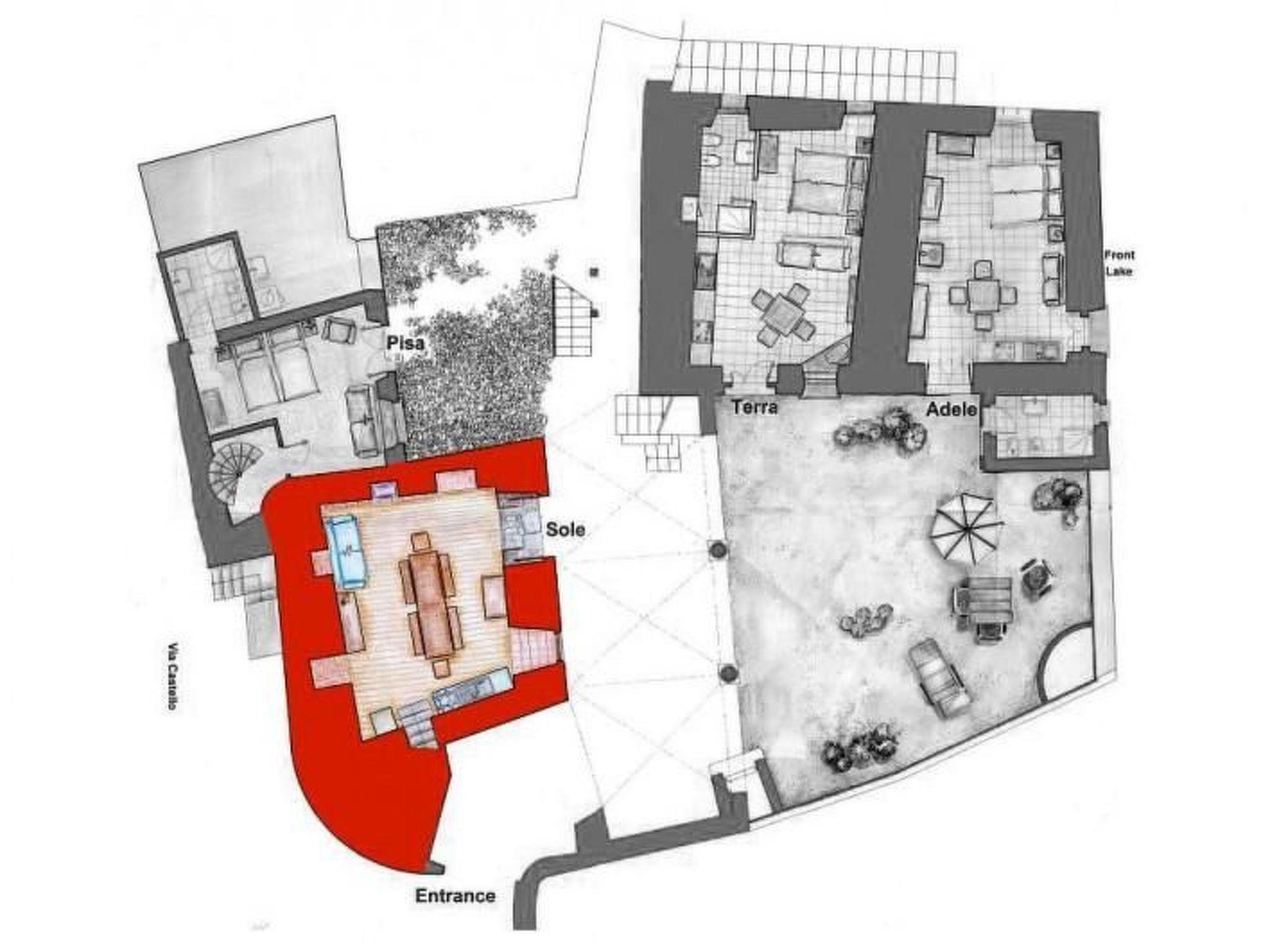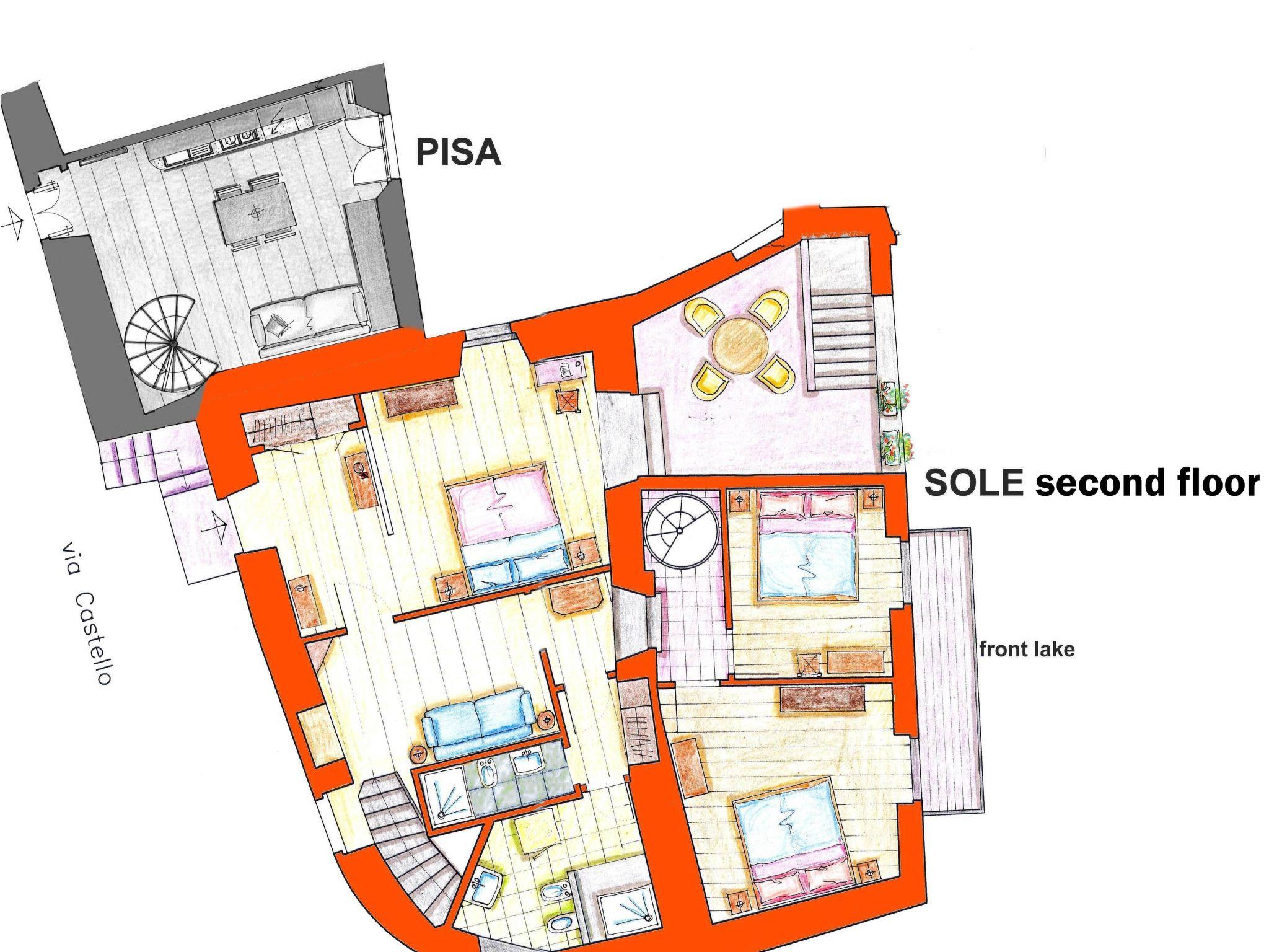 Von einem der Schlafzimmer aus haben Sie Zugang zur Veranda im ersten Stock, die mit einem runden Tisch und Holzstühlen ausgestattet ist und einen herrlichen Blick auf den See bietet. Über die steile und antike Treppe haben Sie exklusiven Zugang zu den Gemeinschaftsräumen wie dem Innenhof und Garten