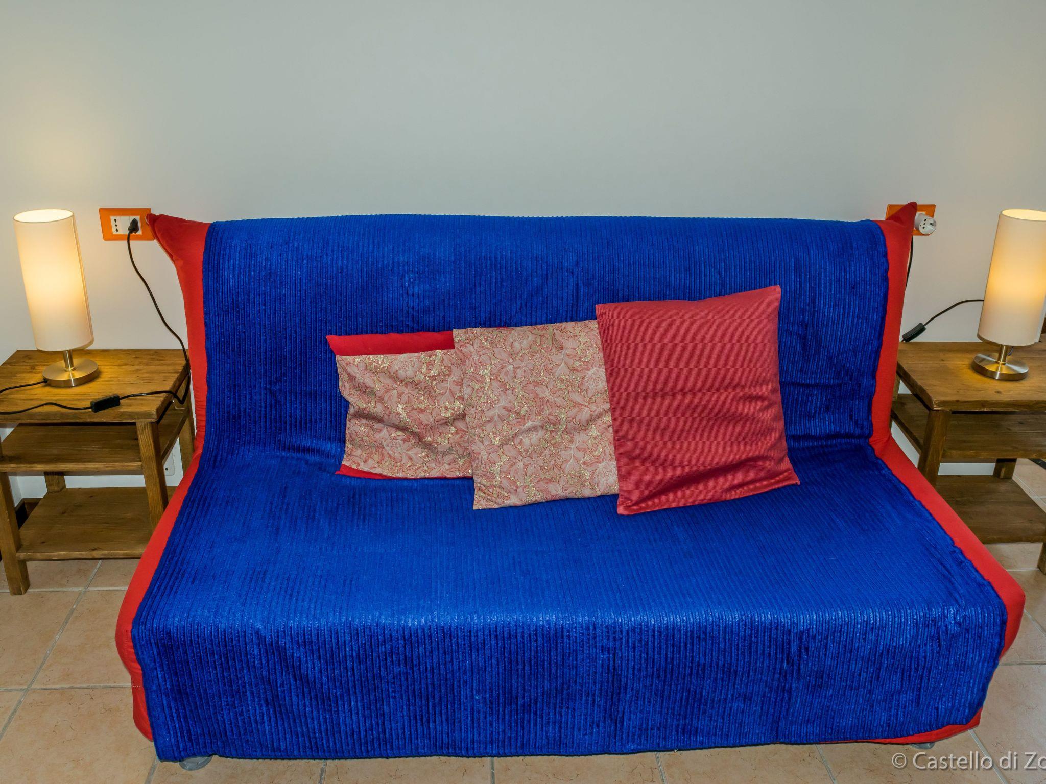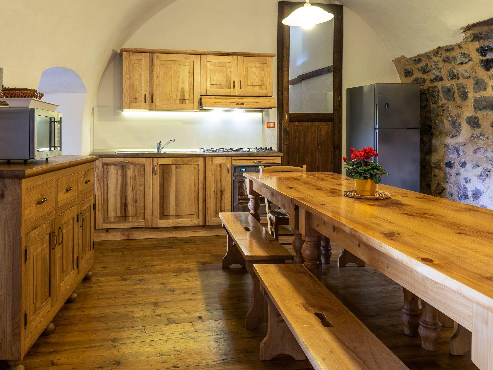 Die große Wohnküche mit Holzboden und gewölbter Decke verfügt über zwei große Esstische mit Stühlen, ein Schlafsofa für zwei Personen und Sat-Smart-TV. Es ist mit einem Geschirrspüler, einer Mikrowelle, einem 6-Flammen-Gasherd, einem Backofen und einem Kühlschrank mit Gefrierfach ausgestattet.