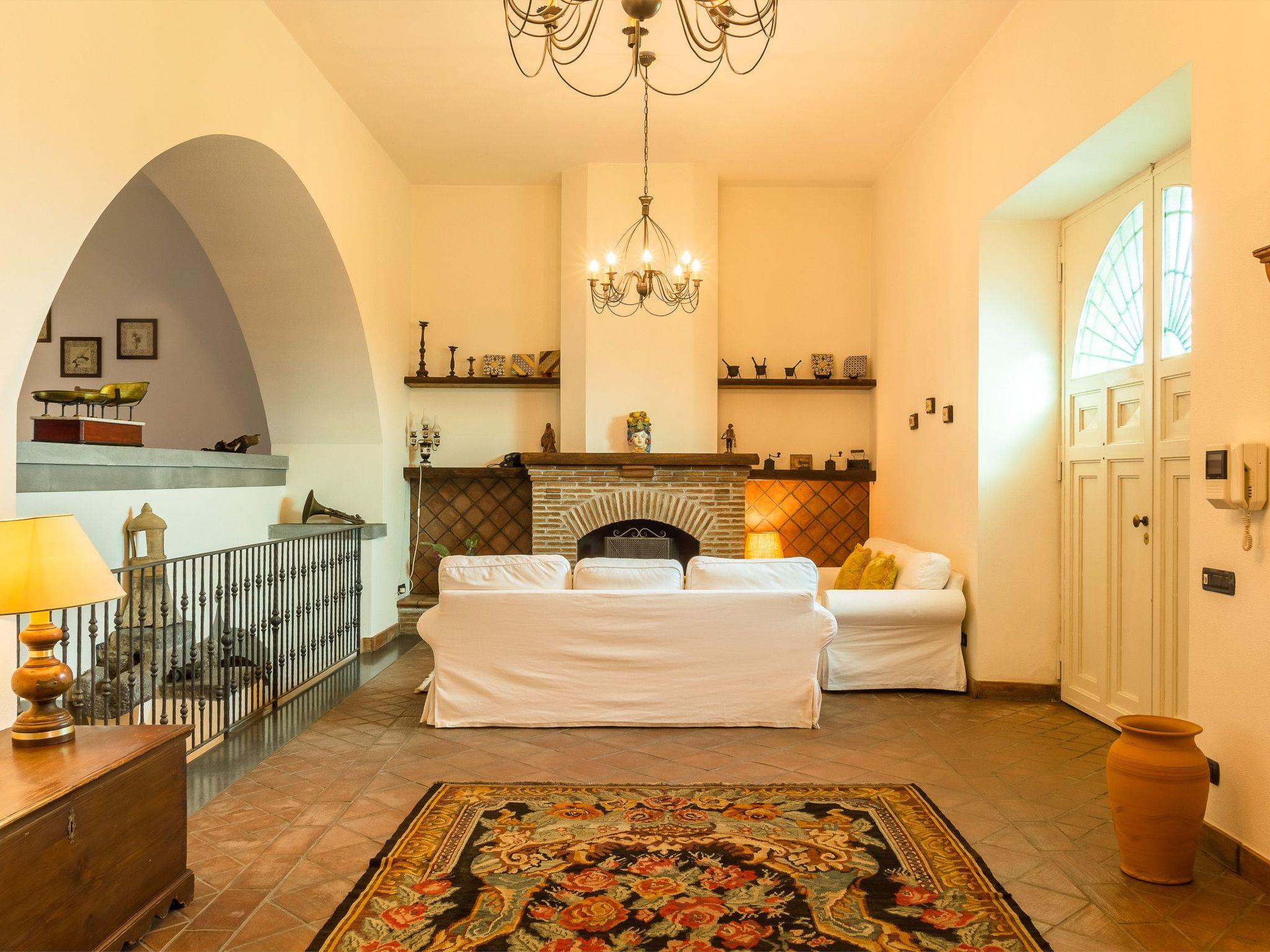 Vom Wohnzimmer aus hat man Zugang zu den gepflasterten und möblierten Außenbereichen, die sich mit einer herrlichen Rasenfläche und einer Sonnenterrasse am großen gemauerten Swimmingpool fortsetzen.