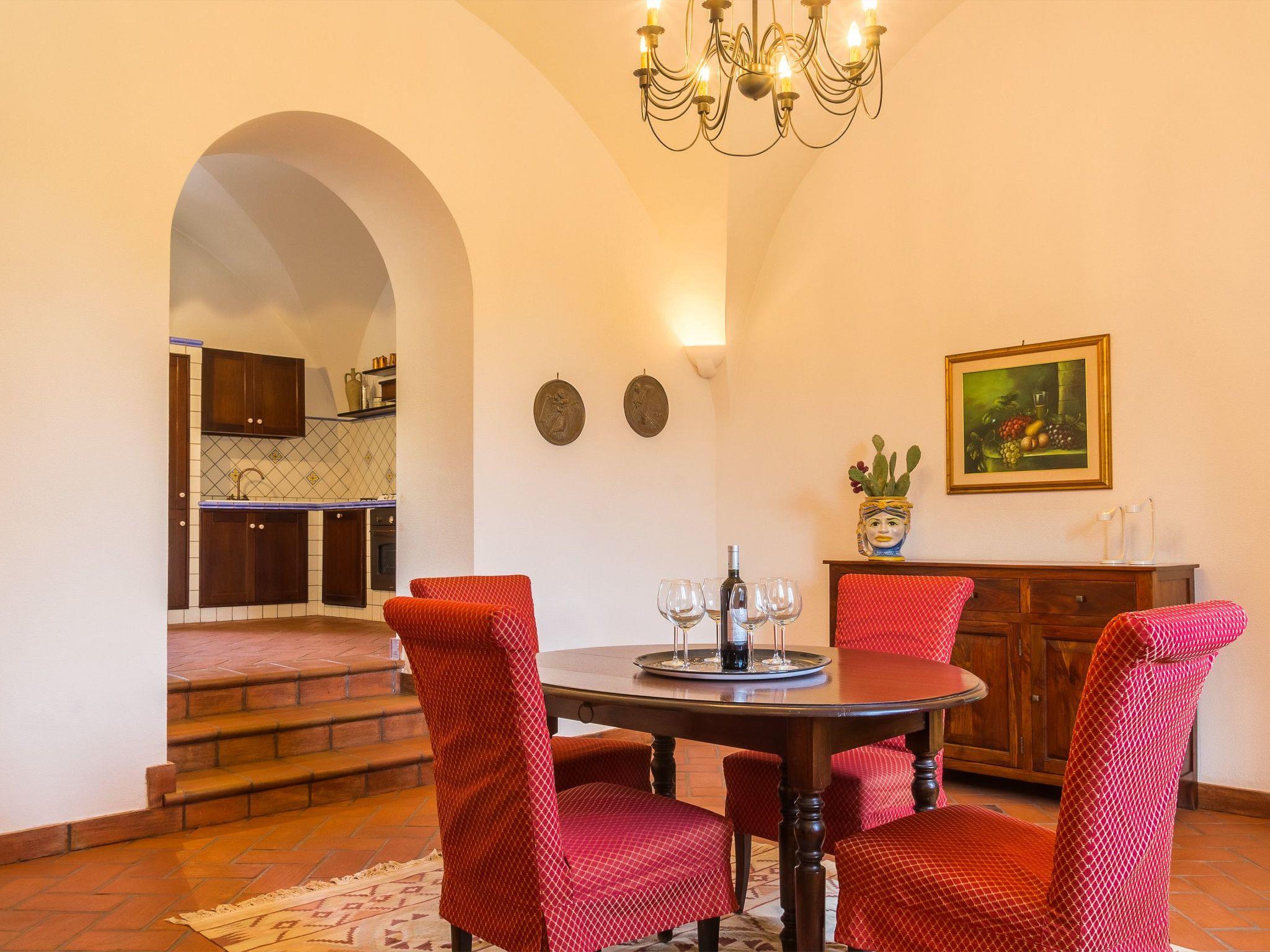 Das Haus mit eigenem Eingang bietet den Gästen im Erdgeschoss ein großes Wohnzimmer auf zwei Ebenen, das in den alten Mühlstein gebaut wurde, mit einem charakteristischen Kamin, eine Lese- und Entspannungsecke im Bereich unterhalb des Mühlsteins, eine Essecke, eine große und gut ausgestattete Küche mit Kamin und ein Bad mit Dusche. ein Doppelzimmer mit Kingsize-Bett und Blick auf das Meer und den Zitrusgarten, das zweite Doppelzimmer mit Blick auf den Vulkan Ätna und den bezaubernden Swimmingpool mit Garten, ein drittes Schlafzimmer mit Blick auf das Meer und den Zitrusgarten, ausgestattet mit zwei Einzelbetten, die bei Bedarf in ein Doppelbett umgewandelt werden können, ein Badezimmer auf der Etage mit Badewanne. Die klimatisierten Schlafzimmer verfügen über Balkone und eine große Terrasse.