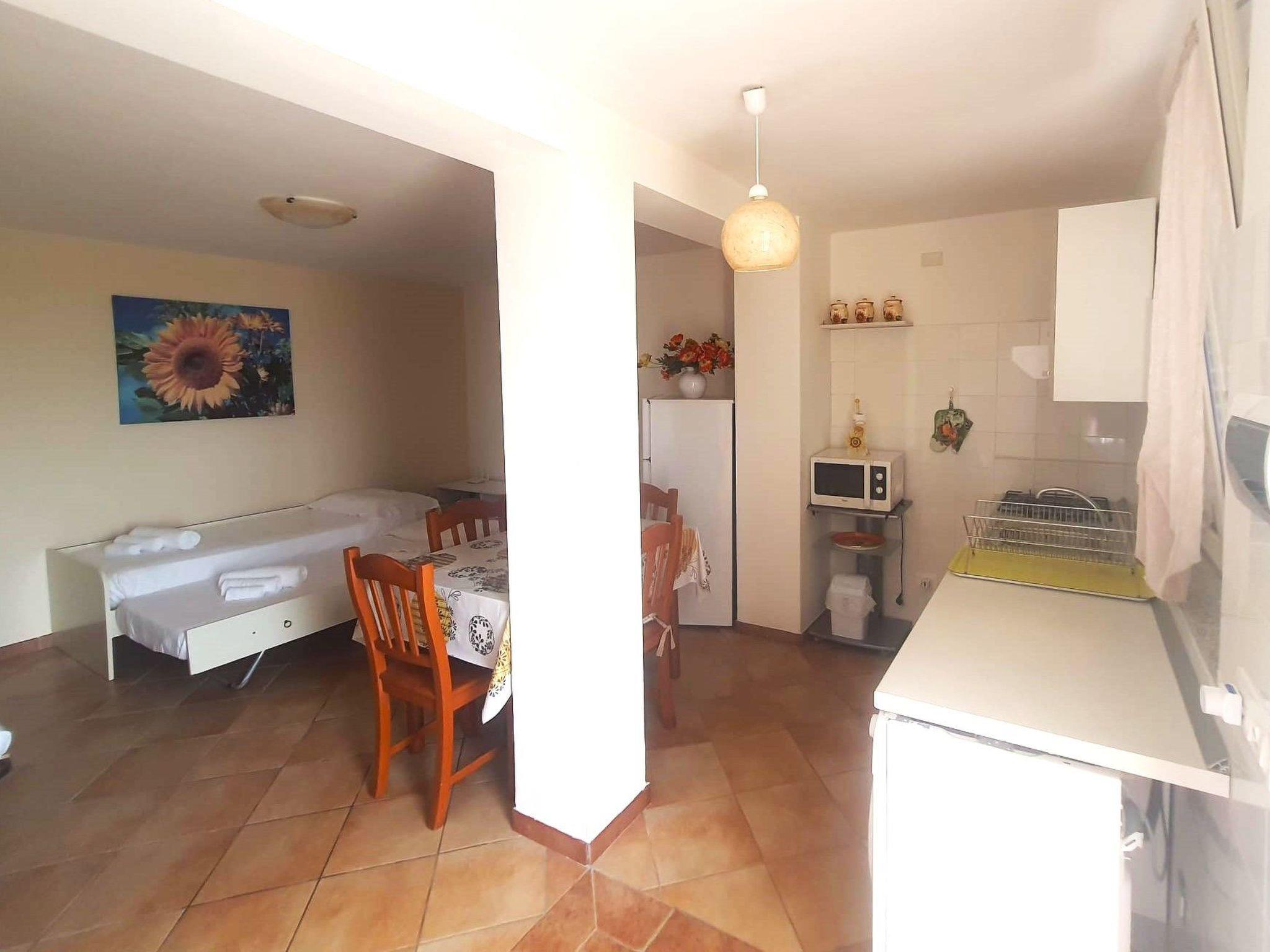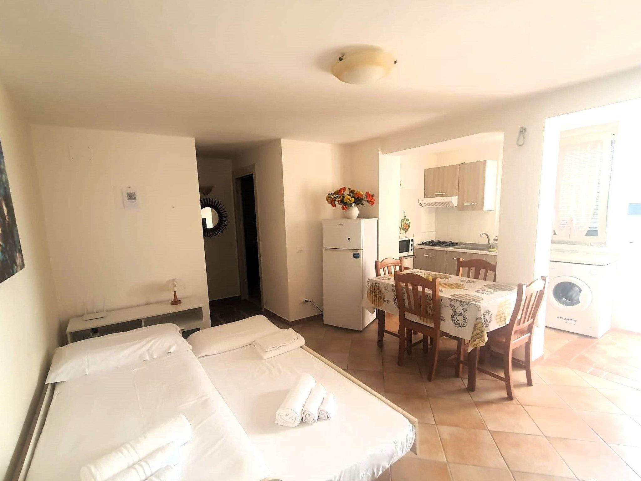 Das Innere der Wohnung verspricht einen komfortablen Aufenthalt dank der Klimaanlage, perfekt für Abkühlung an heißen Tagen. Sie ist ideal für bis zu 4 Personen und verfügt über ein Schlafzimmer mit Doppelbett und 2 Einzelbetten im Wohnzimmer mit Küche, die gut organisierte und funktionelle Räume für Entspannung und Geselligkeit bieten. Das private Badezimmer mit Dusche vervollständigt die Ausstattung, zusammen mit einer Waschmaschine, die Sie exklusiv nutzen können, um Ihren Aufenthalt so praktisch wie möglich zu gestalten.