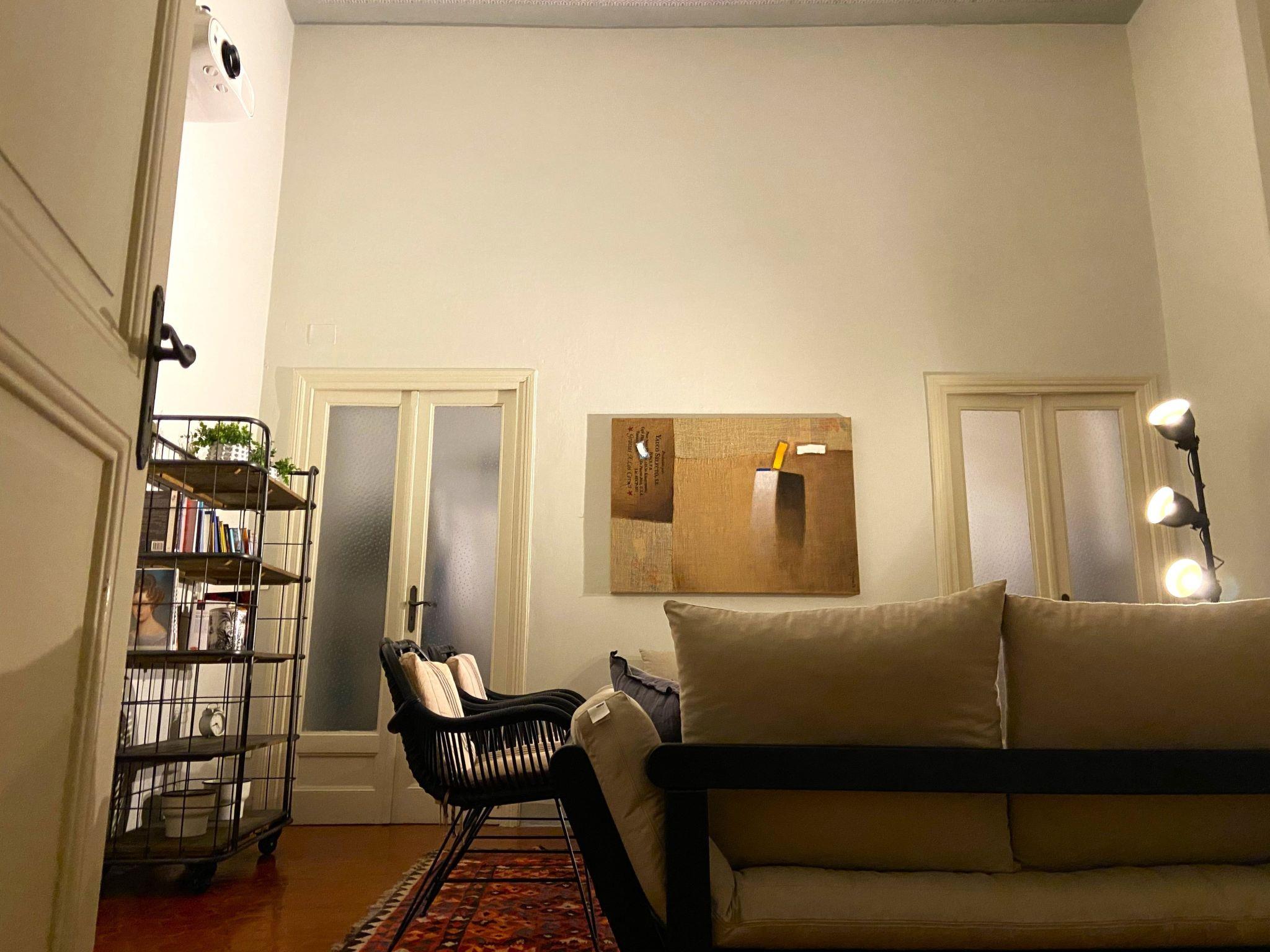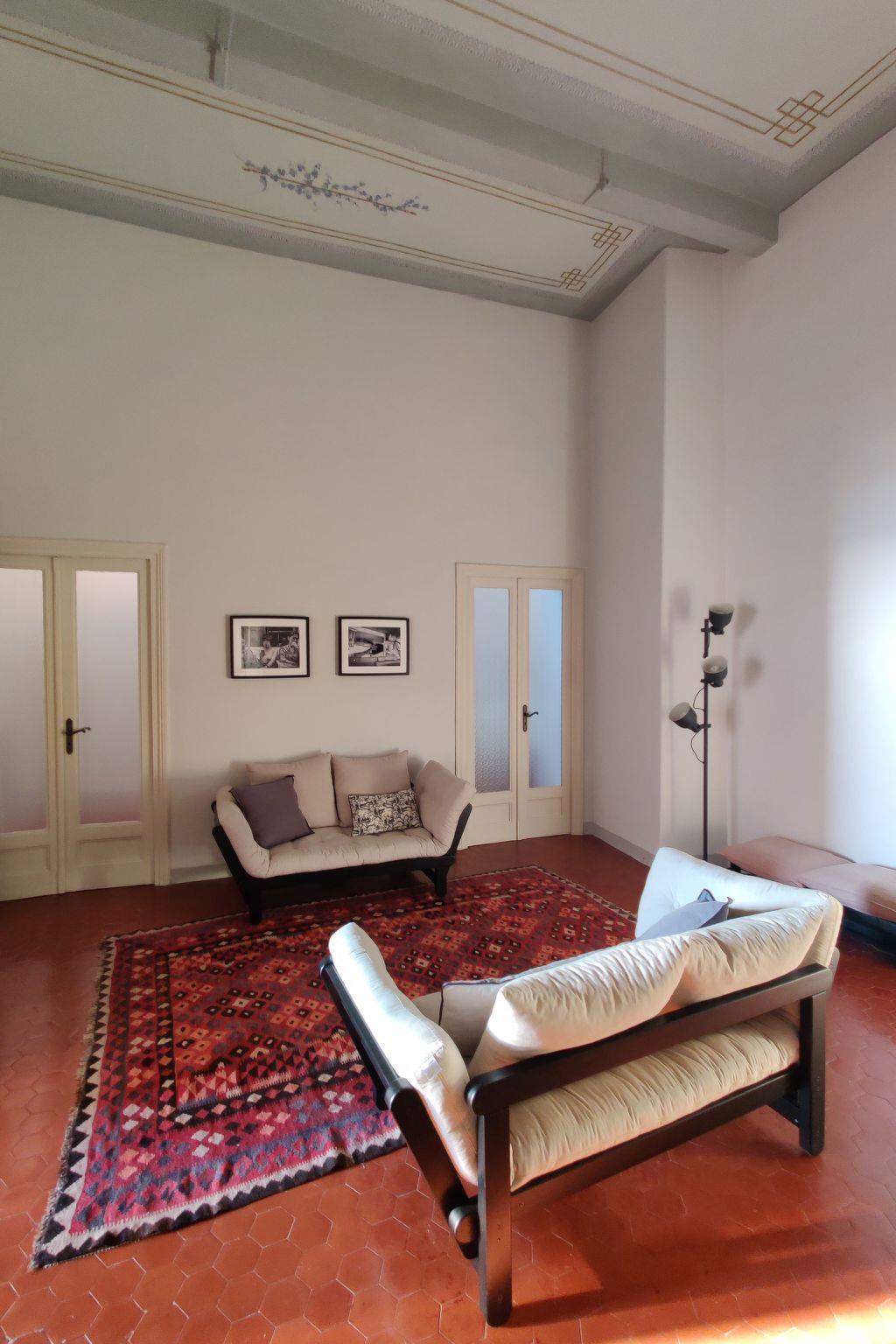 Entspannen Sie sich in den beiden einladenden Wohnzimmern, in denen hohe, mit Originalfresken verzierte Decken und große Fenster eine luftige und lichtdurchflutete Atmosphäre schaffen. Die Wohnbereiche sind mit ihren bequemen Sitzgelegenheiten und der geschmackvollen Einrichtung perfekt, um sich nach einem Tag der Erkundung zu entspannen.