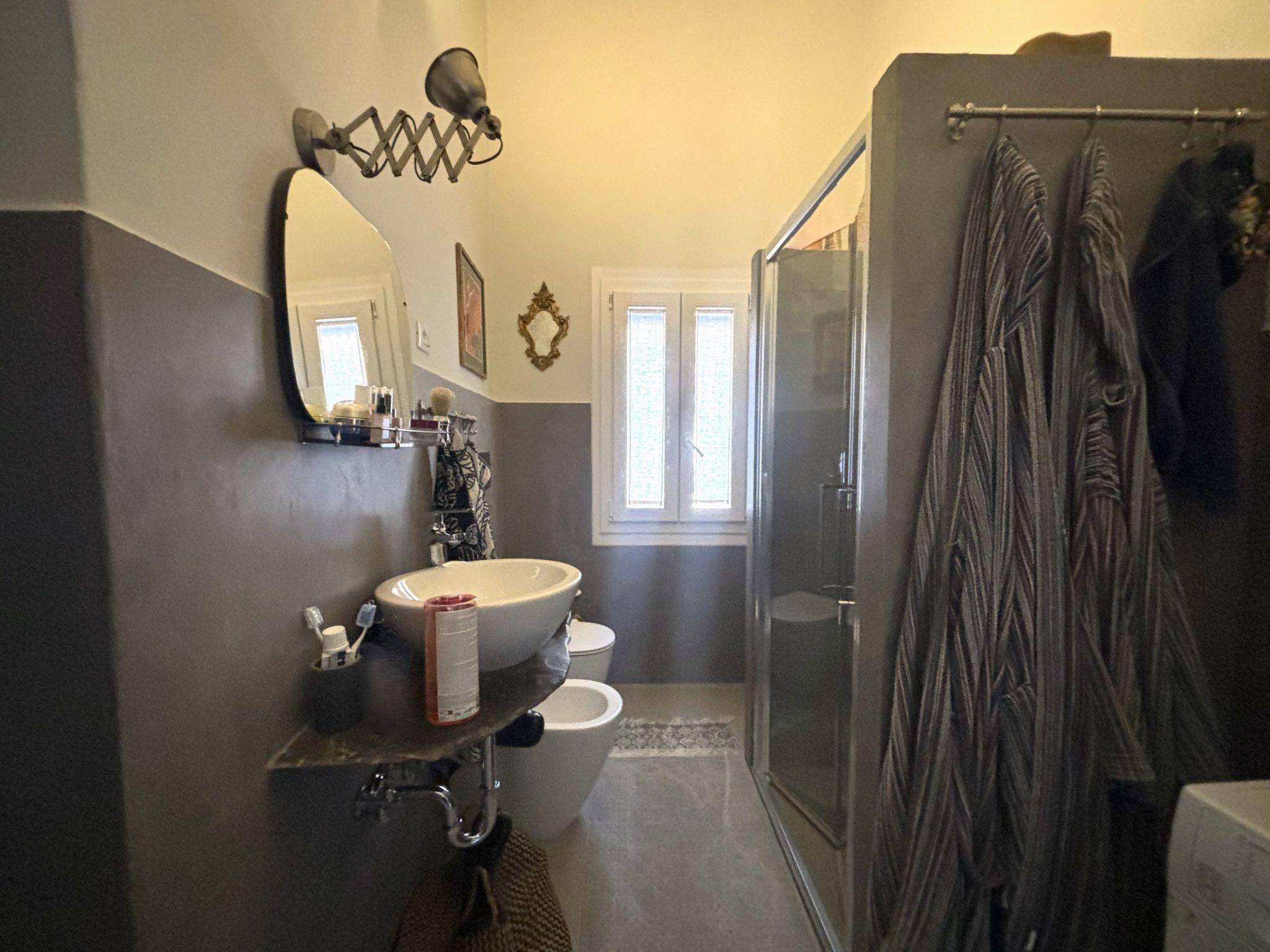 Das moderne Badezimmer ist mit einer geräumigen Dusche und hochwertigen Armaturen einschließlich eines Bidets ausgestattet und bietet den Gästen ein luxuriöses Erlebnis.