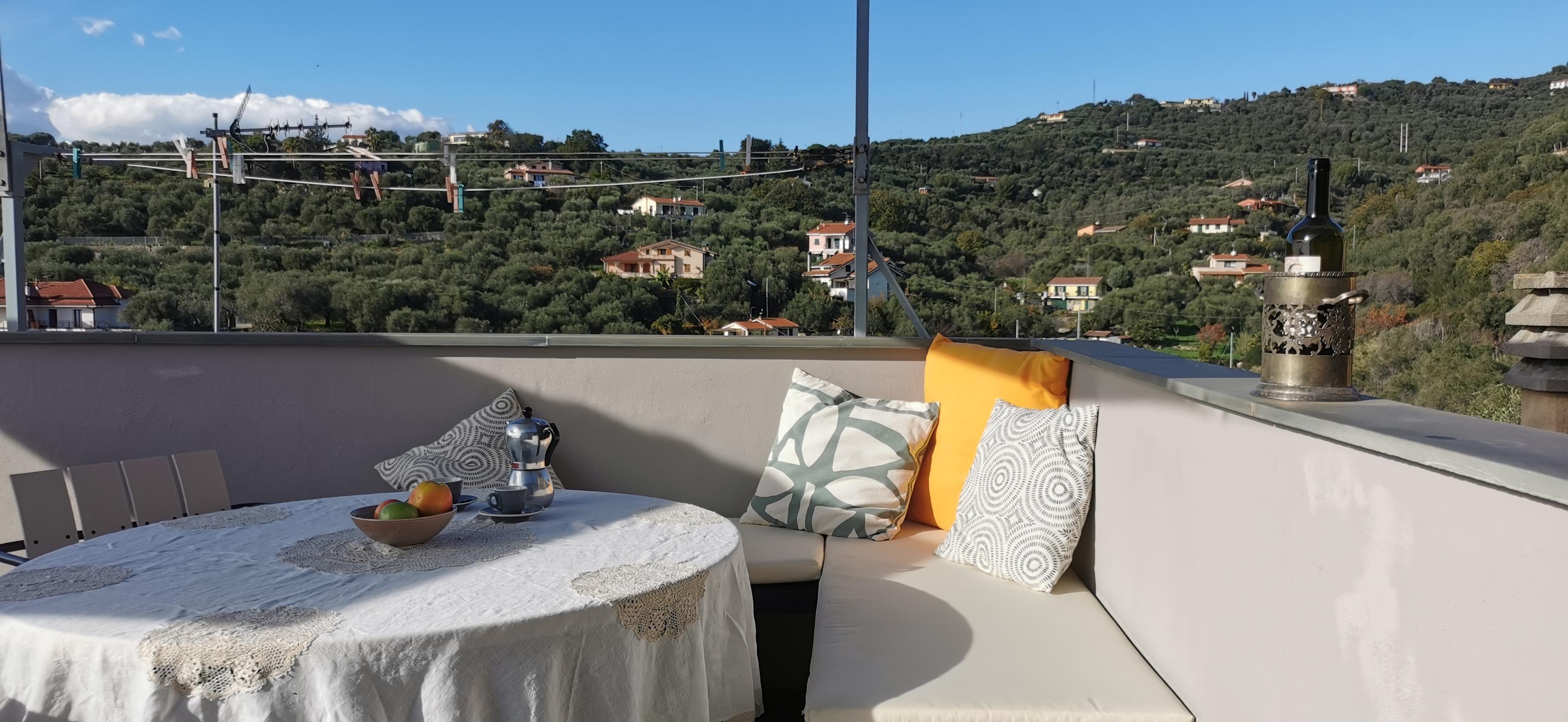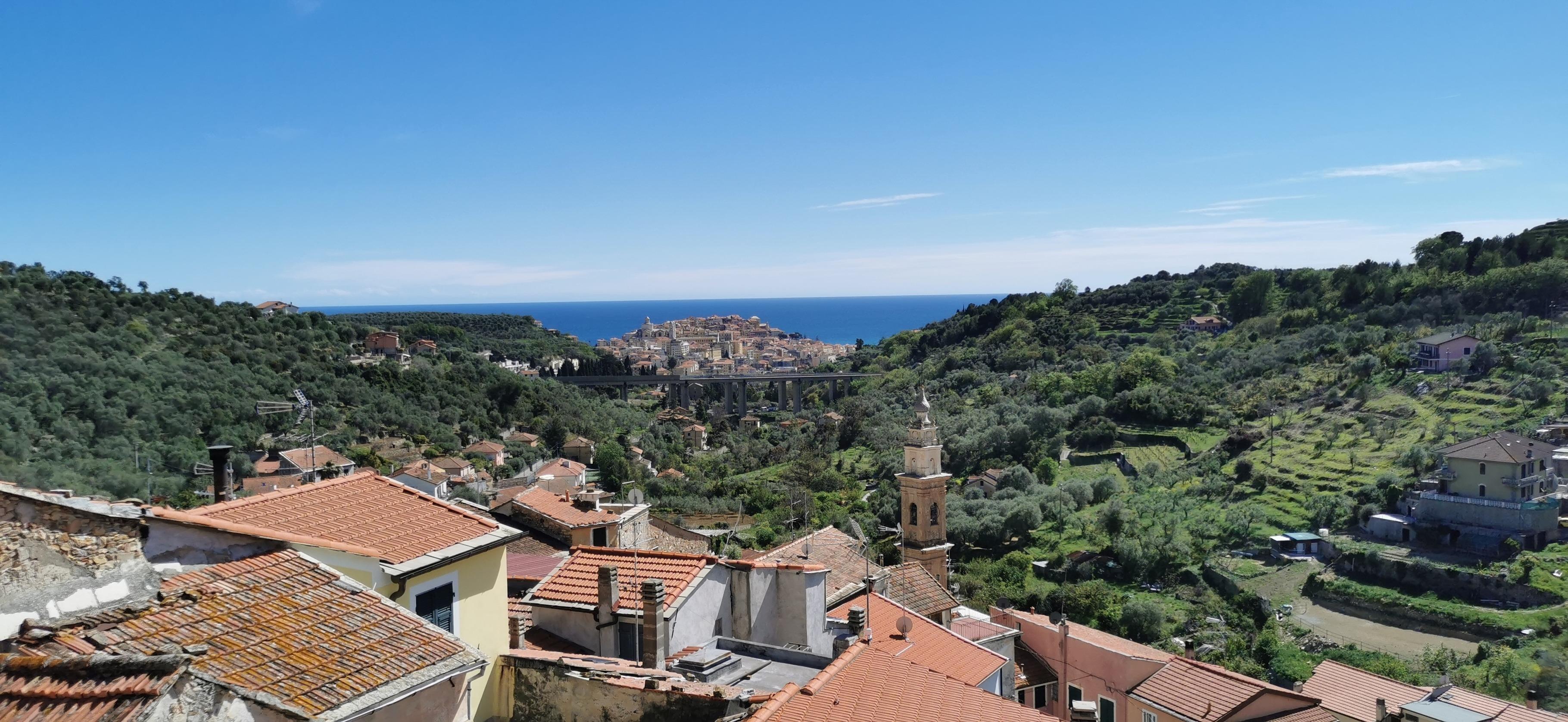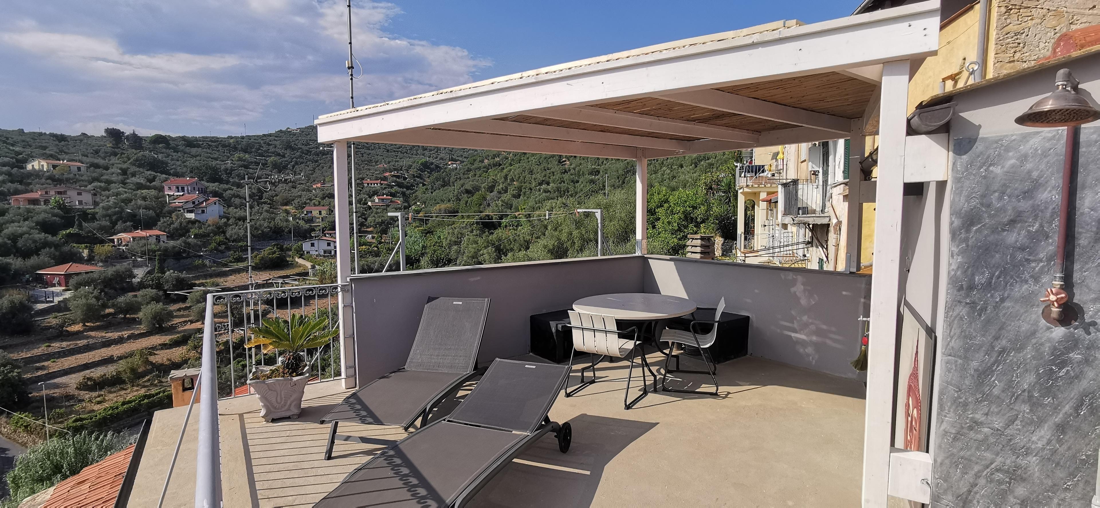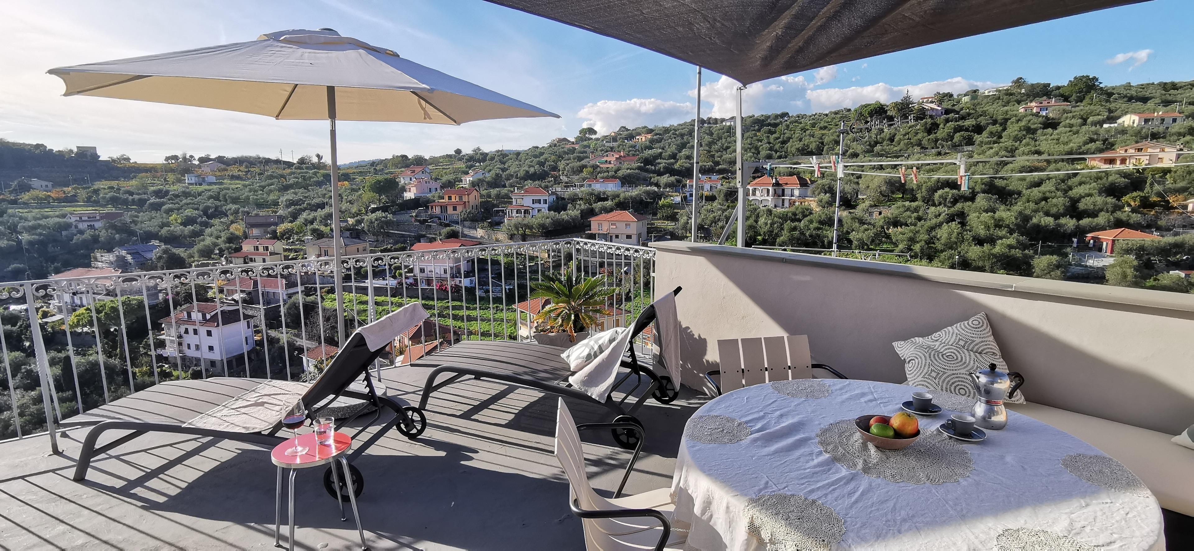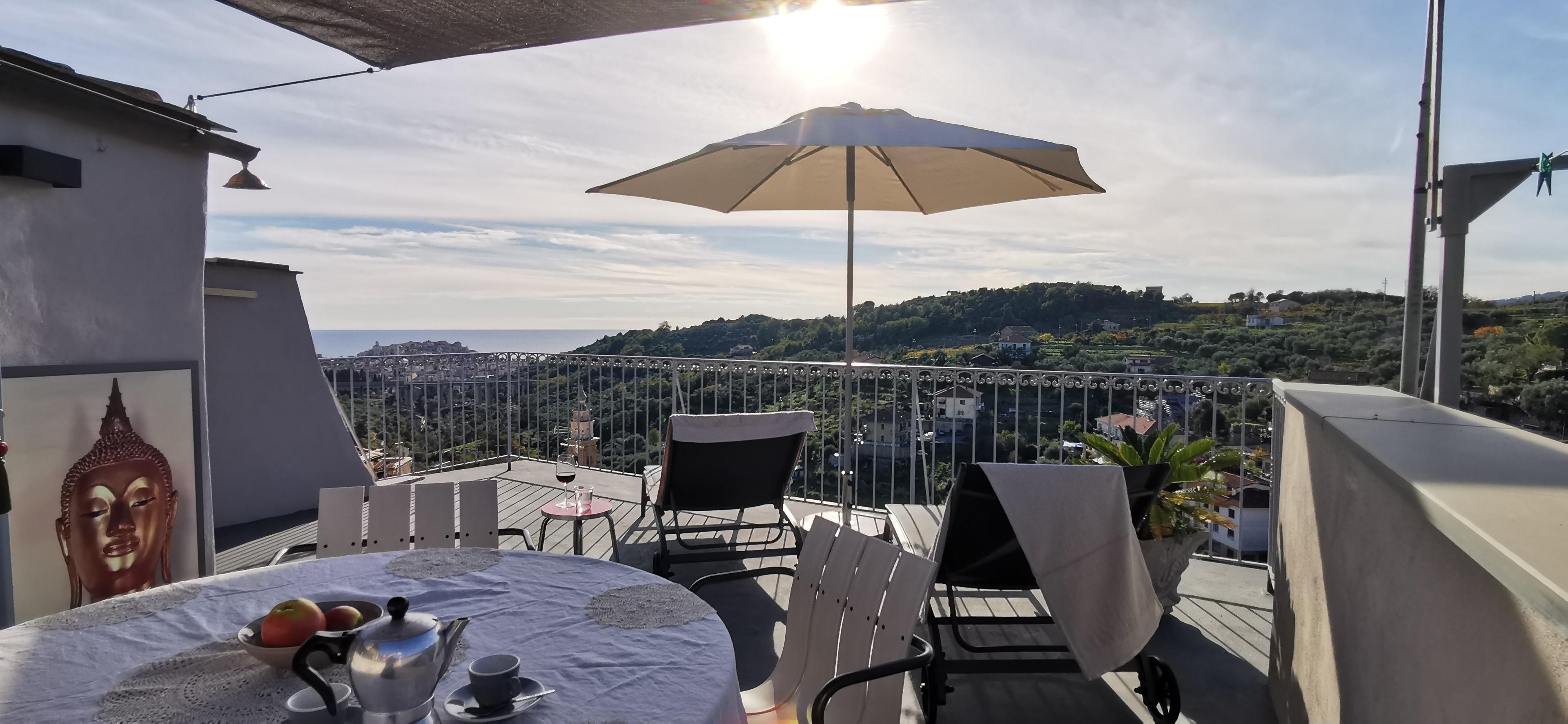 Die Terrasse ist das Highlight der Wohnung mit einem spektakulären, unverbauten Panoramablick hinweg über die alten Dächer von Artallo und in der Ferne stets der Blick auf das Meer von Ligurien.