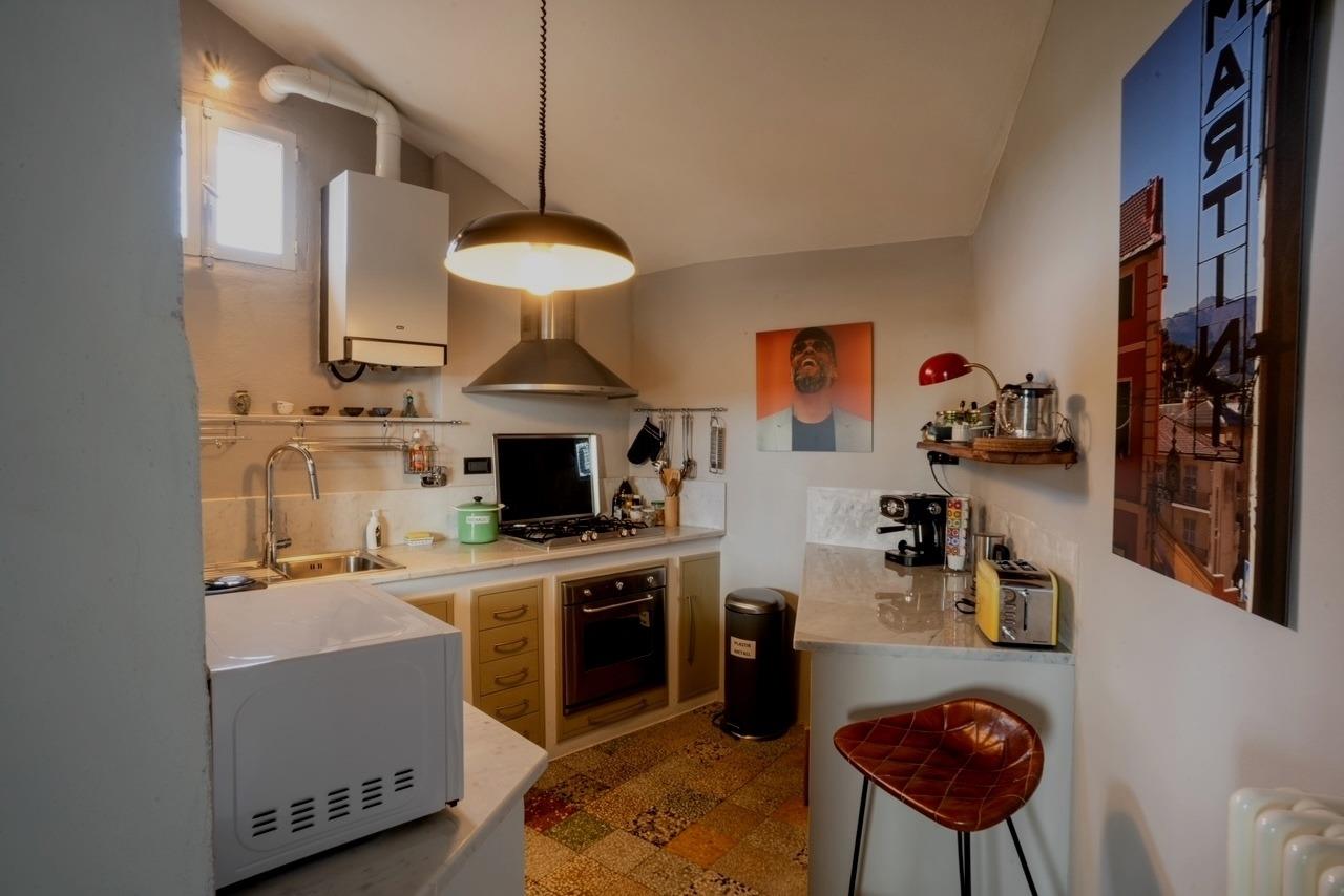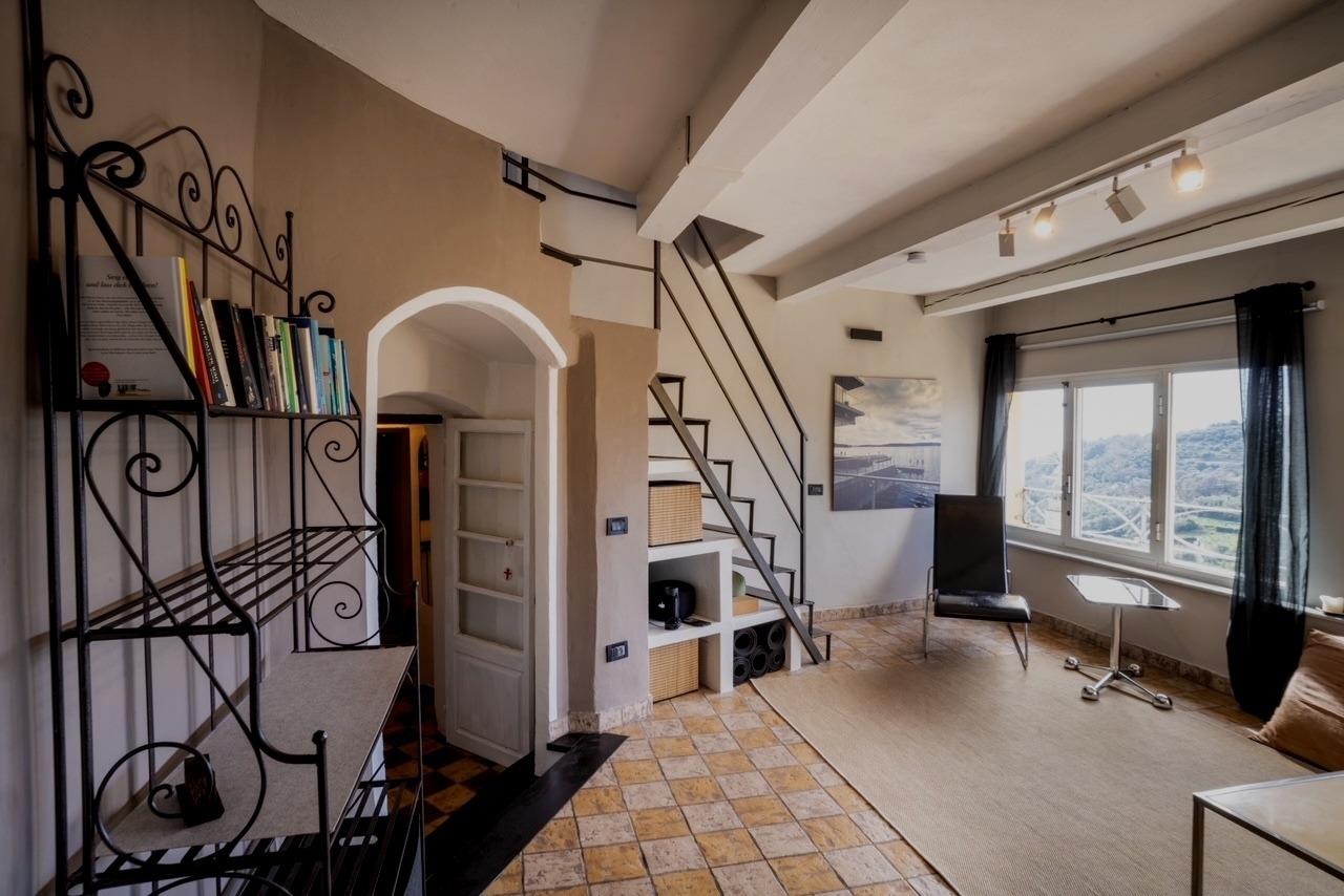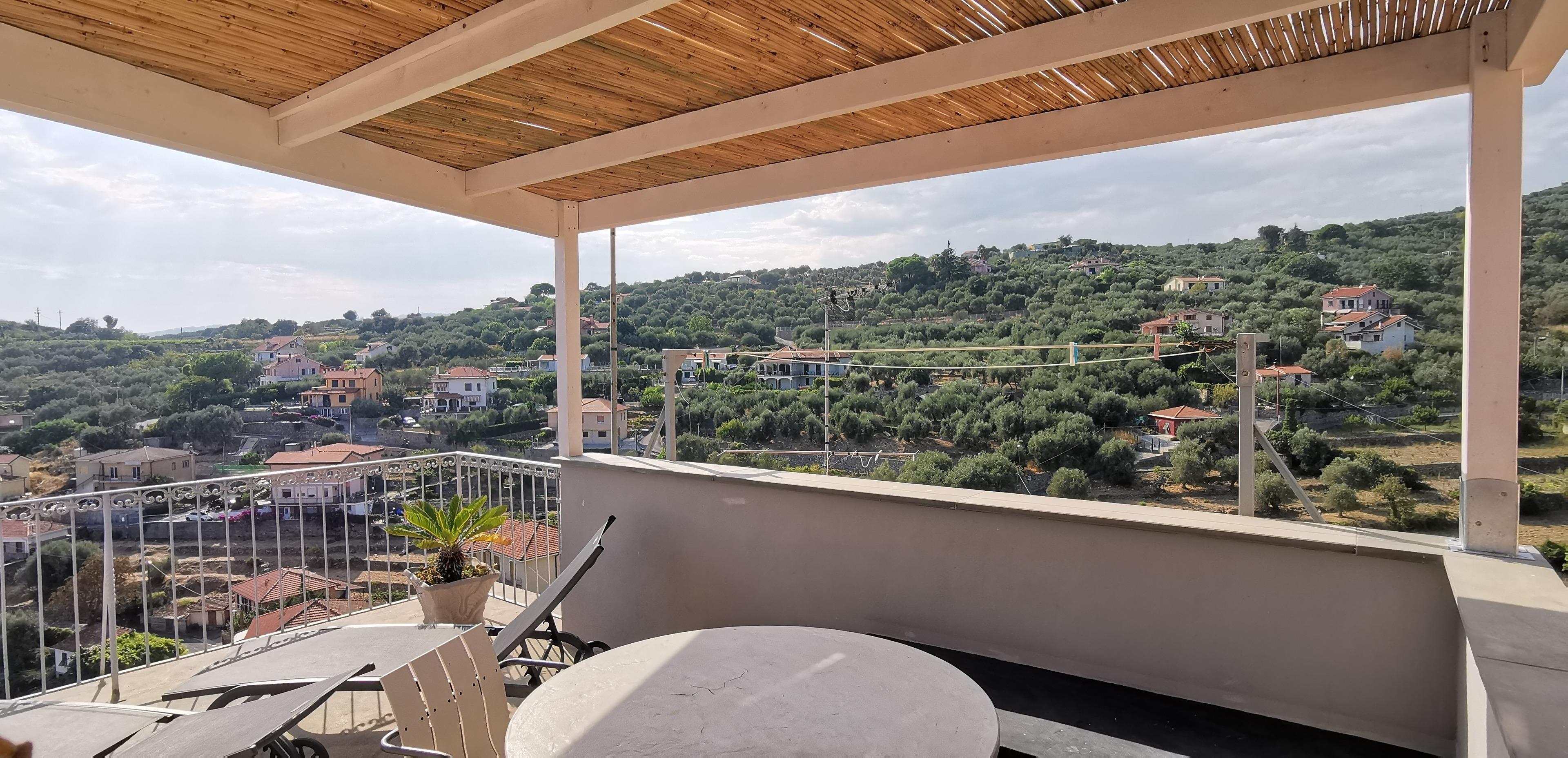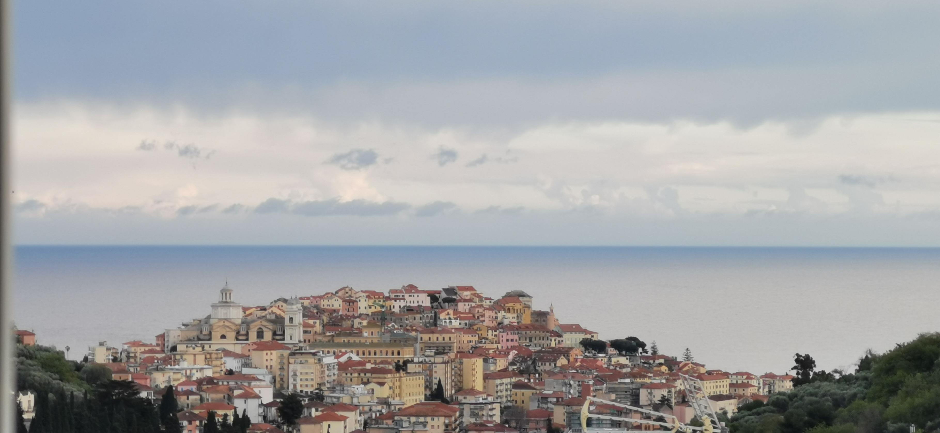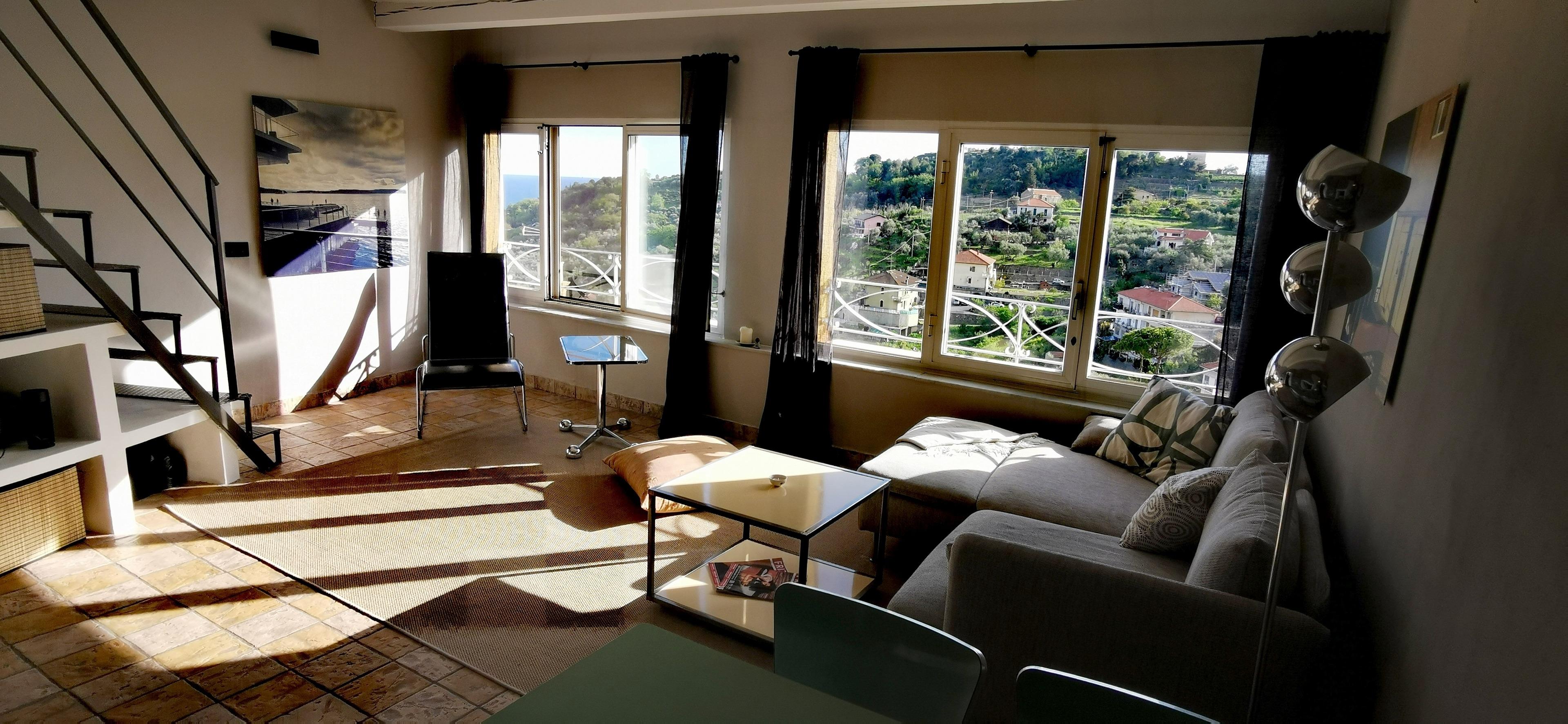 Die Terrasse ist das Highlight der Wohnung mit einem spektakulären, unverbauten Panoramablick hinweg über die alten Dächer von Artallo und in der Ferne stets der Blick auf das Meer von Ligurien.