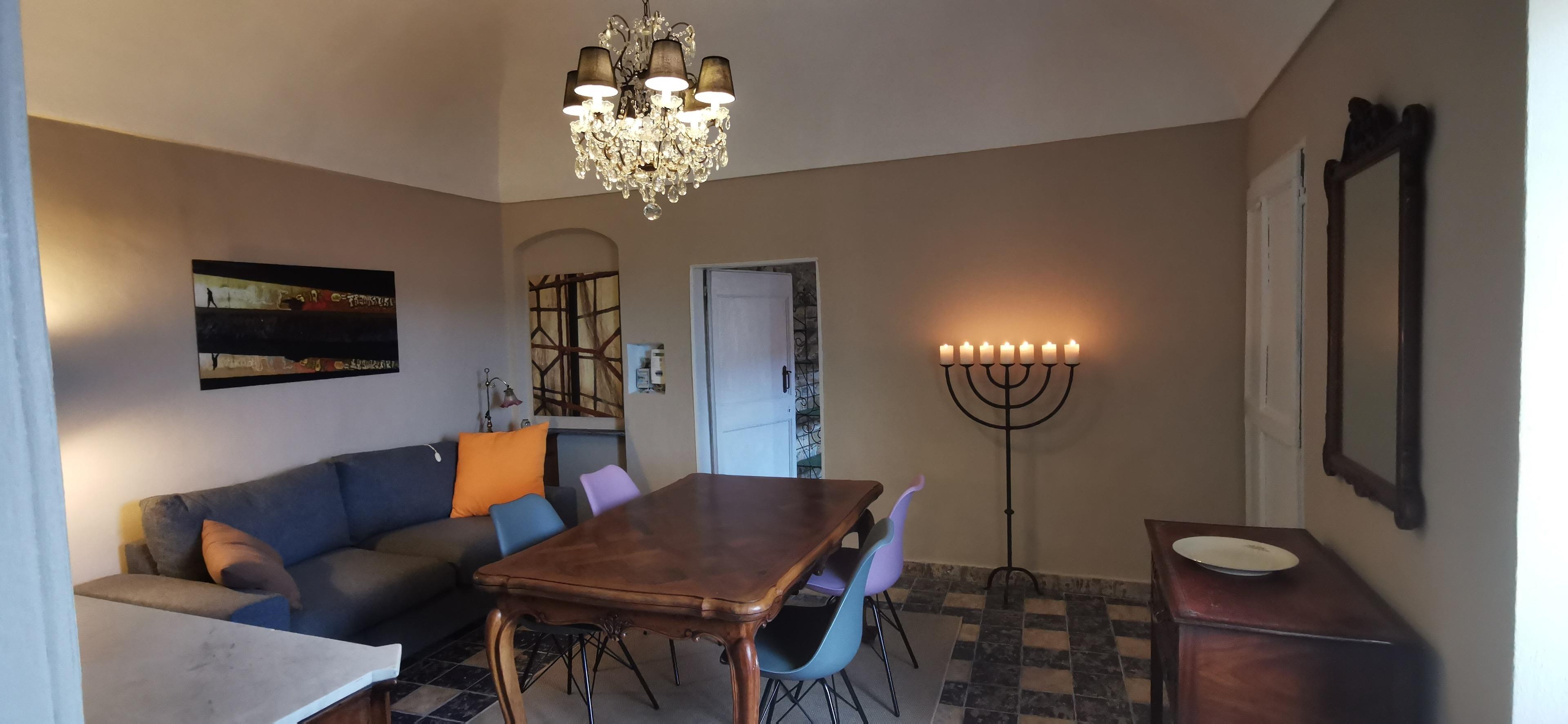 Über die Eingangstreppe nach oben, kommt man in die liebevoll restaurierte Altbauwohnung. In der ersten Ebene befinden sich Wohnzimmer mit Ecksofa und Yoga-Equipment, Küche, Bad, das erste Schlafzimmer für 2 Personen und das Esszimmer mit einem Schlafsofa. Die großen Fenster im Wohnzimmer ermöglichen einen wunderbaren Blick über die Landschaft, das Dorf, die Gärten und das Meer.