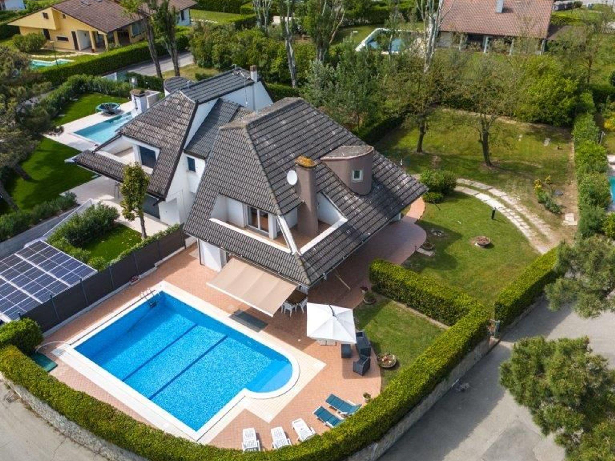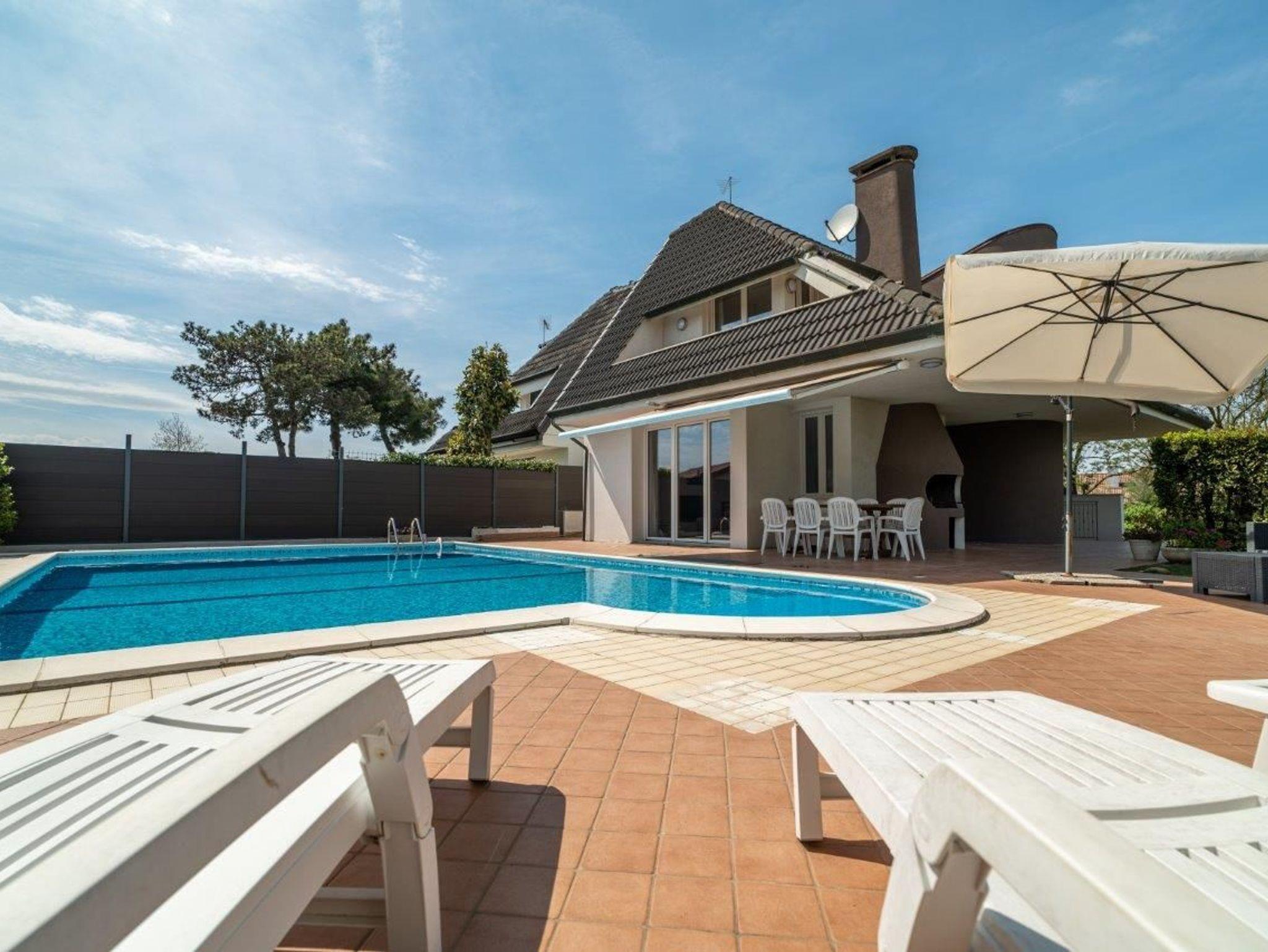 Ein sehr großer Garten mit sehr großem Pool, Außengrill, Außendusche und Gartenmöbel