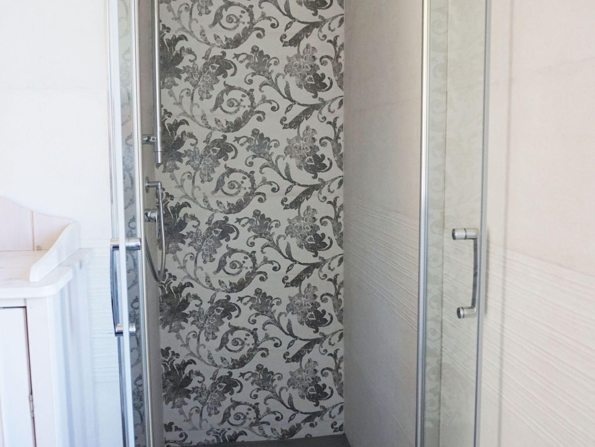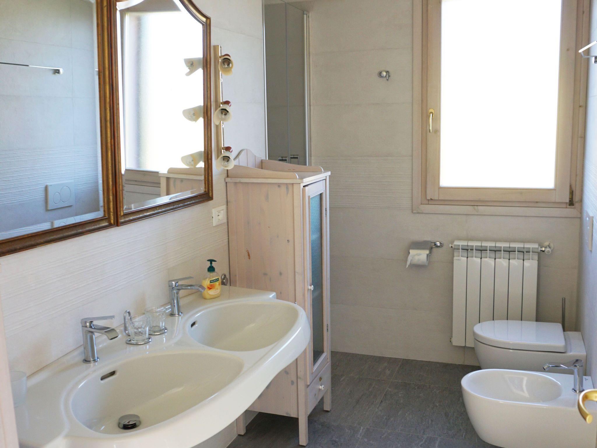 • Ein modernes Bad mit Doppelwaschbecken, Bidet, Dusche und Wc