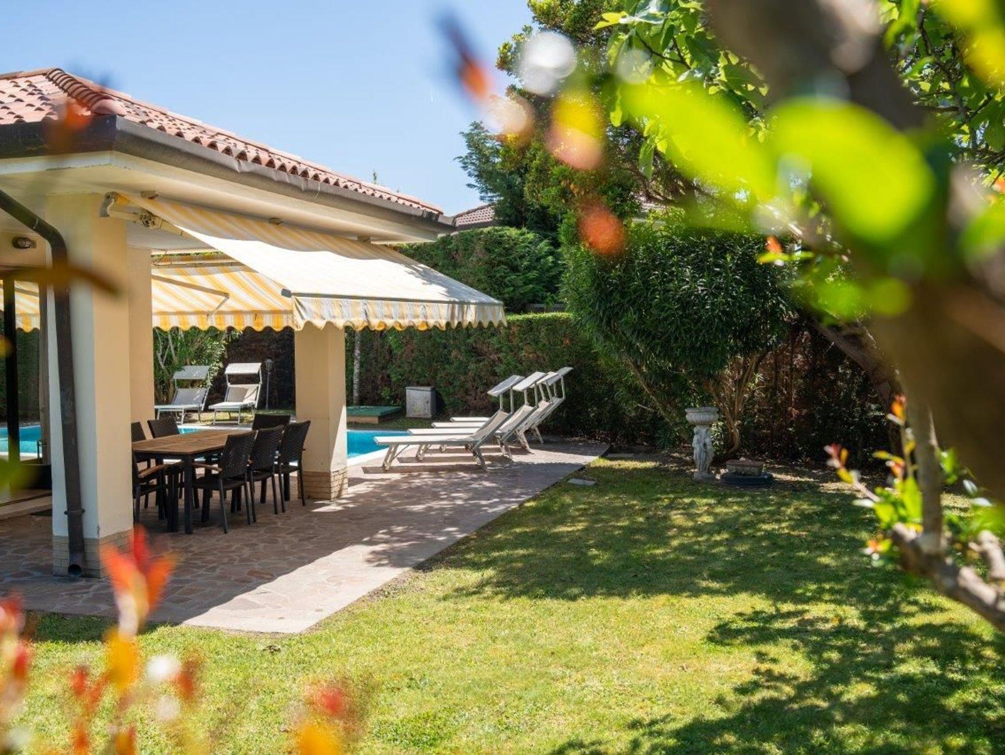 Sehr großer Garten mit Pool, überdachter Terrasse, Gartenmöbel, Sonnenliegen, Außengrill und Außendusche