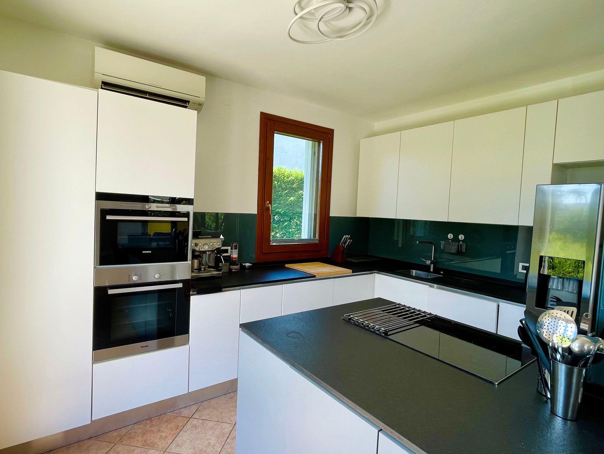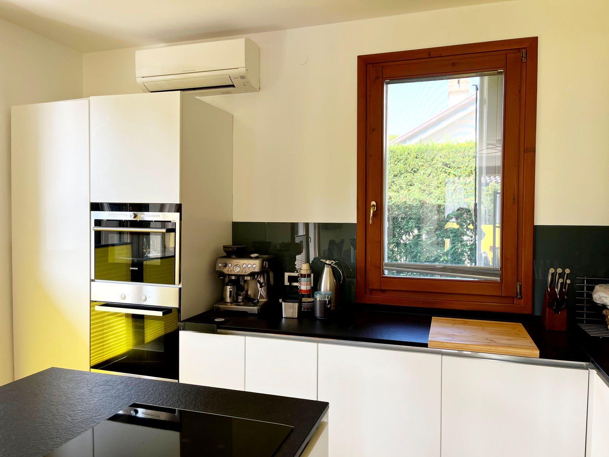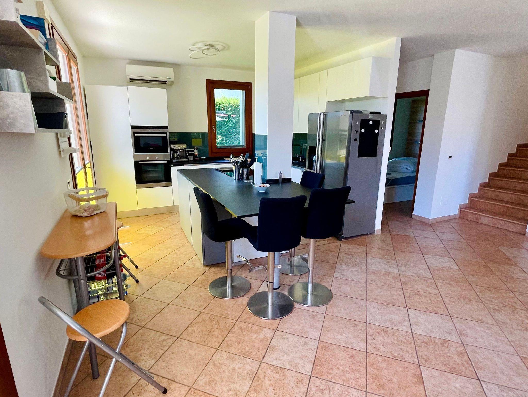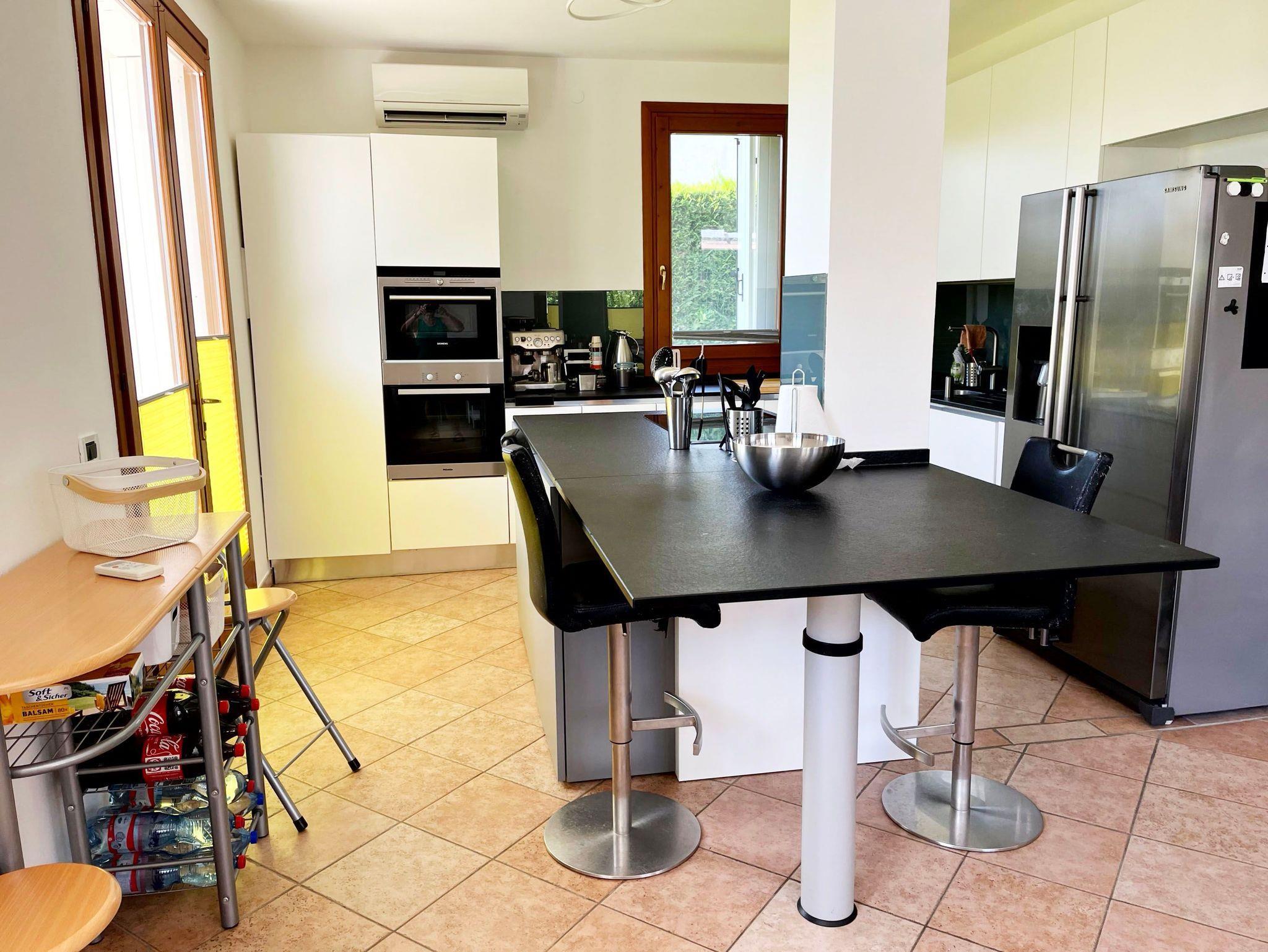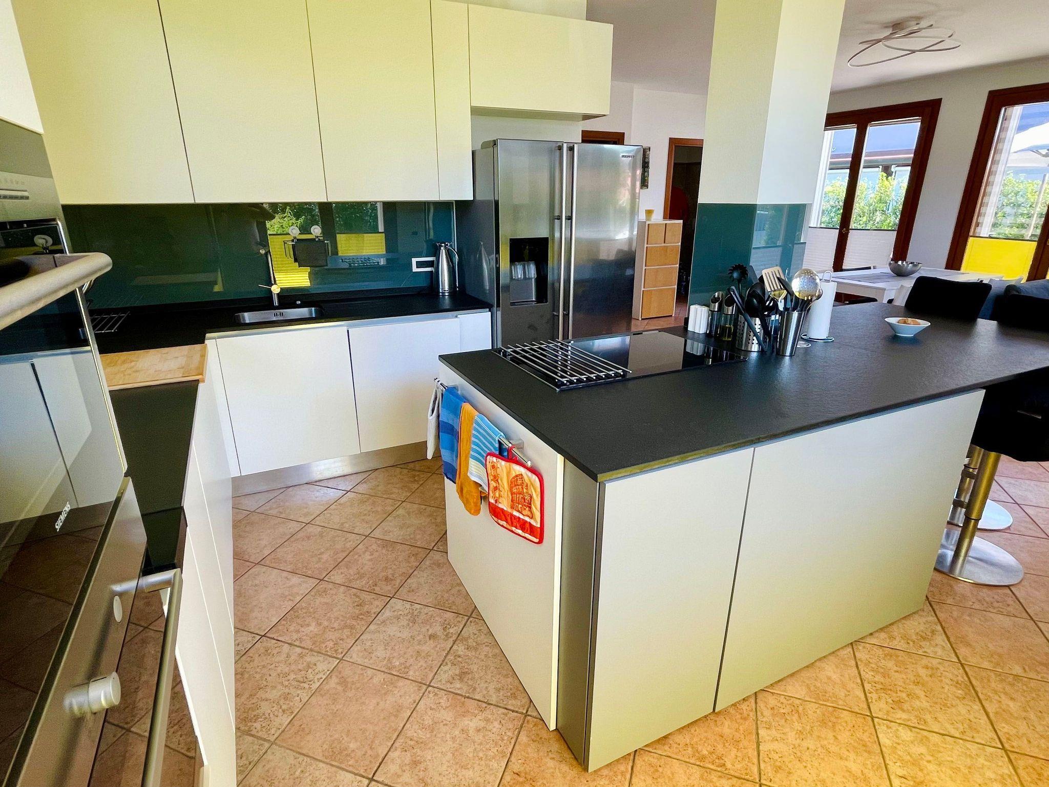 Zutritt ins Haus über eine gut ausgestattete zum Wohnraum hin, offene großzügige Küche mit Frühstückstheke und Klimaanlage