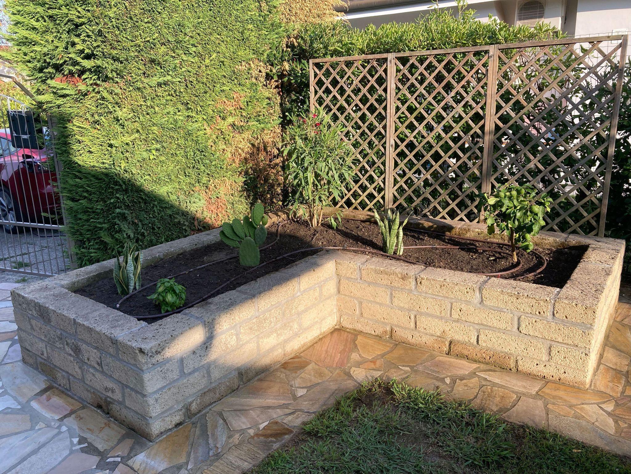 Hinter dem Haus, begehbare Terrasse mit 2 großen Sonnenschirmen, Granit-Terrassentisch für 10-12 Personen, ausreichend Gartenmöbel und Liegestühle, gemauerter Außengrill.