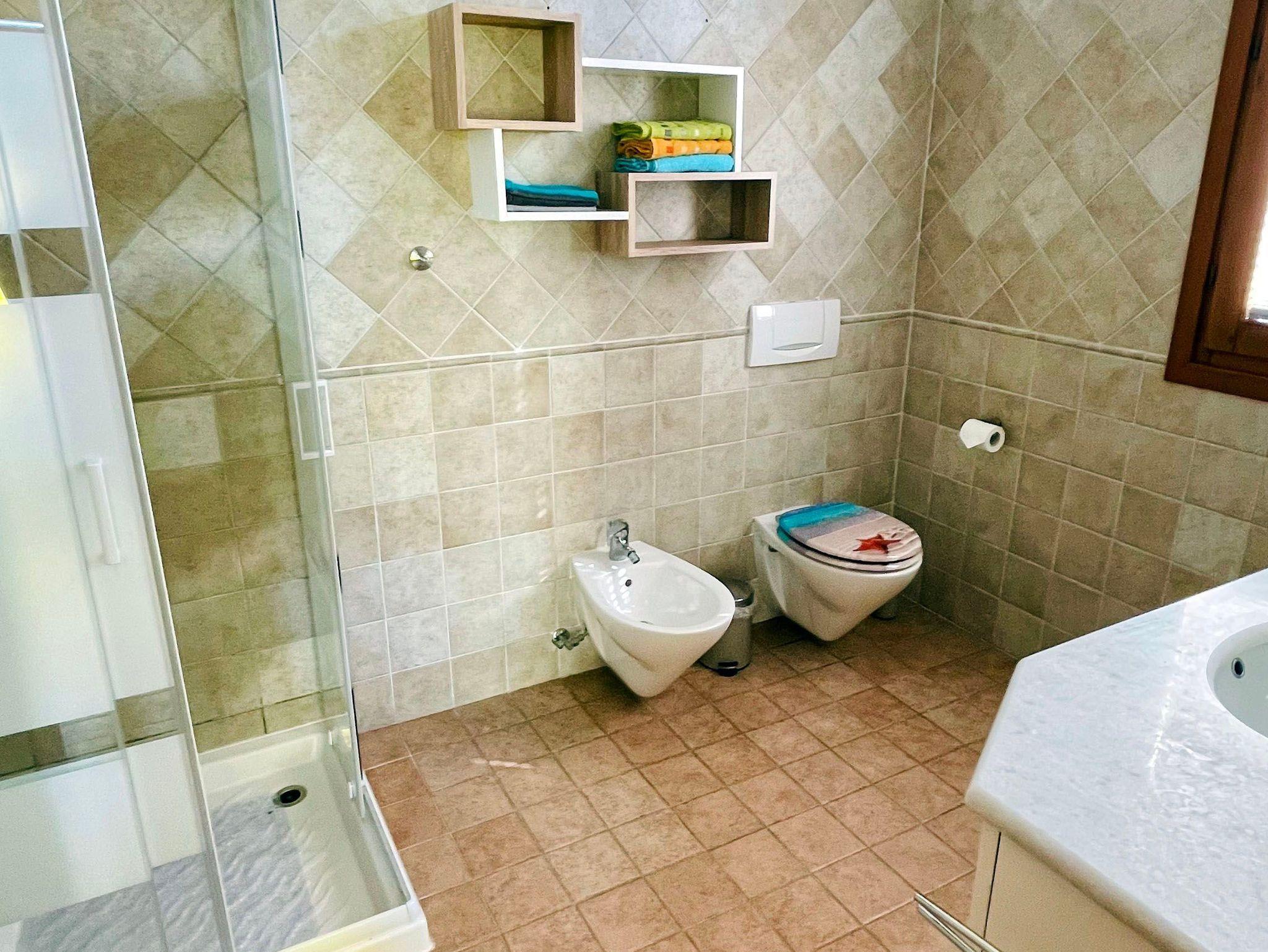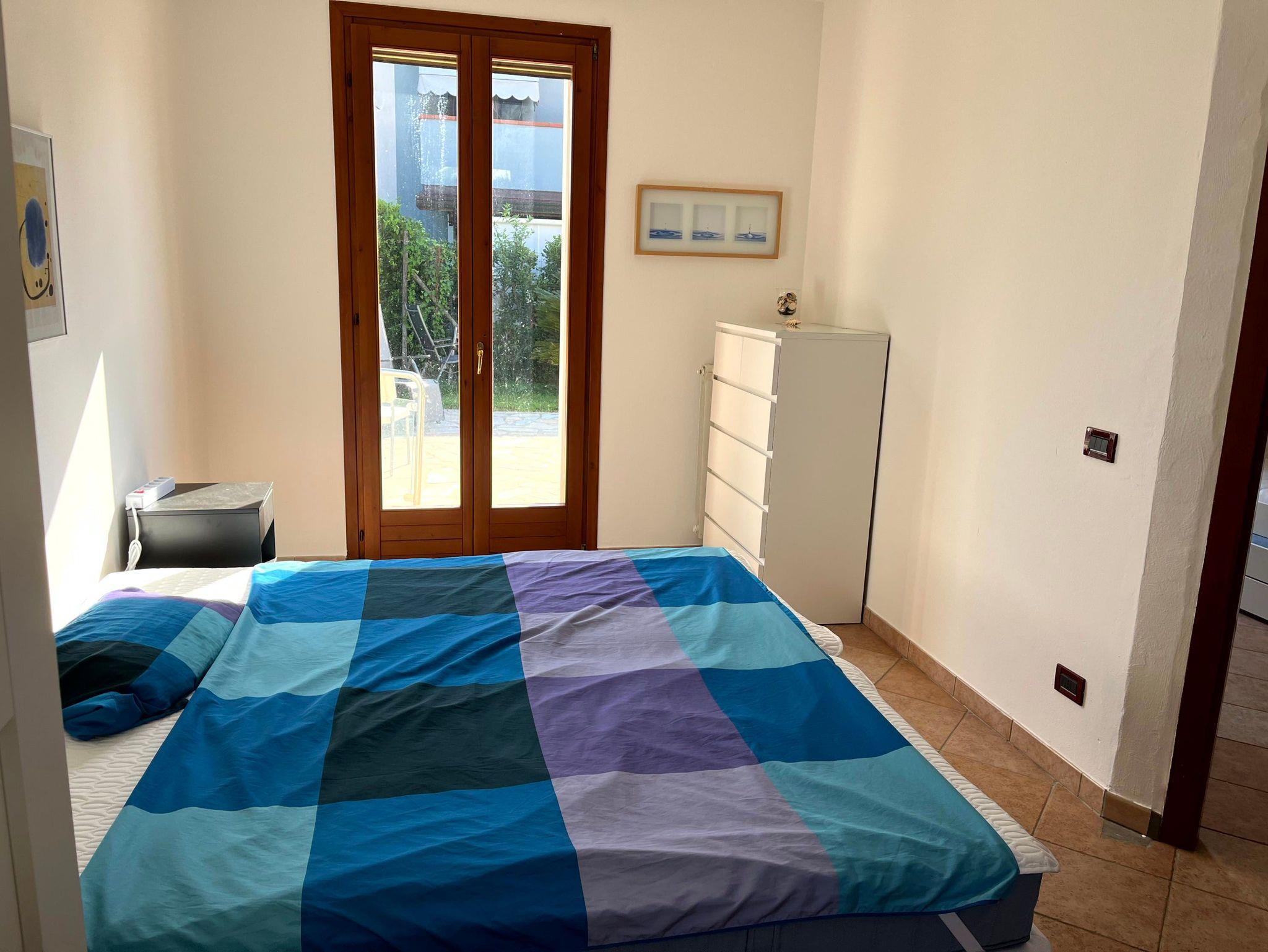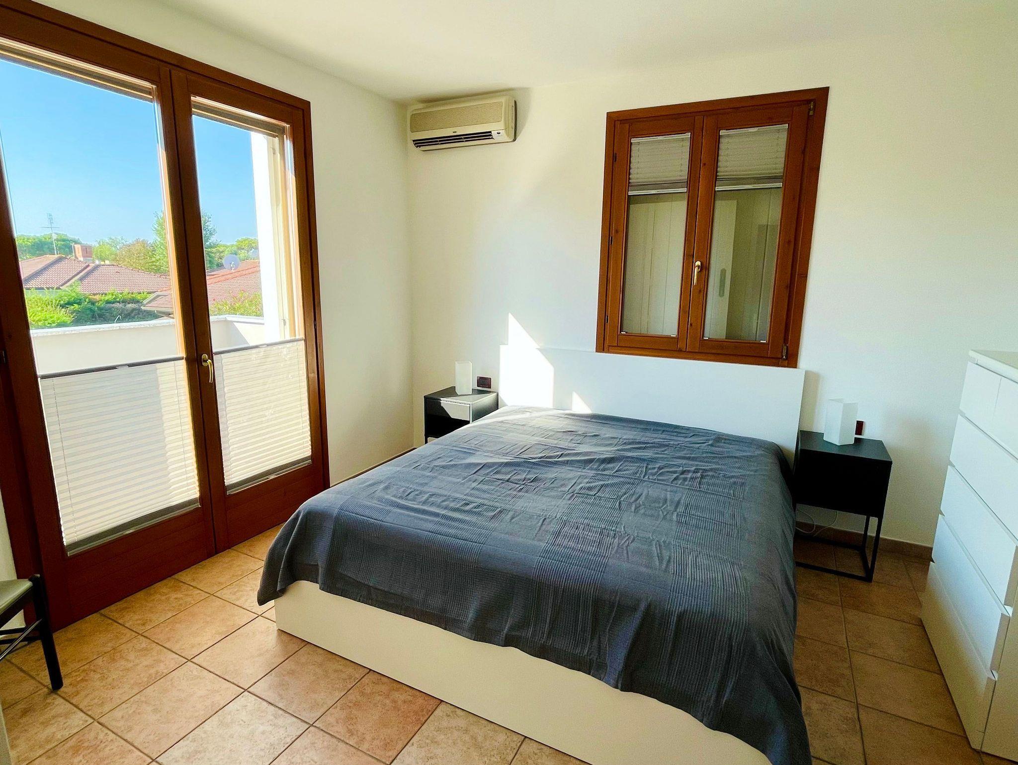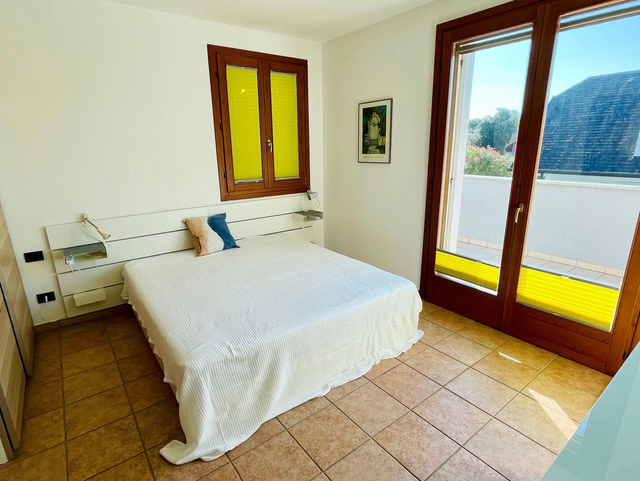 Ein Schlafzimmer mit Klimaanlage und 180 x 200 cm-Doppelbett, Schiebetüren-Schrank mit eigenem Bad (en suite) mit Dusche, Bidet und Wc, Zugang zum großen Süd-Balkon