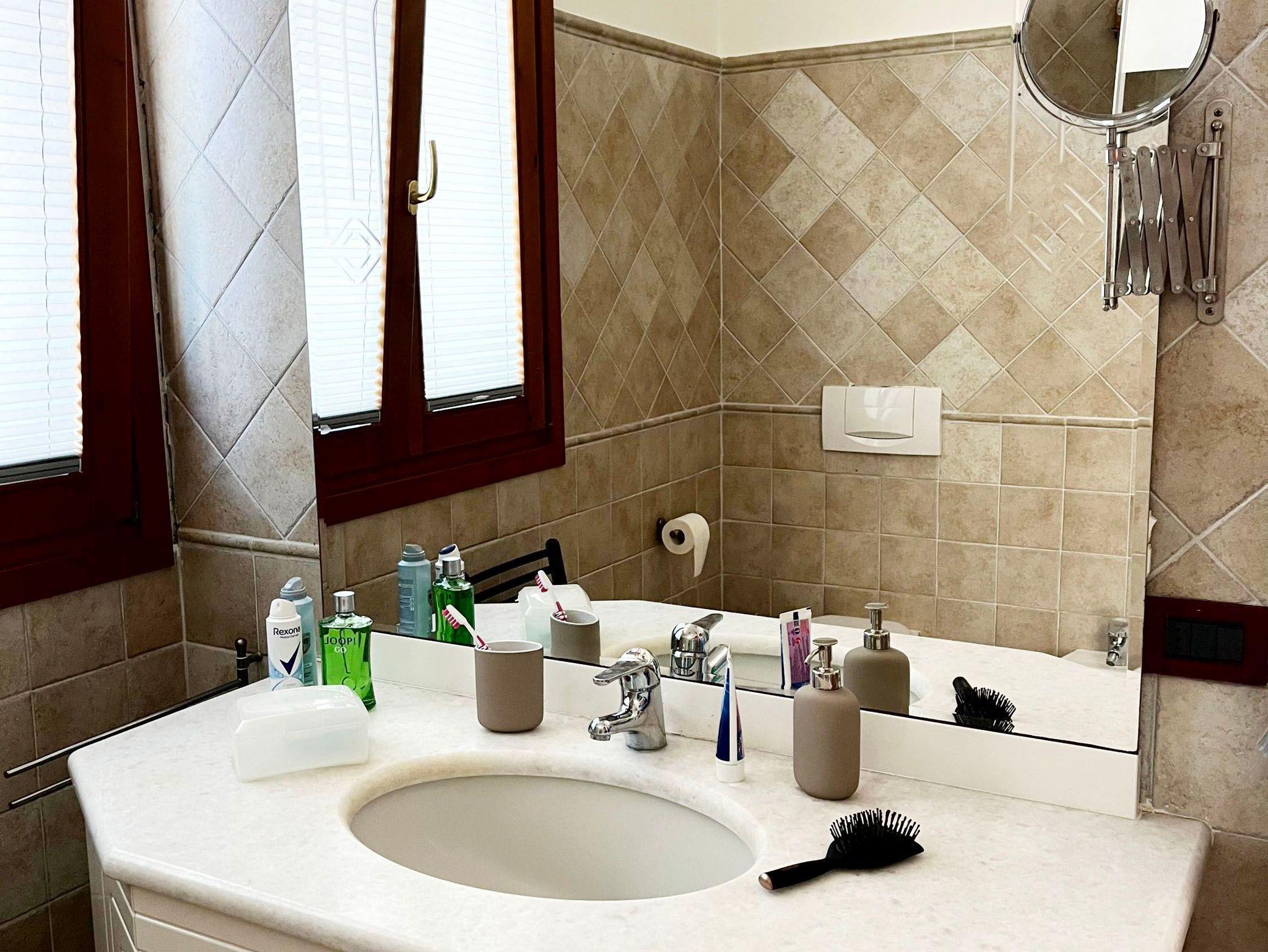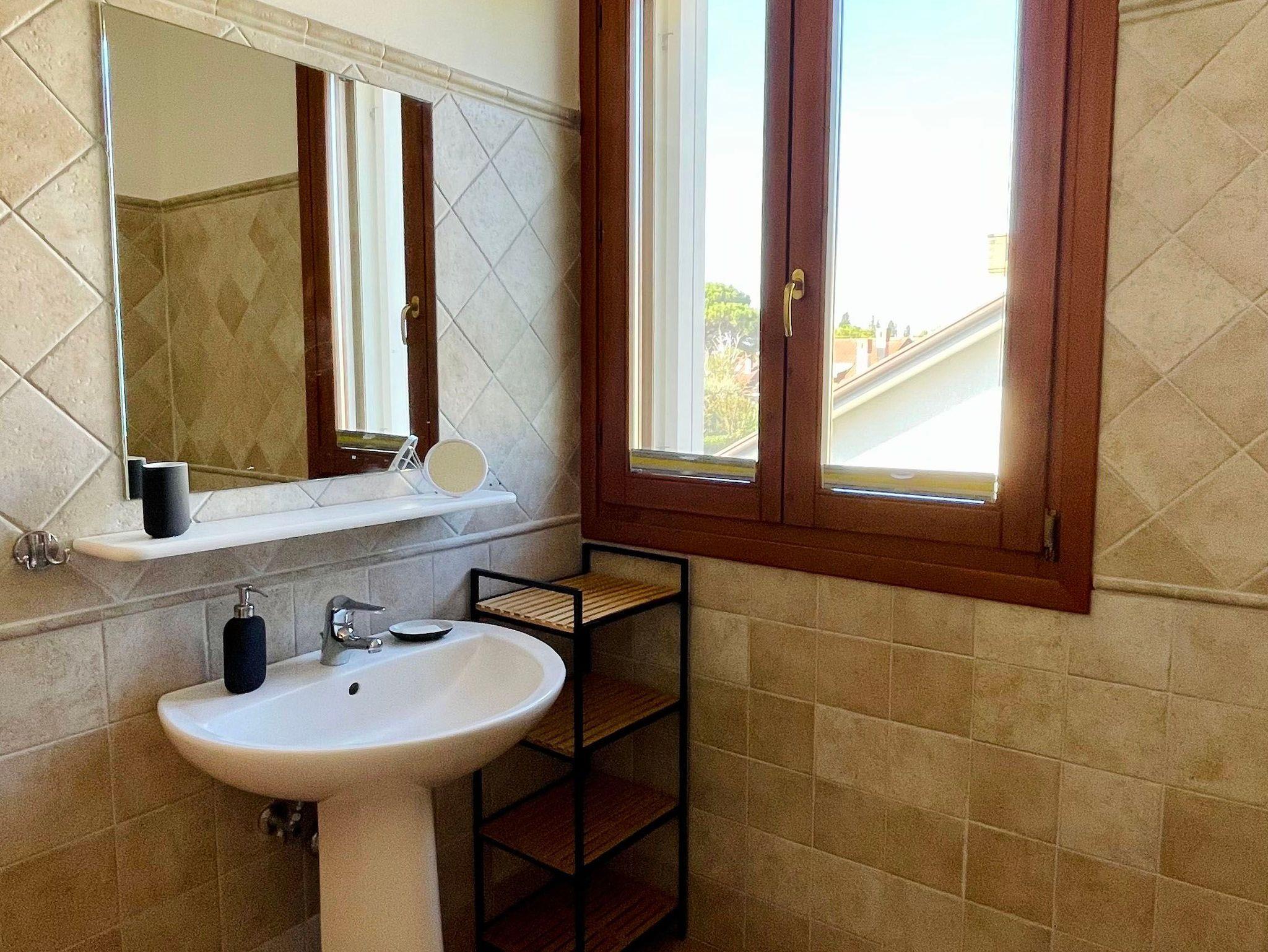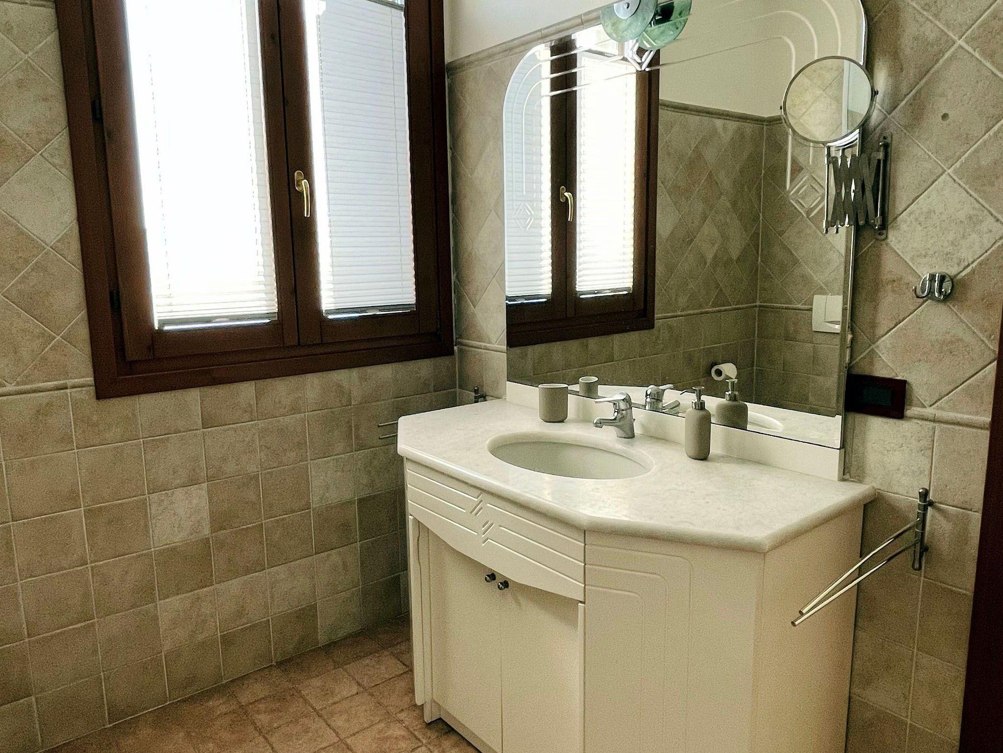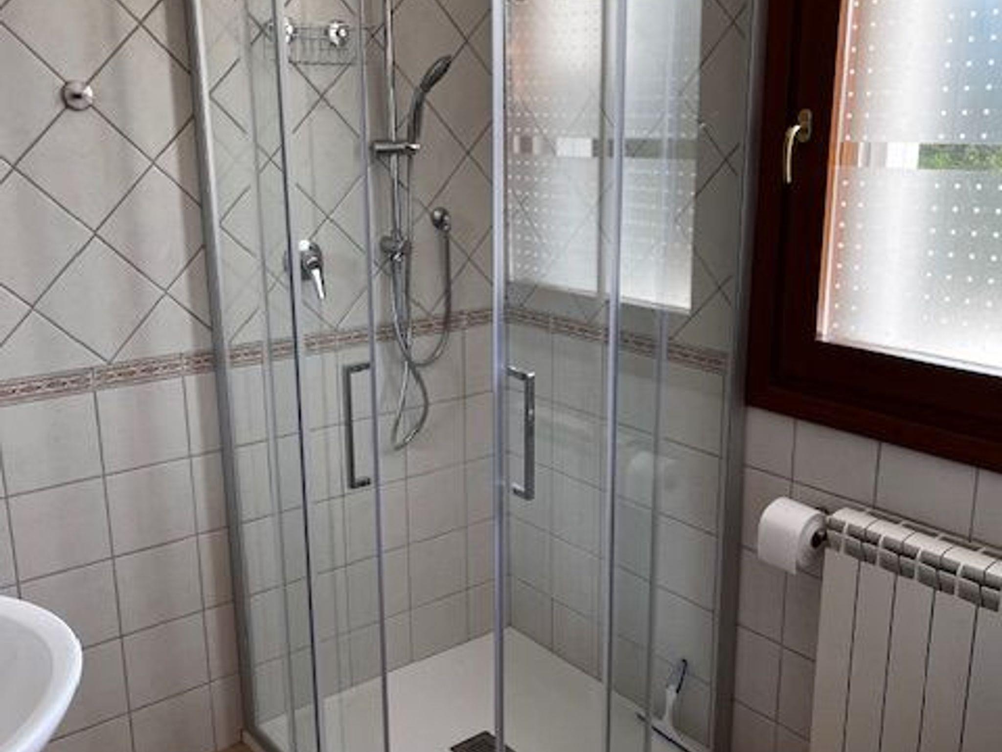 Ein Schlafzimmer mit Klimaanlage und 180 x 200 cm-Doppelbett, Schiebetüren-Schrank mit eigenem Bad (en suite) mit Dusche, Bidet und Wc, Zugang zum großen Süd-Balkon