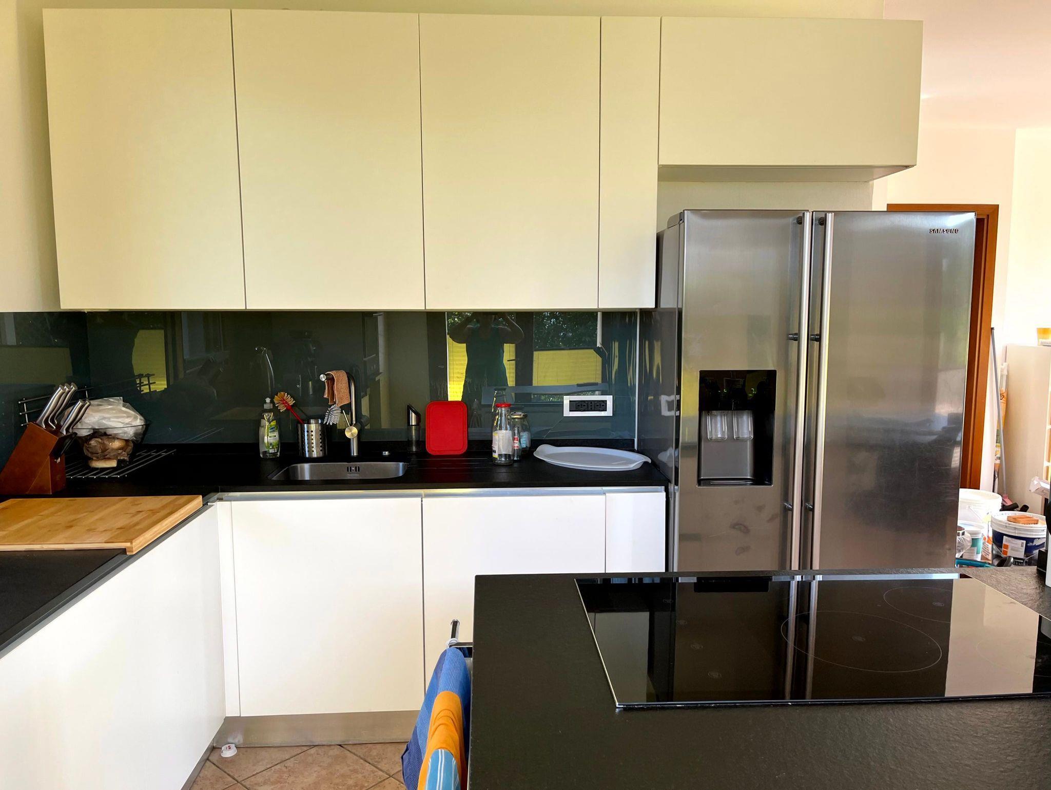(Küchenausstattung: Backofen, Induktions-Herd, Mikrowelle, Sage Siebträger-Kaffeemaschine, Spülmaschine, große Side-by-Side, Kühl-Gefrier-Kombination mit Eiswürfelbereiter und ausreichend Geschirr)