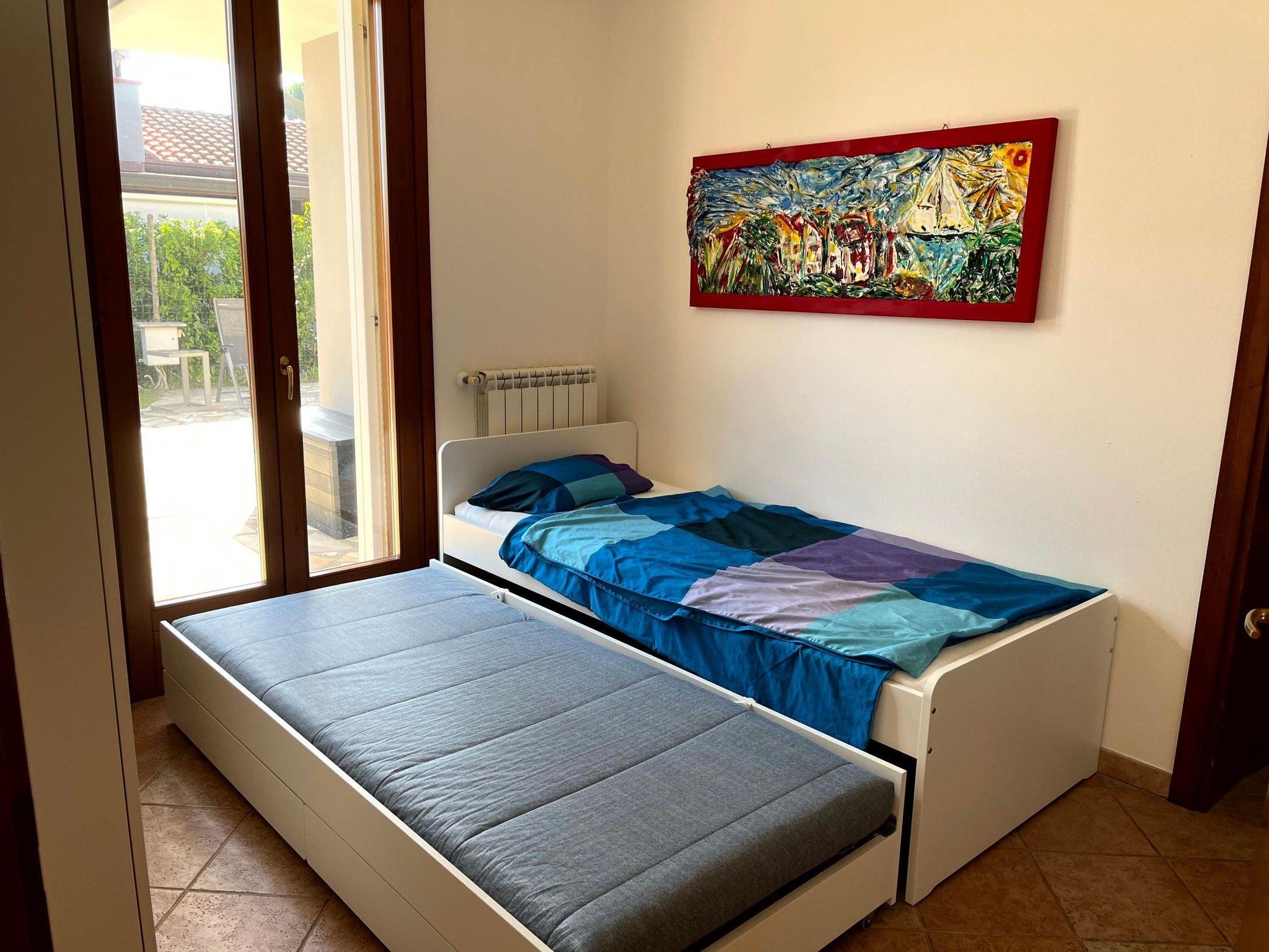 Ein Schlafzimmer mit Klimaanlage, zwei 90 x 200 cm-Betten (á max. 80 kg), zusätzlicher Zugang zur Terrasse