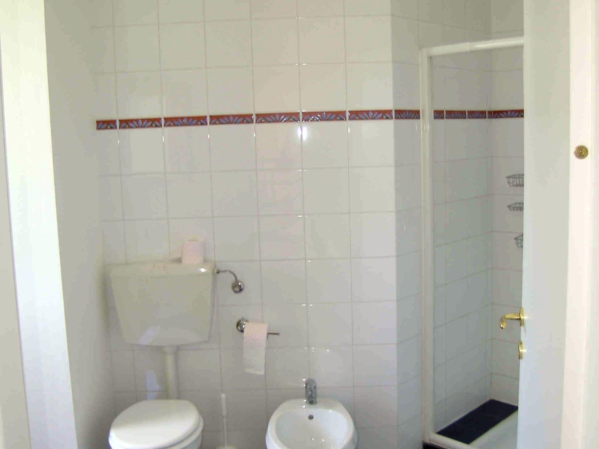 • Ein Schlafzimmer mit einem Doppelbett, Klimaanlage und eigenem Bad, Dusche, WC, Bidet