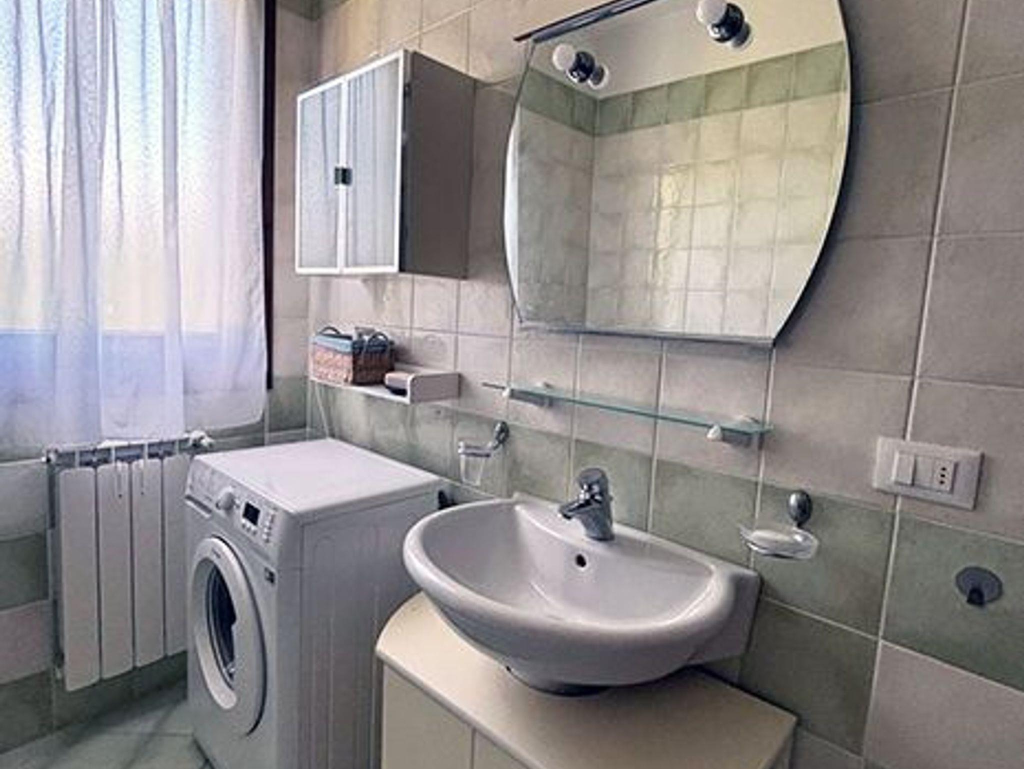 • Ein Badezimmer mit Dusche, Waschbecken, Bidet, WC, Handtuchhalter und Waschmaschine.