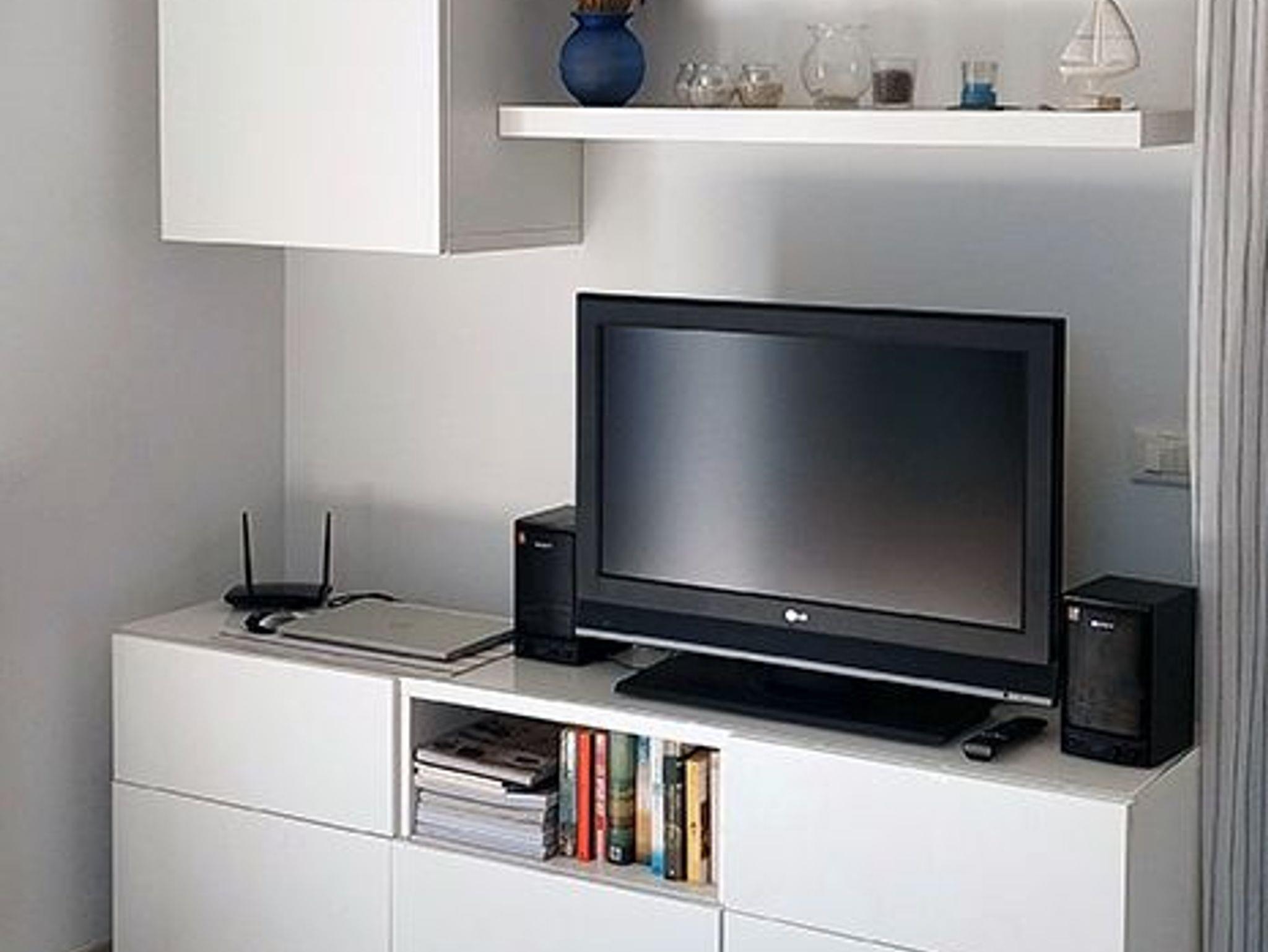 • Gemütliches Wohnzimmer mit Sofa, Smart-TV und Stereolautsprechern.