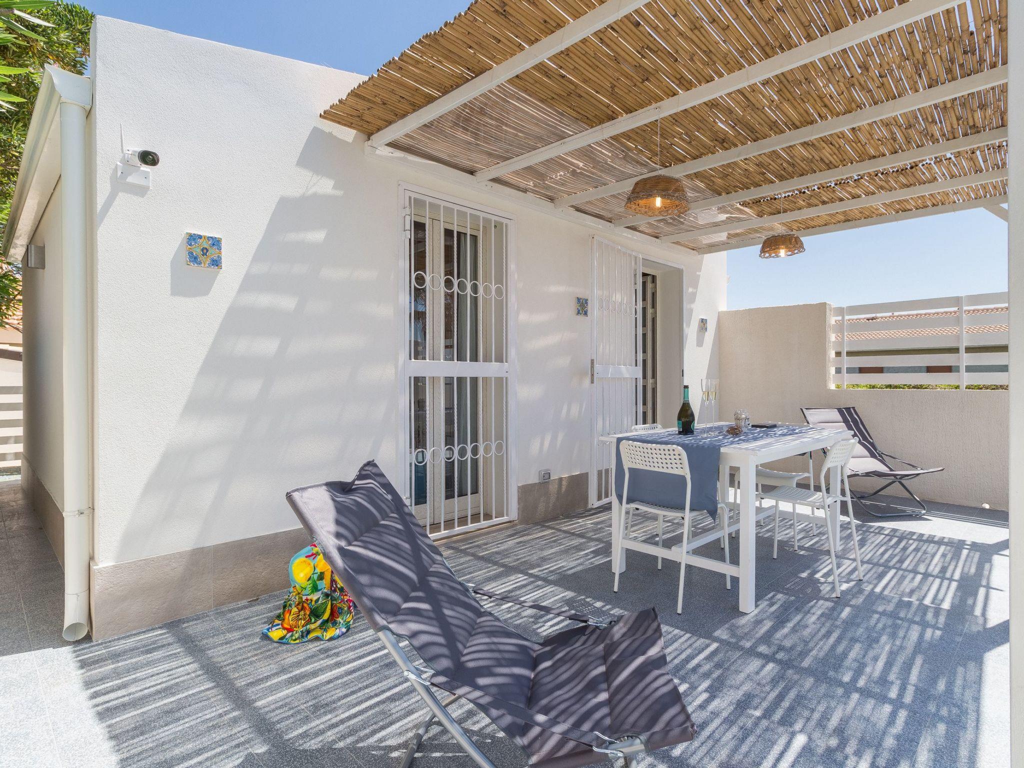Sie verfügt über eine elegante, teilweise überdachte Terrasse mit einem Esstisch und einem Grill.