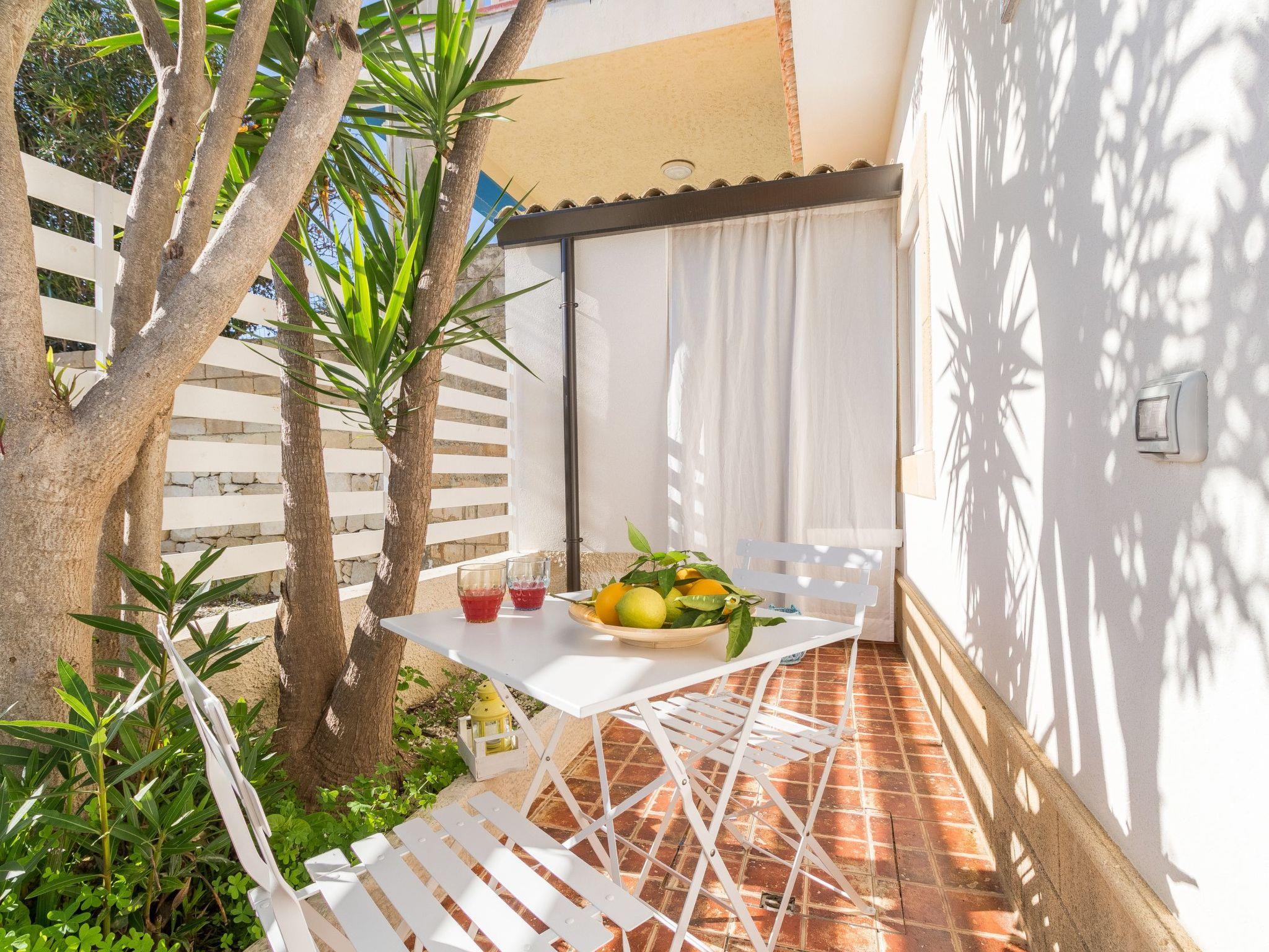 Rückseitig bietet es eine weitere Terrasse mit Tisch und Stühlen.