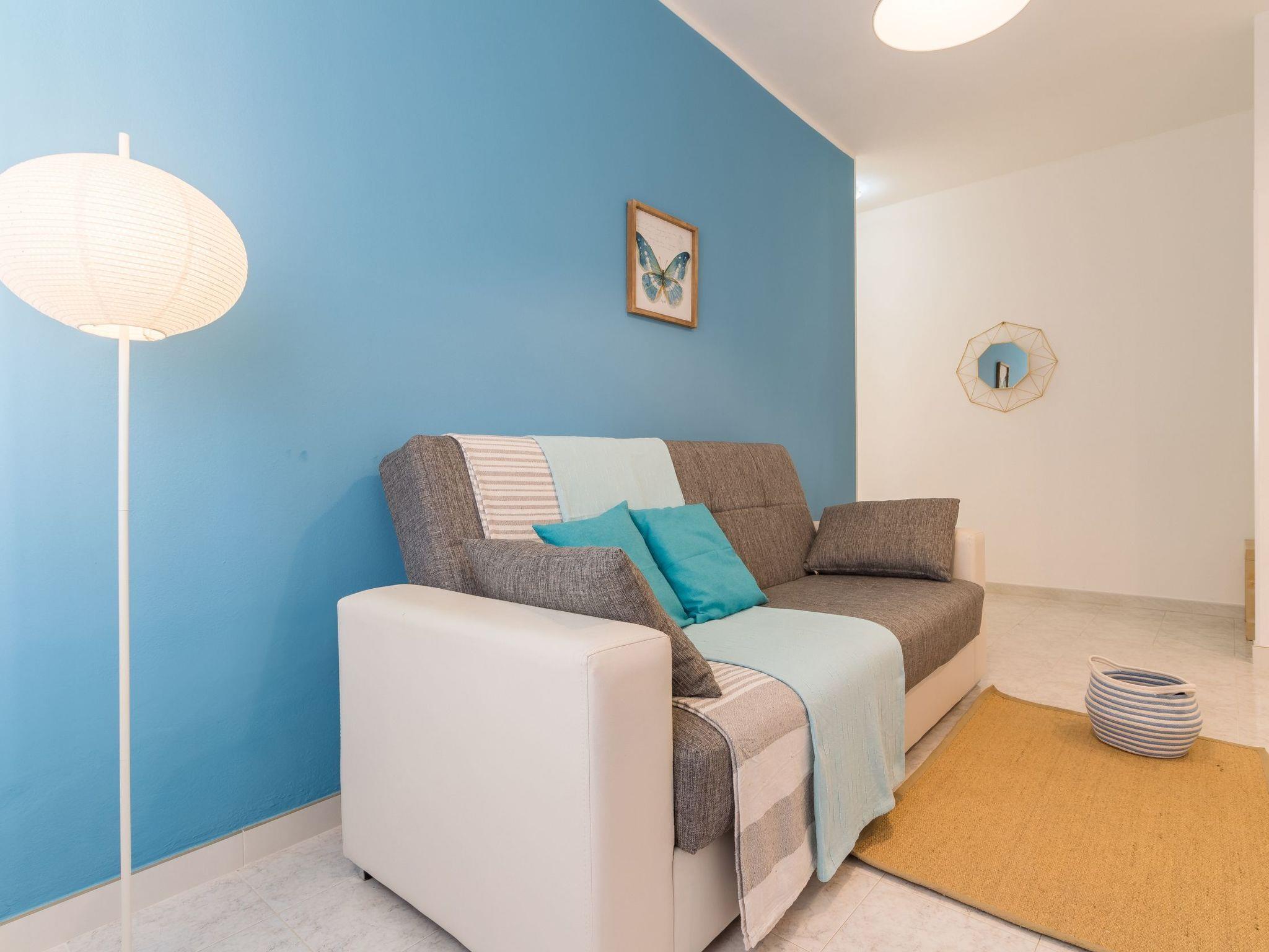 Das Wohnzimmer ist mit Schlafcouch und TV ausgestattet.