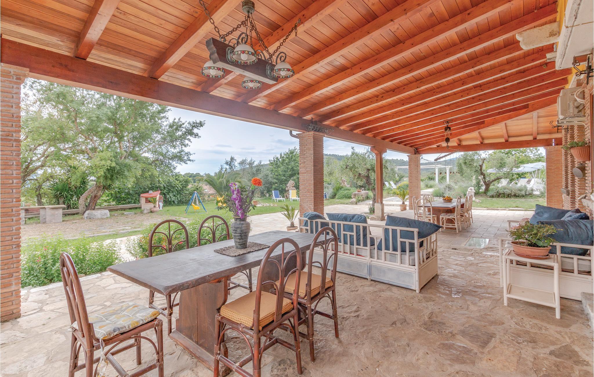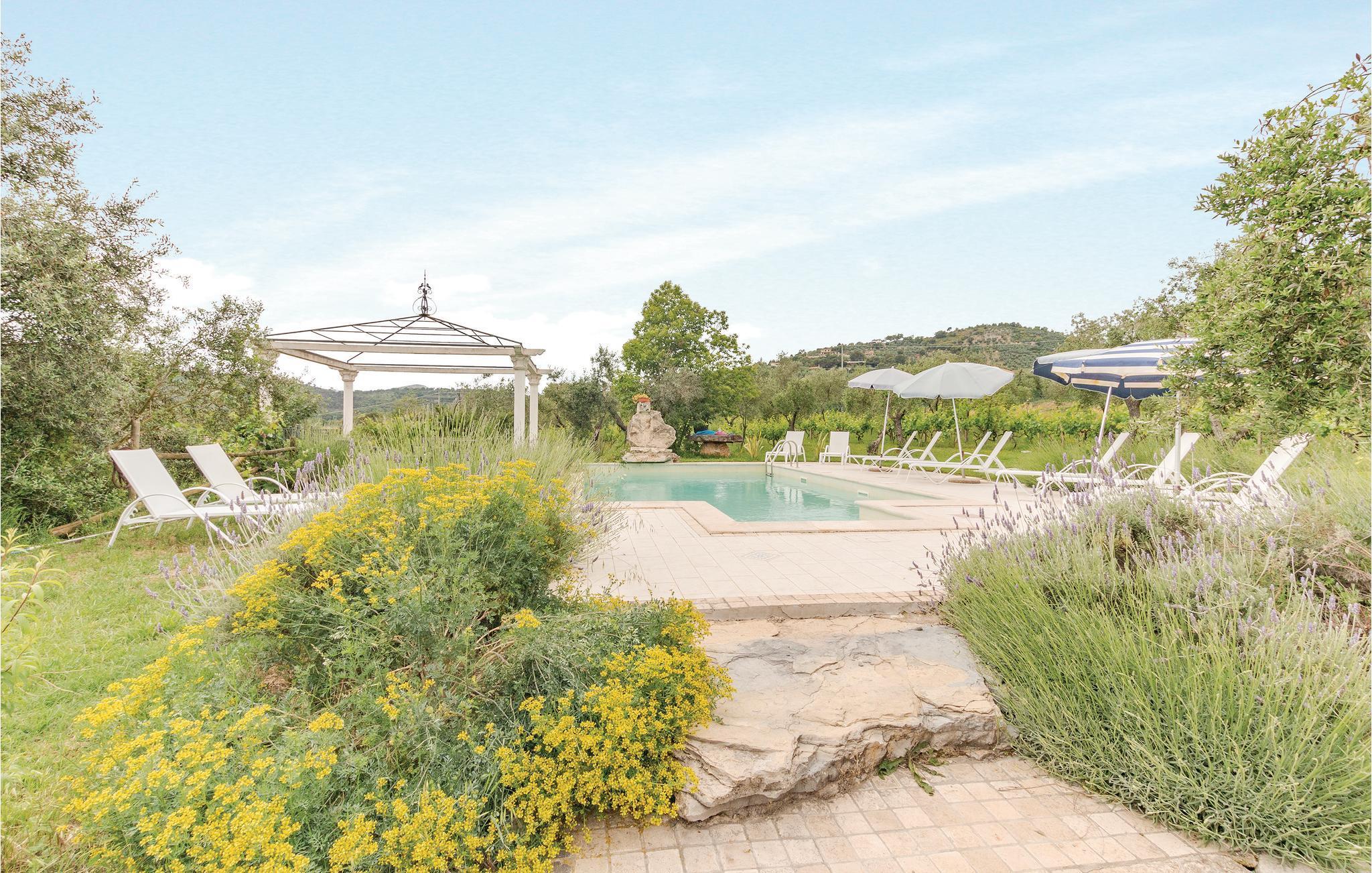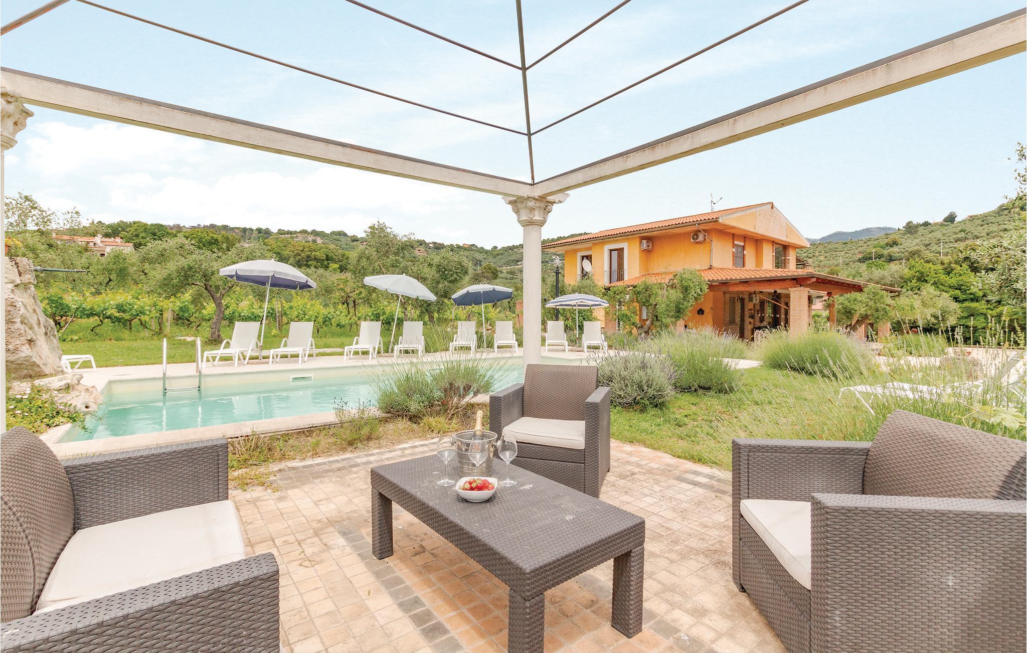 Große und gut ausgestattete Ferienvilla mit Privatpool, nur 10 km vom Strand von Sperlonga mit seiner malerischen Altstadt und archäologischen Stätten entfernt. Es liegt auf einem 1,5 Hektar großen Anwesen mit Olivenhainen, Weinbergen und Eichen, ein wahres Stückchen Paradies inmitten der grünen mediterranen Vegetation der Region Latium. Es liegt auf einem 1,5 Hektar großen Anwesen umgeben von Olivenbäumen, Weinbergen und Eichen, der ideale Ort also für einen ruhigen Urlaub in der Natur, ohne aber auf die Nähe der bekannten Touristenzentren verzichten zu müssen: Formia mit seinen Shoppingmöglichkeiten, dem Hafen und den Fähren zu den Inseln (12 km); Gaeta mit seinen ausgestatteten Strandbädern, dem Naturpark Monte Orlando und die mittelalterlichen Denkmäler der Altstadt (13 km); Sperlonga mit seinem malerischen Zentrum und archäologischen Stätten (10 km). In etwas mehr als eine Stunde erreicht man Rom und Neapel, ideale Ziele für ihre Tagesausflüge. Den Gäste steht ein großer rechteckiger und sandfarbiger Pool ausgestattet mit Sonnenliegen, ein großer Pavillon mit Sofas, eine Außendusche und eine geräumige Grillecke zur Verfügung . Das Haus besteht aus zwei Einheiten, diese sind intern nicht miteinander verbunden. Eine große, mit Tischen und Sofas möblierte, Terrasse erlaubt es den Gästen die kühlen Sommerabenden und ihre Mahlzeiten im Freien zu genießen. Der Wohnbereich erstreckt sich über zwei Etagen und besteht aus zwei, im inneren nicht miteinander verbundenen Einheiten. Erdgeschoss: Wohnung mit vier Doppelzimmern, zwei davon mit eigenem Bad, in einem der größeren Schlafzimmer gibt es die Möglichkeit eines Zustellbettes, ein großes Bad mit separater Dusche, ein geräumiger Wohnbereich unterteilt sich in Wohnzimmer mit Sofas und Sat-TV und Essbereich mit großem Tisch im venezianischen Stil. Die herrliche Küche bietet direkten Zugang zur großen Terrasse mit Gartenblick . Die erste Etage ist unabhängig vom Erdgeschoss: großer Eingangs- und Wohnbereich mit Kamin und helle Küche mit Blick auf die grüne Landschaft und eine mit Tischen und Stühlen ausgestattete Terrasse. Hier gibt es drei Doppelzimmer und zwei Bäder mit Dusche.
