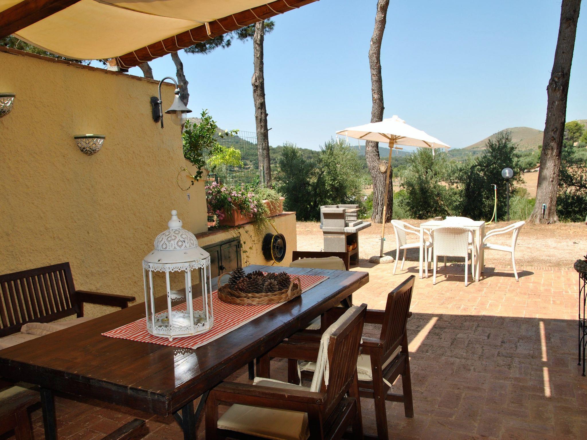 Geräumiger Außenbereich mit überdachter Terrasse, ausgestattet mit Tisch, um die Tage im Freien zu genießen, Grill, Sofa. Pool mit Meerblick zur gemeinsamen Nutzung mit anderen Gästen.