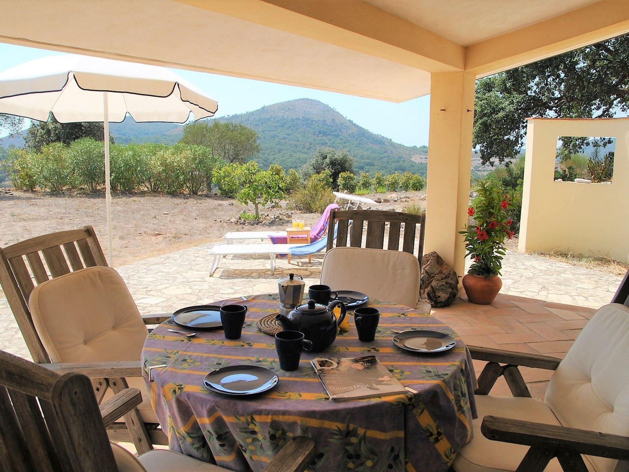 Eine überdachte Terrasse mit Tisch und Stühlen, Liegestühlen und Sonnenschirm bietet einen großen Außenbereich, in dem man sich herrlich entspannen und das Panorama und die Kühle der Hügel in aller Ruhe genießen kann.