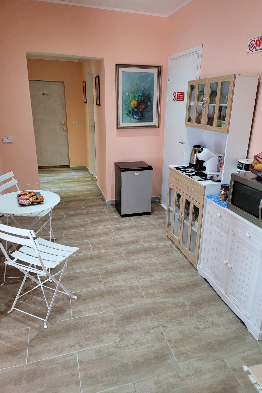 Das Innere dieser Wohnung, die sich im Erdgeschoss unserer Villa befindet, ist ohne architektonische Barrieren zugänglich und ist perfekt ausgestattet, um Ihnen einen komfortablen Aufenthalt zu garantieren. Wir bieten Ihnen ein gemütliches Doppelzimmer und zwei Einzelzimmer, von denen eines mit einem Doppelbett ausgestattet ist. Obwohl wir nicht über eine traditionelle Küche verfügen, finden Sie hier alles, was Sie für die Zubereitung von Frühstück und kleinen Mahlzeiten brauchen: einen Mini-Kühlschrank, einen Wasserkocher, eine Mikrowelle, eine Kaffee- und Cappuccinomaschine und einen Toaster. Die Wohnung verfügt auch über ein modernes Bad mit Dusche und allen wichtigen Annehmlichkeiten, um Ihnen einen angenehmen Aufenthalt zu gewährleisten.