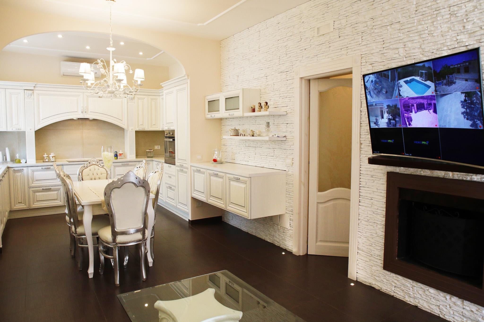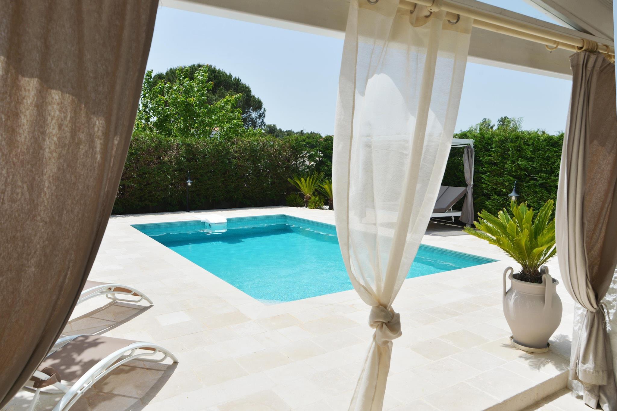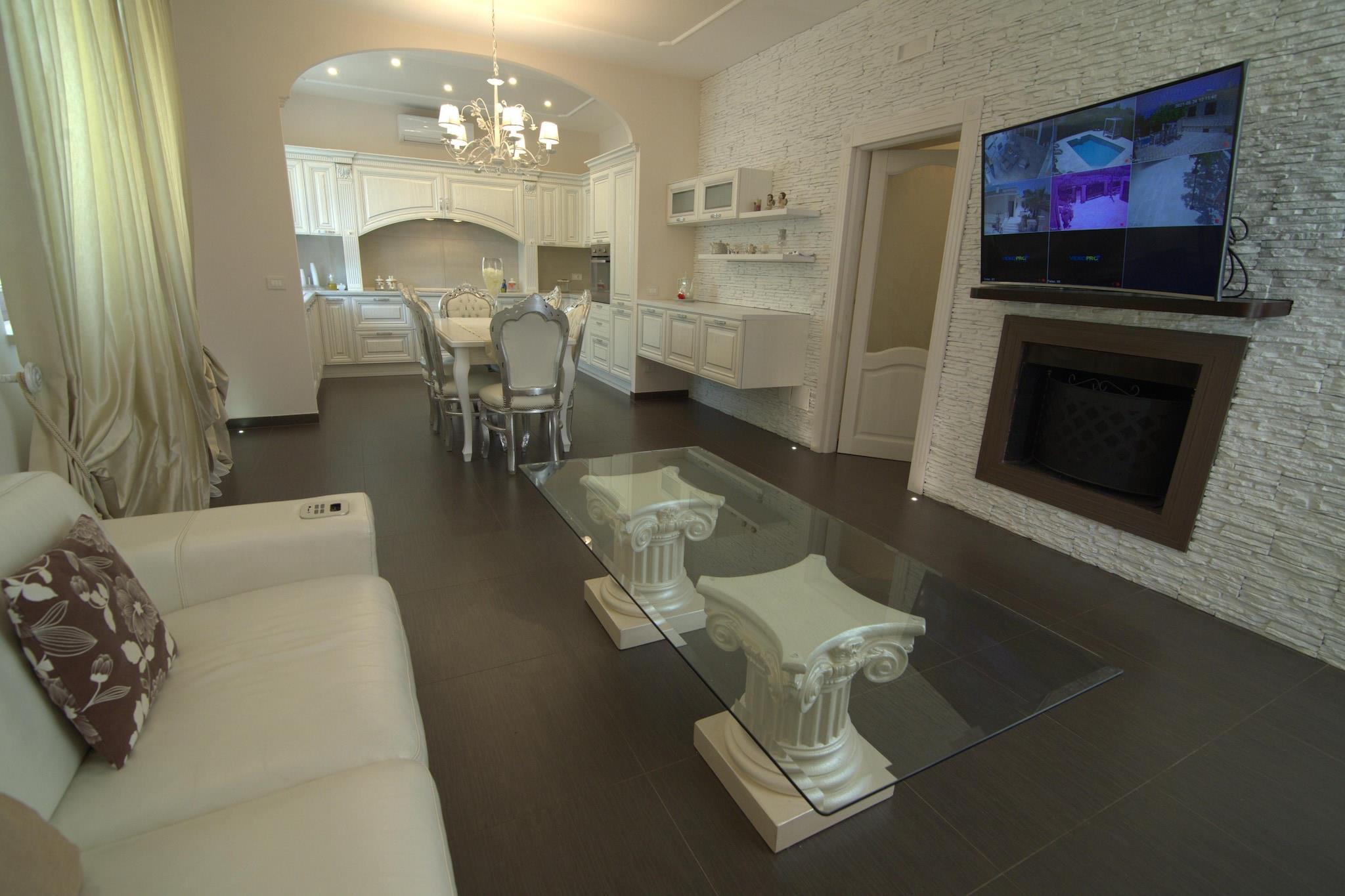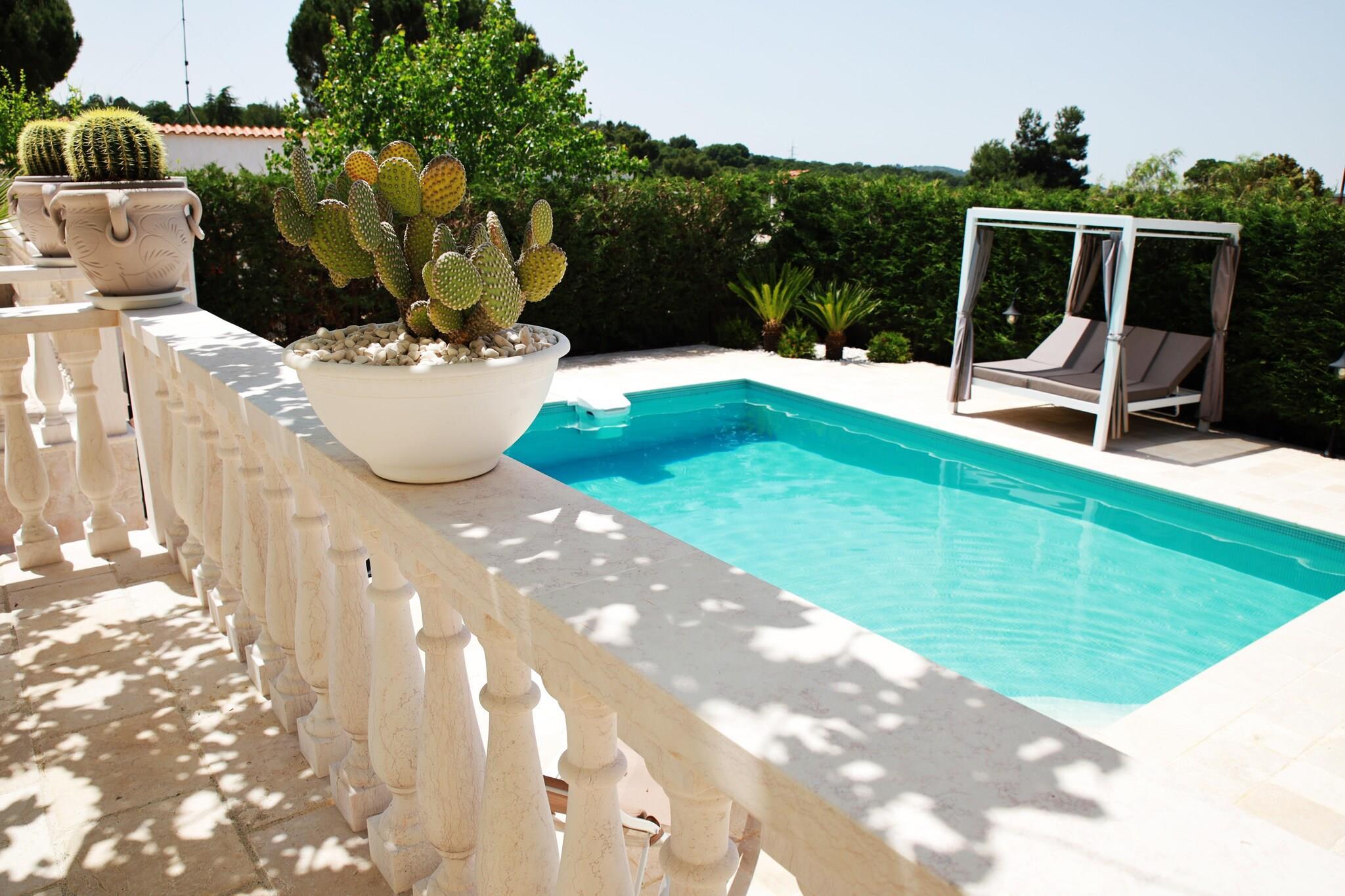Parterre: (offene Küche(Kochplatte(elektrisch), Backofen, Kühlschrank), Wohn/Esszimmer(TV, Kaminofen, Klimaanlage), Schlafzimmer(Doppelbett, Klimaanlage), Schlafzimmer(Doppelbett, Klimaanlage), Schlafzimmer(Doppelbett, Klimaanlage), Schlafzimmer(Etagenbett, Klimaanlage), Badezimmer(Dusche, Toilette, Bidet), Badezimmer(Dusche, Toilette, Bidet)) Grill, Waschmaschine, Terrasse(überdacht), Terrasse(überdacht), Garten, Liegen, Pool(alleinige Nutzung, im Garten, 7 x 5 m.), Gartenlounge