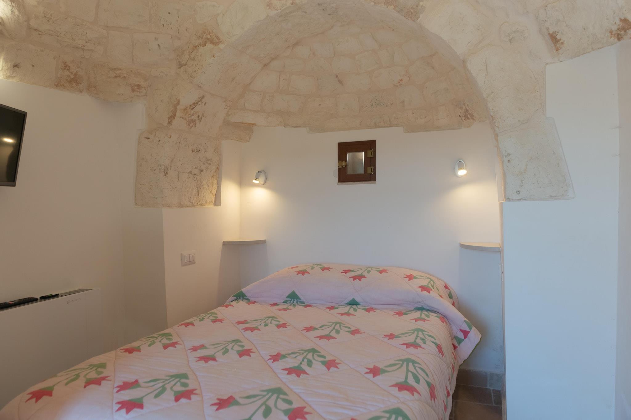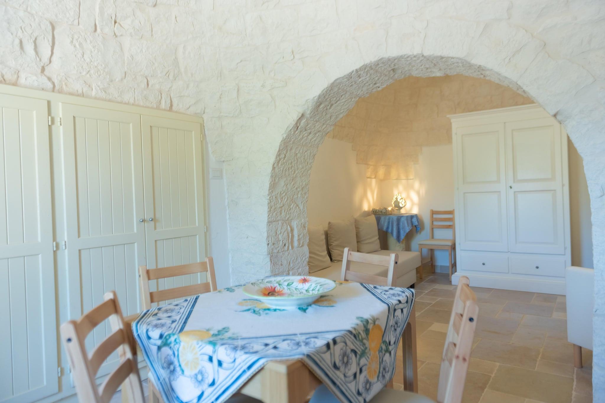 Trulli Cesare - ein bezauberndes Refugium in den Hügeln Apuliens. Eingebettet in die bezaubernde Hügellandschaft Apuliens im Itria-Tal bietet das „Trulli Cesare“ einen idealen Rückzugsort für alle, die Entspannung und Komfort in einer malerischen Umgebung suchen. Details zur Unterkunft: Die Hauptwohnung besteht aus einem Schlafzimmer mit Doppelbett, einem geräumigen Eingangsbereich mit komplett ausgestatteter Küche, einem Wohnzimmer mit Doppelschlafcouch und einem Badezimmer. Die Dependance hat einen separater Eingang, ein Doppelbett und ein eigenes Bad. Der Außenbereich des Trulli ist wunderschön gepflegt und bietet alles, was man für einen erholsamen Aufenthalt braucht. Tauchen Sie ein in den bezaubernden Swimmingpool oder genießen Sie Ihre Mahlzeiten im großzügigen Entspannungsbereich im Freien, der auch einen Grill mit Panoramablick auf den Pool bietet. Das Trulli Cesare liegt strategisch günstig, um die wichtigsten touristischen Zentren des Itria-Tals und die atemberaubende Adriaküste von Polignano bis zum Dünenpark von Marina di Ostuni zu erreichen. Der Flughafen von Brindisi ist ca. 40 Autominuten und Bari nur eine Autostunde entfernt.