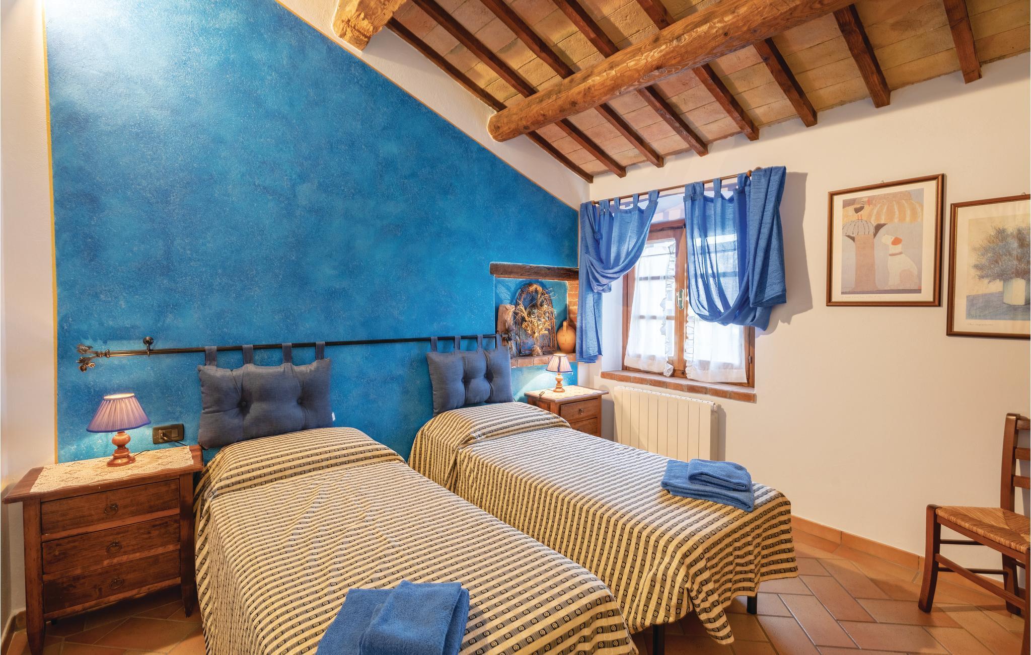 Ihr Feriendomizil besteht aus einem schönen Ferienhaus, einst eine Ölmühle, und der unabhängigen Wohnung im angrenzendem Nebengebäude, und es liegt an einer Hügelseite mit Ausblick auf den Trasimenischen See nahe des kleinen Orts Magione. Das Haus ist von einem großzügigen, eingezäunten Grünbereich umgeben und mit Kinderspielbereich, Bocciabahn und Panoramapool ausgestattet. Auf Anfrage und gegen Zahlung vor Ort sind folgende Zusatzleistungen möglich: Besichtigung der Inseln des Trasimenischen Sees, Kochservice für typische Mittagessen und Angeltage. Für Weinliebhaber sind Degustationen entlang den Weinstraßen "Strada del vino dei Colli del Tasimeno" bzw. "Strada dei vini Etrusco Romana" möglich. Die Lage ist ideal, um die faszinierenden Kunststädte Perugia (22 km), Assisi (46 km), Chiusi (36) km und Arezzo (56 km) zu besichtigen. Zwei Schlafzimmer befinden sich in der unabhängigen Wohnung im Erdgeschoss, die ausschließlich von aussen zugänglich ist und im Innern nicht mit dem Hauptgebäude verbunden ist.