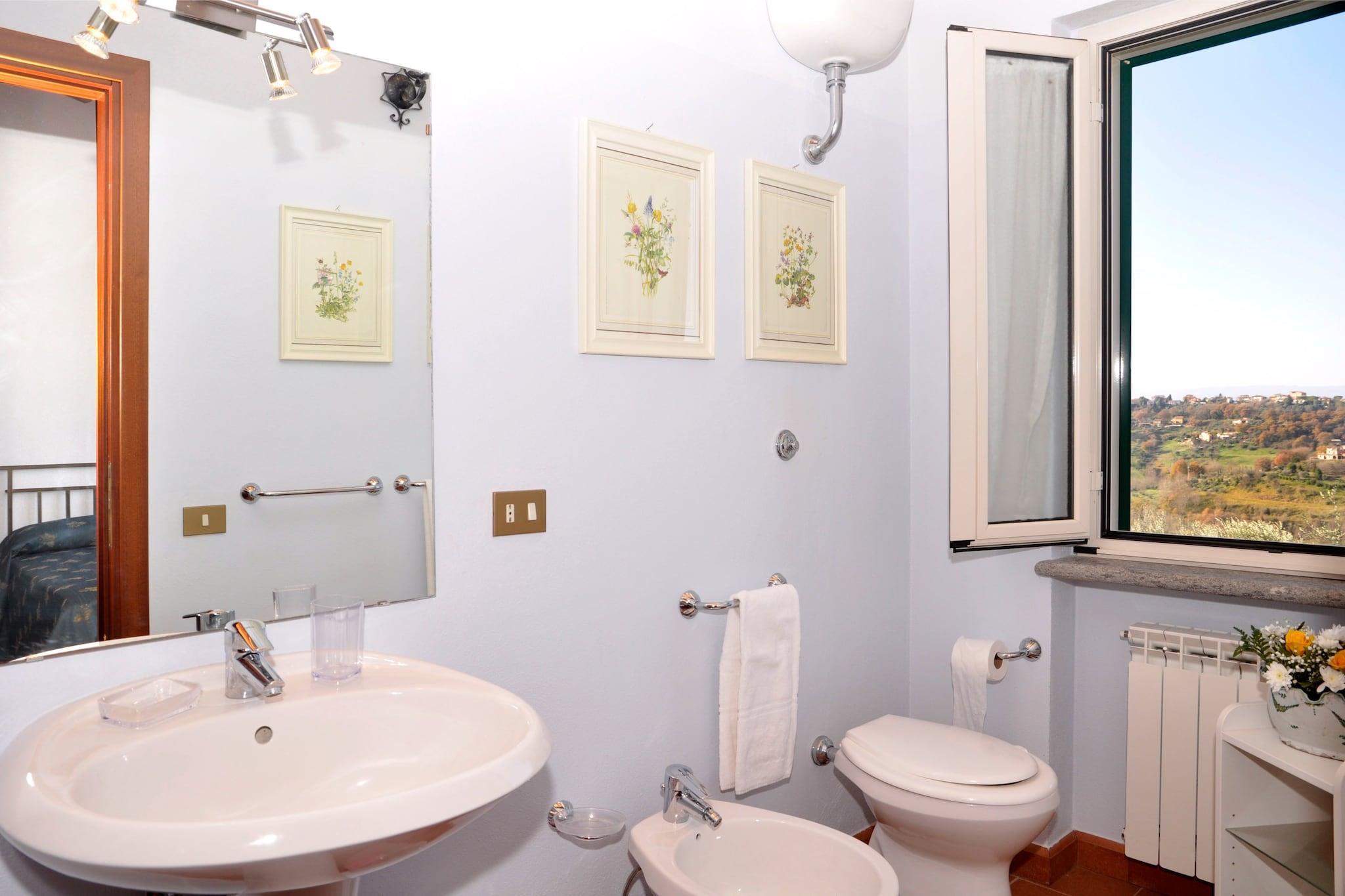 Schöne und geräumige unabhängige Villa mit Privatschwimmbad in der Region Lazio (Rom) an der Grenze zu Umbrien. Die Villa liegt auf einem Hügel und bietet dadurch eine schöne Aussicht auf die Weingärten und die umliegende Hügellandschaft. Die Villa wurde vollständig restauriert und verfügt über jeglichen Komfort. Sie gehört zu einem großen Besitz mit 3 weiteren Ferienhäusern. Die Villa bietet jeglichen Komfort und ausreichend Privatsphäre für die Gäste, sowie einen eigenen Garten mit Privatschwimmbad (ca. 15 m von der Villa entfernt und vom Wohnzimmerfenster aus zu sehen), Grillmöglichkeit und eine Terrasse mit toskanischem Cotto-Boden. Im Erdgeschoss dieser Villa befindet sich ein Schlafzimmer mit einem behindertengerechten Badezimmer. Weitere Dienstleistungen (gemeinsam) wie: Tennis, kleiner Fußballplatz, Tischtennis, sind im Haupthaus zu finden (Agritourismus), das ungefähr 300 Meter von der Villa entfernt liegt. Die Villa ist ein idealer Ausgangspunkt für Ausflüge in die nähere Umgebung: das Reatina-Tal mit den Wallfahrtsorten der Franziskaner-Mönche, das Kloster von Farfa, die romanischen Kirchen Vescovio und Santa Vittoria, die archäologischen Stätten und die antiken römischen Städte Trebula Mutuesca und Forum Novum mit der Stadt Rieti. Über Panoramastraßen sind die Seen von Bracciano und Bolsena, sowie weitere bekannte Kunststädte Mittelitaliens zu erreichen. Rom liegt ganz in der Nähe und ist leicht mit dem Zug oder mit dem Auto zu erreichen. Bei Ankunft erhalten die Gäste einen Korb mit einigen Lebensmitteln (Milch, Wasser, Wein, Brot, Öl, Kaffee, usw.).