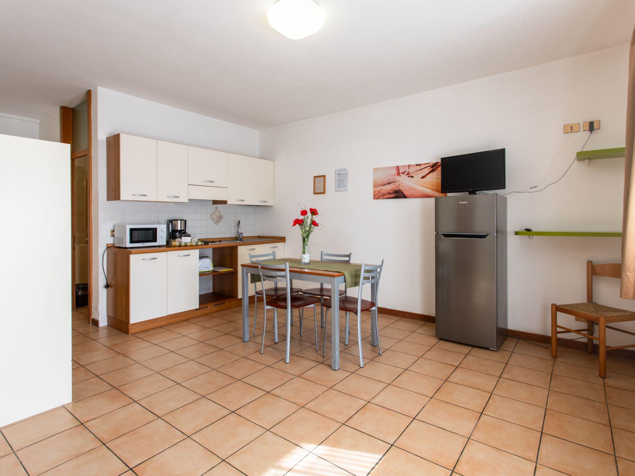 Die Terrasse ist mit Liegestühlen, Tisch, Stühlen und Sonnenschirm ausgestattet. Die Wohnung ist geeignet für diejenigen mit Kindern, weil, ohne Stufen, können sie direkt Zugang zum Dorfbereich, die vollständig eingezäunt ist.