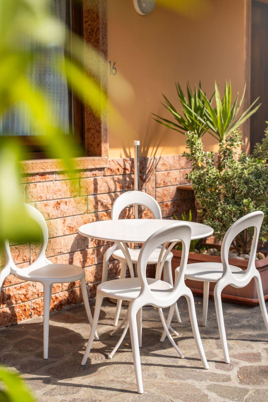 Die Terrasse ist mit Liegestühlen, Tisch, Stühlen und Sonnenschirm ausgestattet. Die Wohnung ist für Personen mit Kindern geeignet, da sie ohne Stufen direkten Zugang zum Dorfbereich haben, der komplett eingezäunt ist.