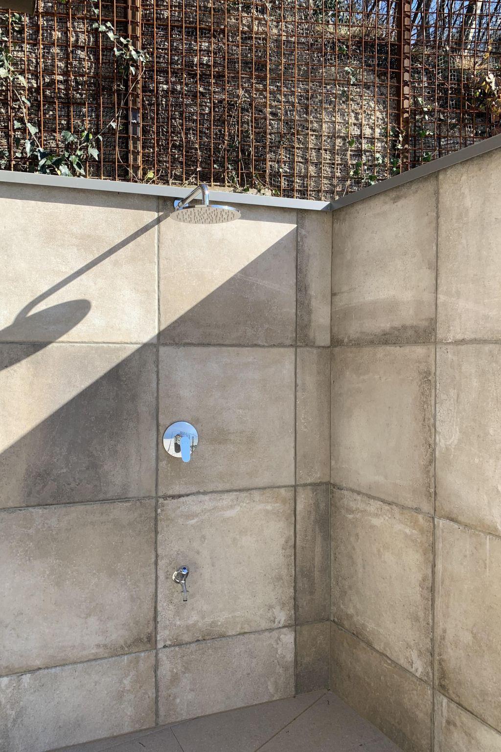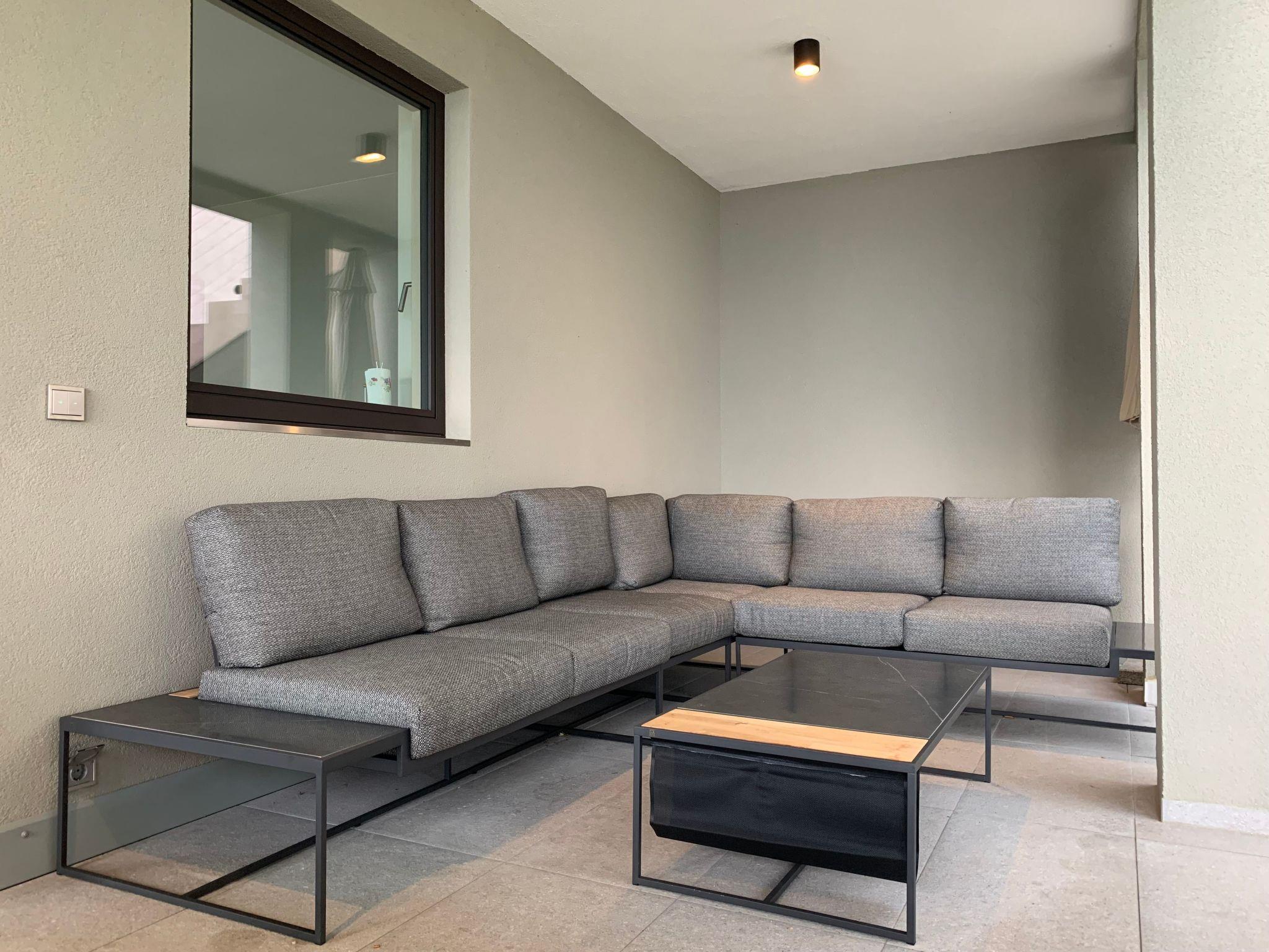 Erdgeschoss: Terrasse mit Überdachung und Beschattungsmöglichkeit. Sitzecke, Esstisch mit Stühlen. Gartenliegen. Eine Außenstiege führt zur Terrasse des Obergeschoss wo sich eine Warmwassertusche befindet. Weitere Liegen und Sonnenschirme sind dort und hinter dem Haus befindet sich eine Gartenanlage