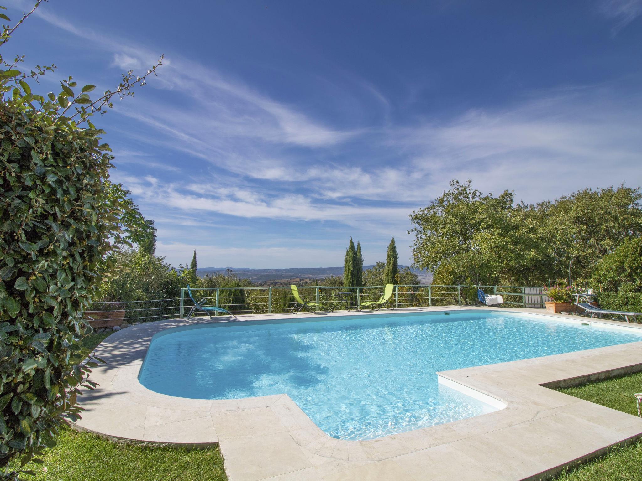 Das Anwesen liegt auf einem Hügel mit fantastischer Panoramasicht bis zum Meer und den Inseln Giglio und Montecristo (480 m.ü.M). Oberhalb der kleinen mittelalterlichen Dörfer Montemerano und Saturnia gelegen, bekannt für die warmen, natürlichen Wasserfälle und die Thermalbäder. Schöne, freistehende Villa 480 m.ü.M., auf 2 Stockwerken. Im Weiler Poderi, 7 km vom Zentrum von Saturnia, 3 km vom Zentrum von Montemerano, 3 km vom Zentrum von Manciano, ruhige, sonnige Lage auf einem Hügel, 50 m vom Waldrand, 3500 km vom Meer, 35 km vom Strand, im Grünen. Zur Alleinbenutzung: Grundstück 2'000 m2 (eingezäunt), wunderschöner Garten zum Entspannen, Schwimmbad (7 x 14 m, 110 - 170 cm tief, saisonale Verfügbarkeit: 01.Jun. - 30.Sep.) mit Innentreppe und Salzelektrolyse-Reinigungssystem. Aussendusche, Terrasse, Gartenmöbel, Grill, Poolpflege durch den Besitzer/Gärtner. Im Hause: Waschmaschine. Wohnungsreinigung möglich (extra). Parkplatz. Einkaufsgeschäft 2 km, Supermarkt 3 km, Restaurant 2 km, Bäckerei 2 km, Café 2 km, Fahrradverleih 4 km, Bushaltestelle 200 m, Bahnstation "Orbetello" 35 km, Sandstrand "Giannella - Feniglia" 37 km, Thermalbad "Saturnia" 8 km, Badesee "Bolsena" 46 km. Golfplatz (18 Loch) 8 km, Tennis 6 km, Reitstall 6 km, Wanderwege ab Haus 50 m. Nahe gelegene Sehenswürdigkeiten: Pitigliano 20 km, Scansano 25 km, Capalbio 30 km, Monte Argentario 35 km, Grosseto 55 km. Bekannte Seen in der Umgebung sind gut erreichbar: Bolsena 45 km. Bitte beachten: Fahrzeug empfohlen. Ein Teil des Hauses ist geschlossen und nicht bewohnt. Strände beim Monte Argentario und des Naturschutzparkes Parco d'Urcellina, 35 km. Mitten in der Maremma und nahe bei Etruskerausgrabungen gelegen. Siena und die übrige Toskana sind leicht erreichbar. Ausgestattete Terrasse mit Sicht auf das Tal, Garten mit Kräutern. Druckstrahlmassage in einer der Badewannen.