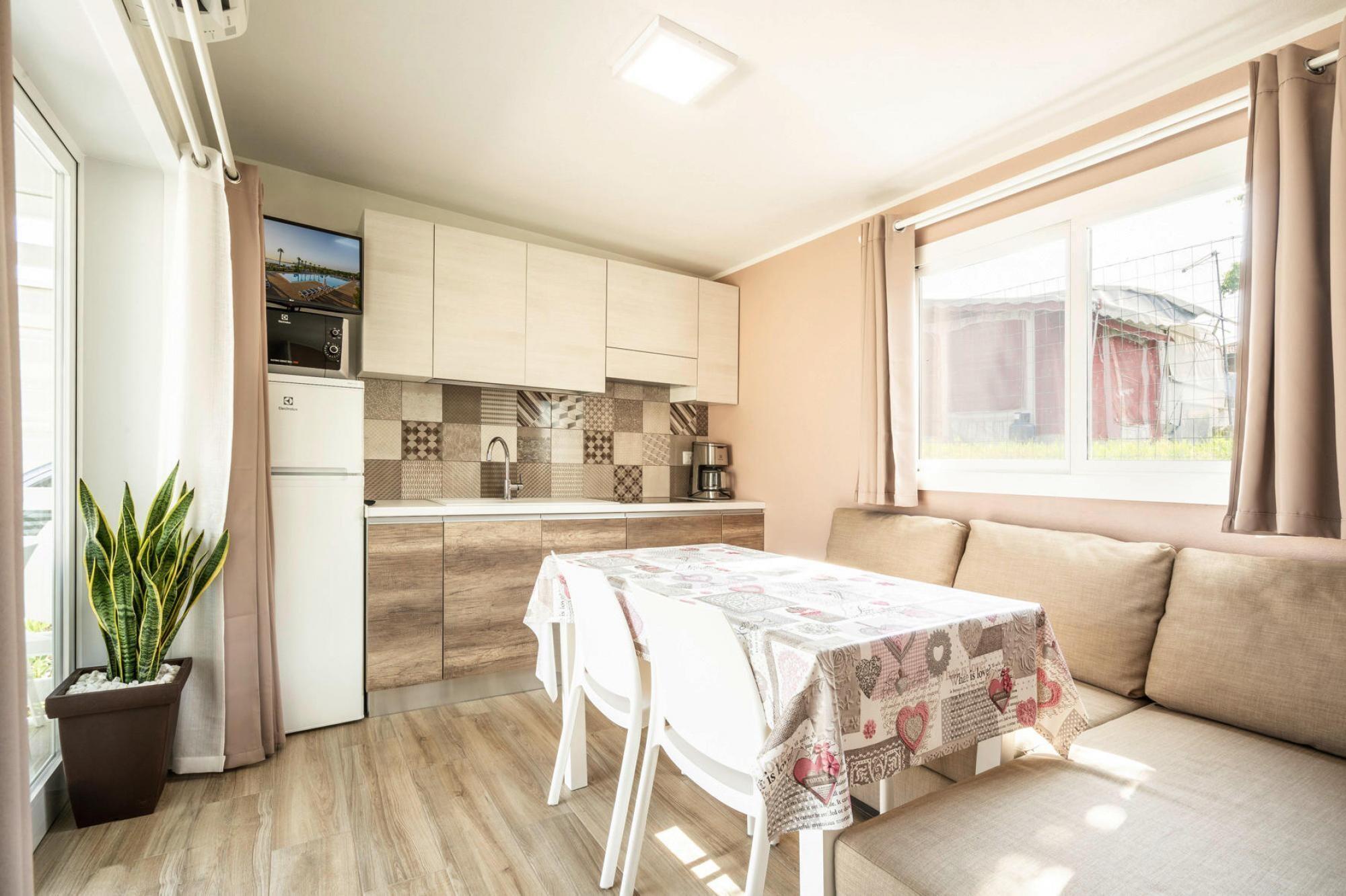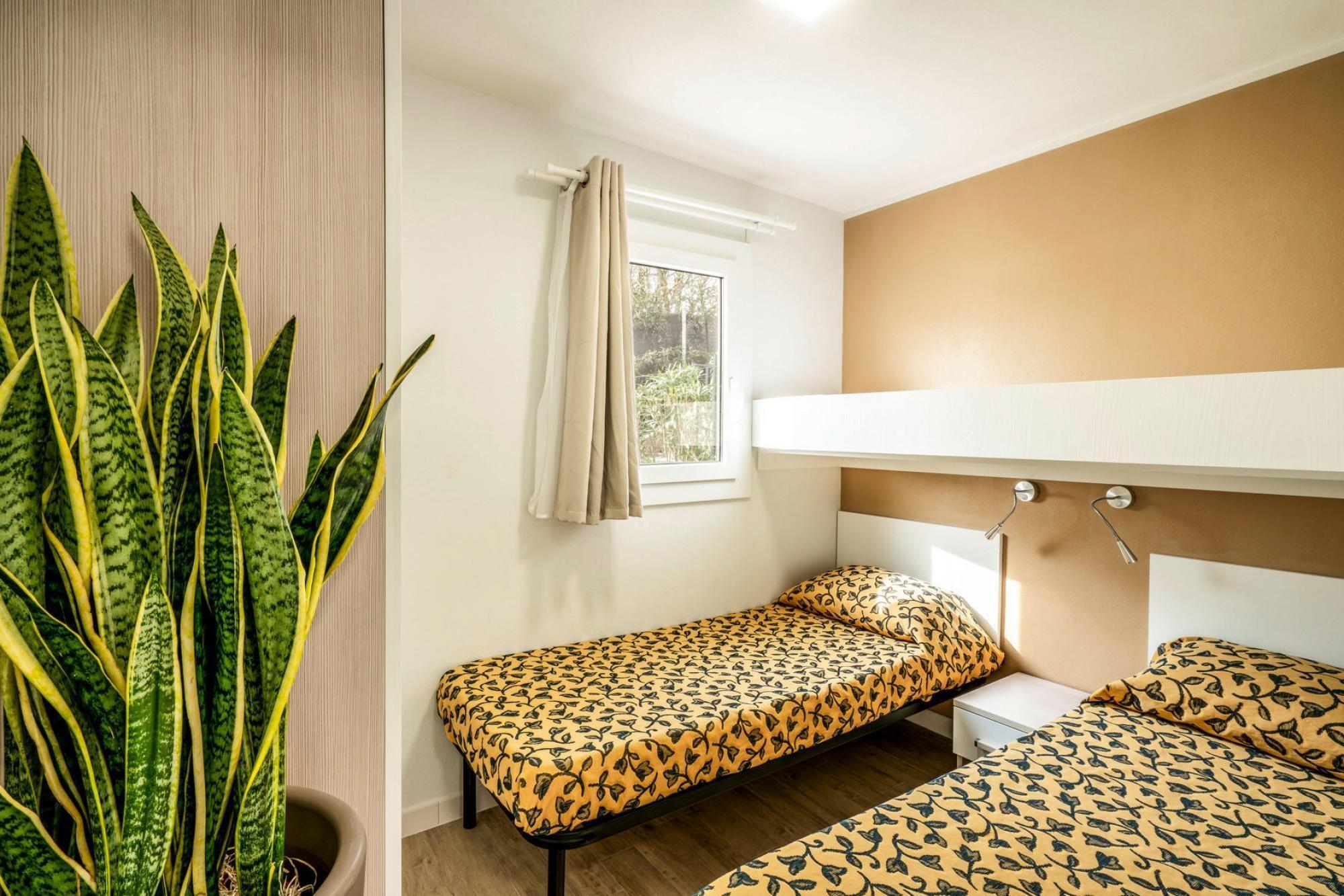 Wohnzimmer(Schlafcouch 1 Pers., TV(Satellit), Sitzecke), Kochnische(Esstisch, Herd, Kochplatte(4 Kochplatten, elektrisch), Kaffeemaschine, Mikrowelle, Kühlschrank), Schlafzimmer(Doppelbett), Schlafzimmer(Einzelbett, Einzelbett, Einzelbett), Badezimmer(Dusche, Toilette), Kiosk, Rezeption, Internet, Tischtennis, Fahrradverleih, Restaurant, Bar, Waschmaschine(Gemeinschaftliche Nutzung mit anderen Gästen, gegen Gebühr), Balkon oder Terrasse, Klimaanlage, Gartenmöbel, Liegen, Parkplatz, Sonnenschirm, Pool(Gemeinschaftliche Nutzung mit anderen Gästen, im Garten, Seperates Kinderschwimmbad (Tiefe 50 cm), 7 x 7 m., geöffnet von Apr bis einschließlich Sep)